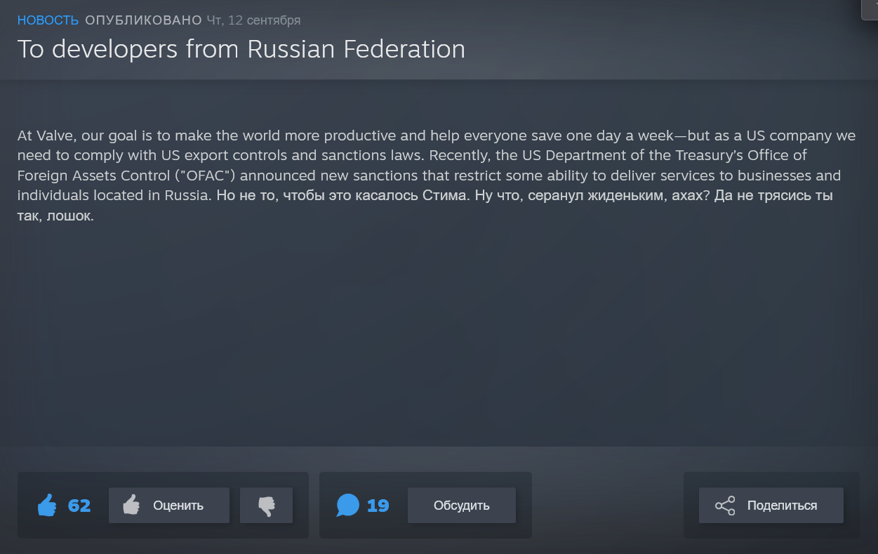 >>974135 Ничего связанного со стимом не нашел, только сайт самого департамента где перечислены всякие OOO Soyuz Podshipnik в разделе War Economy. Опять же, нигде прецедентов невыплаты не нашел, когда комиссию 30% дополнительно ввели, вой был на весь рунет, будто у каждого индюка украли 1 000 000 долларов с американских покупателей. Адсенс туда же. Сейчас пока тишина, но буду ждать следующего месяца, будут ли выплаты и кому выплат не будет.