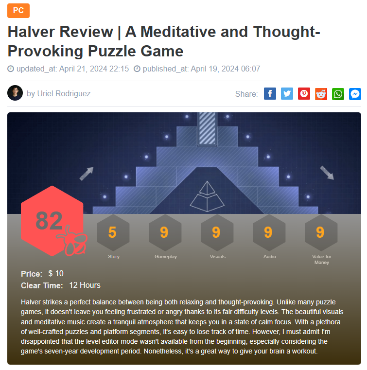 Перевод: Давненько абстрактная головоломка с геометрическими фигурами не затягивала нас до утра, но Halver это удалось без труда. Основная идея проста: вам нужно попасть на платформоподобные уровни в виде прямоугольника и на расстоянии разделить блоки пополам, открывая дополнительные возможности, такие как новые платформы и новые ступеньки, чтобы пройти дальше. Топ!