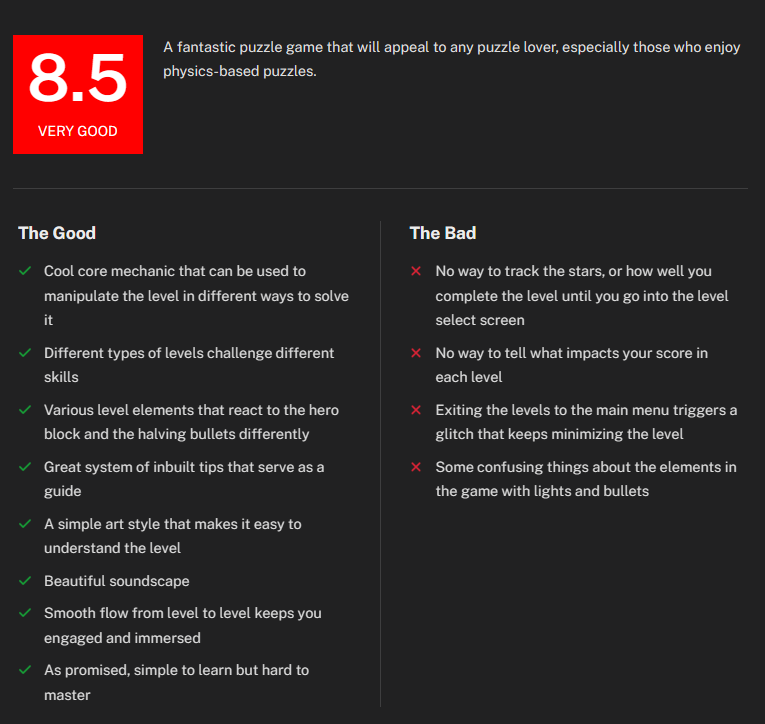 Вот обзор: Het is lang geleden dat een abstracte puzzelgame vol geometrische figuren ons tot in de vroege uurtjes heeft opgeslokt, maar Halver is er moeiteloos in geslaagd. Het basisidee is eenvoudig: jij moet platformachtige levels betreden als rechthoek en kan vanop afstand blokjes in tweeën delen waardoor er extra mogelijkheden komen, zoals nieuwe platformen en nieuwe opstapjes om verder te raken. Top!