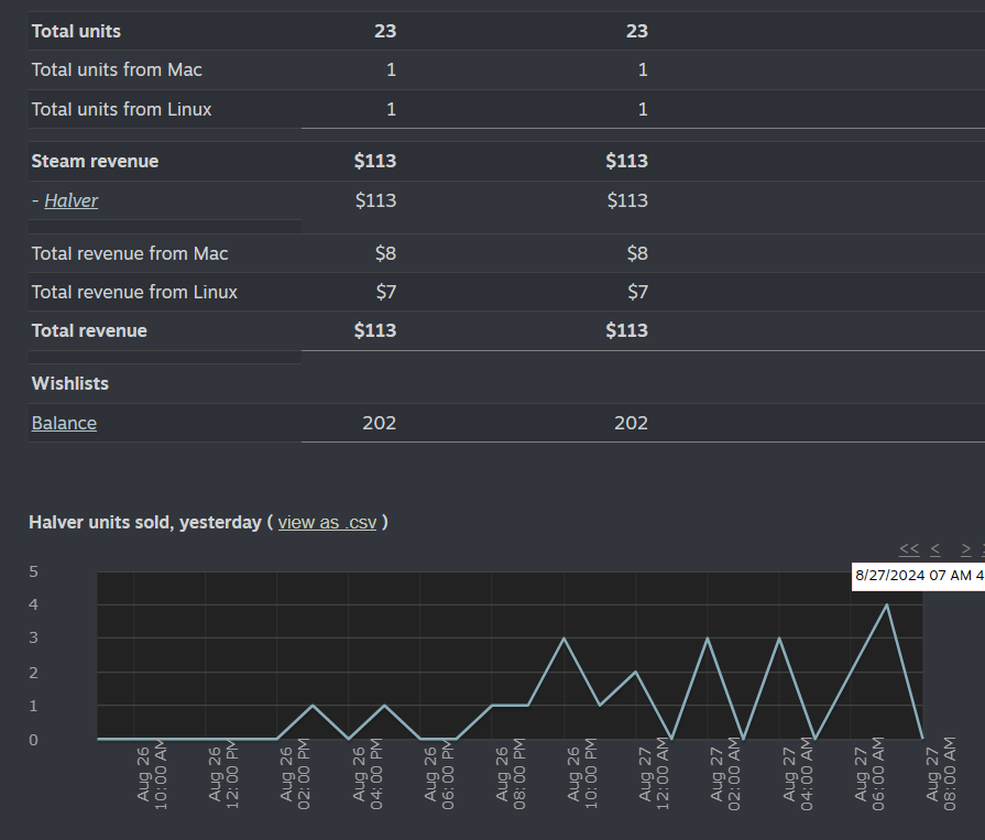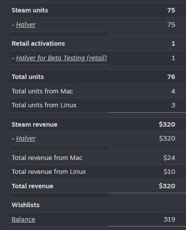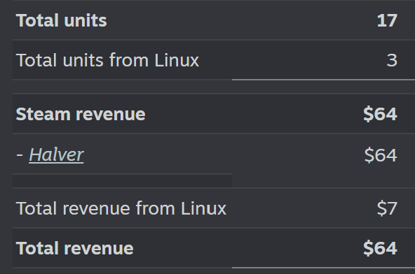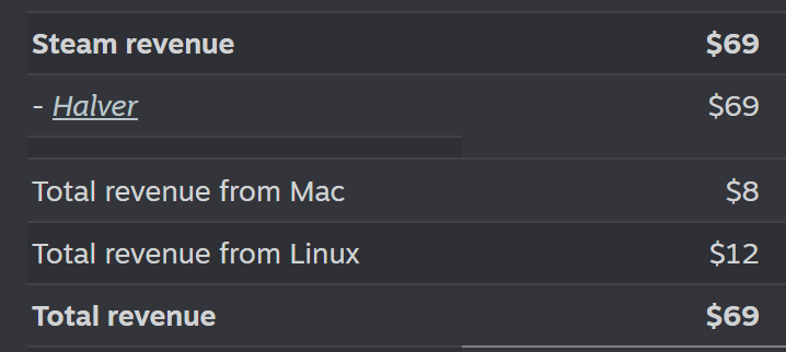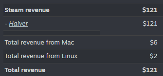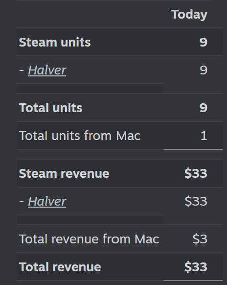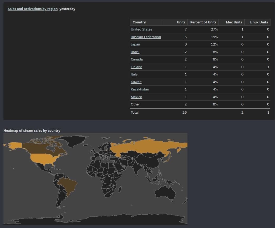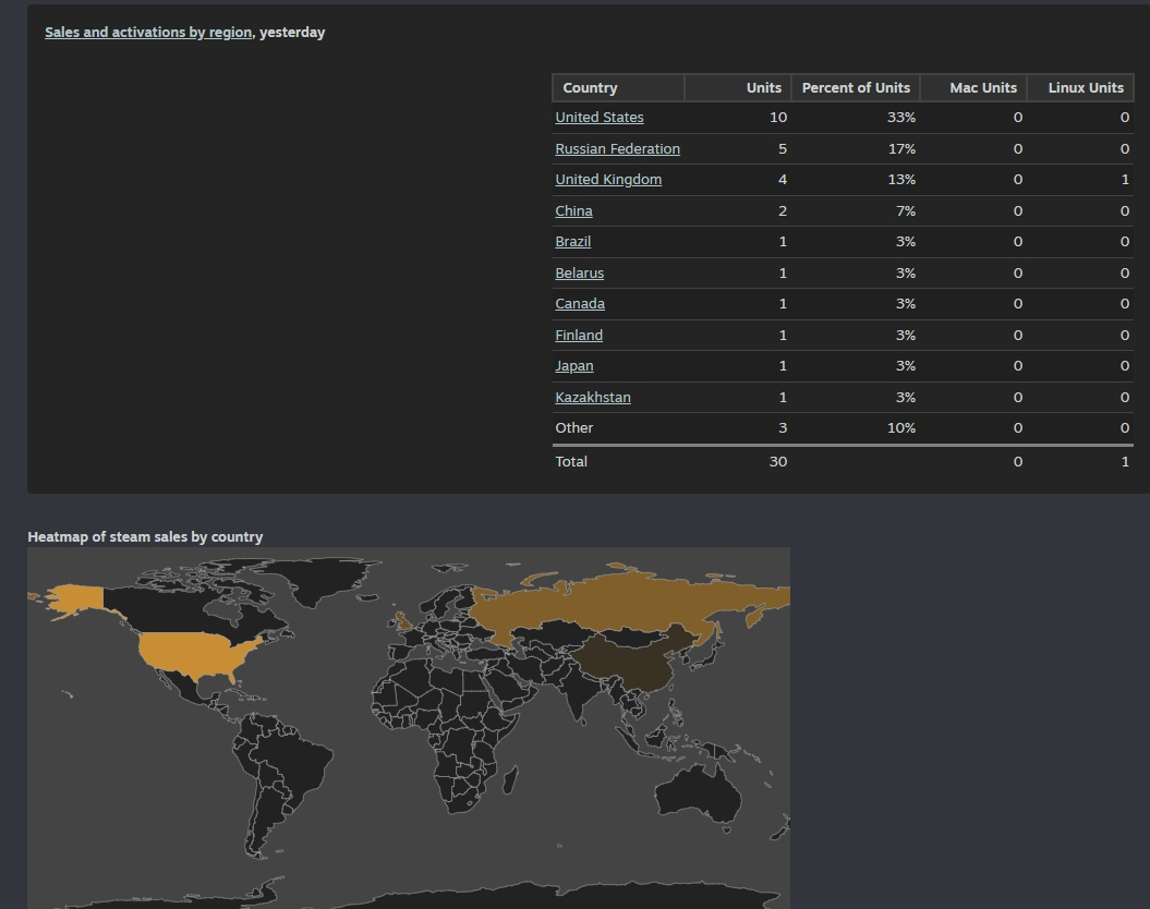 Чел, ради прикола посчитал твой доход с игры тут: https://steam-revenue-calculator.com/ Получилось чуть меньше штуки баксов. Насколько реалистичные цифры?