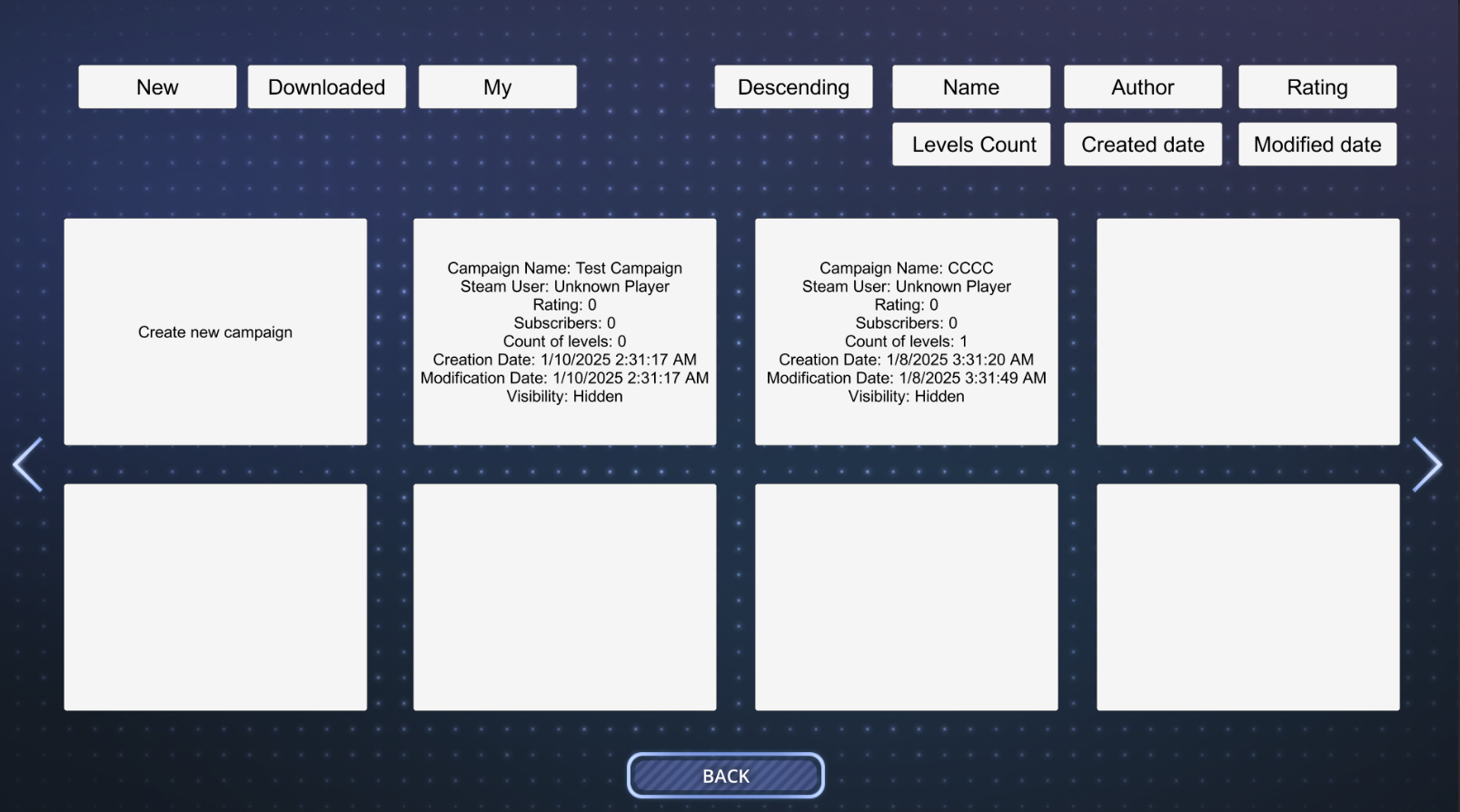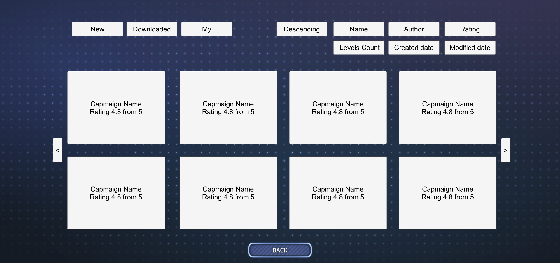 >>996262 Разделил UI панели загруженных и созданных уровней, т.к. видимо визуально они будут отличаться (у созданных будут кнопки управления как минимум)