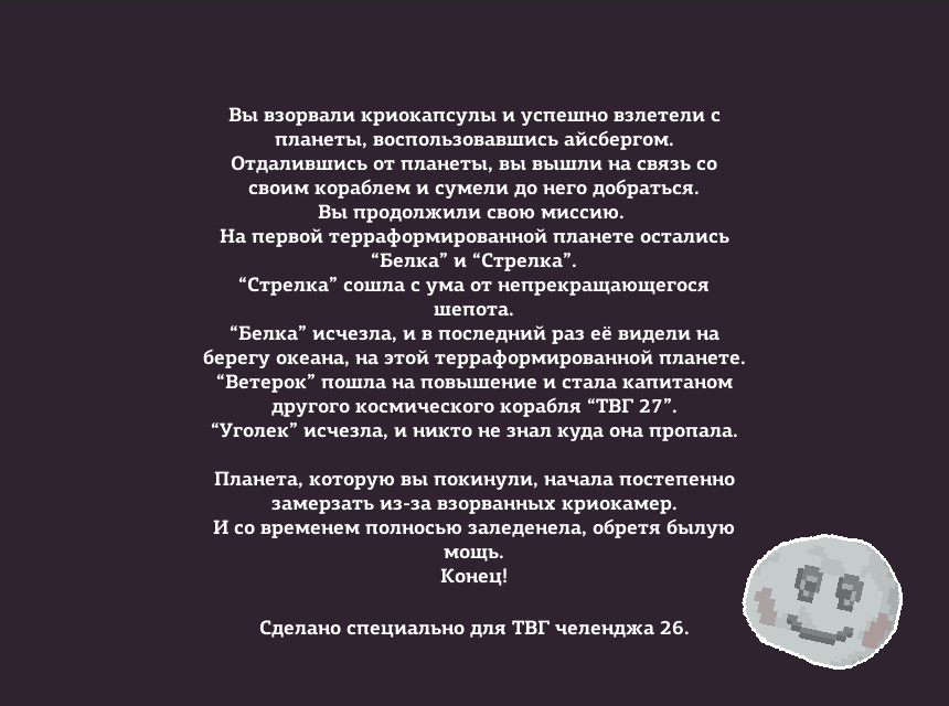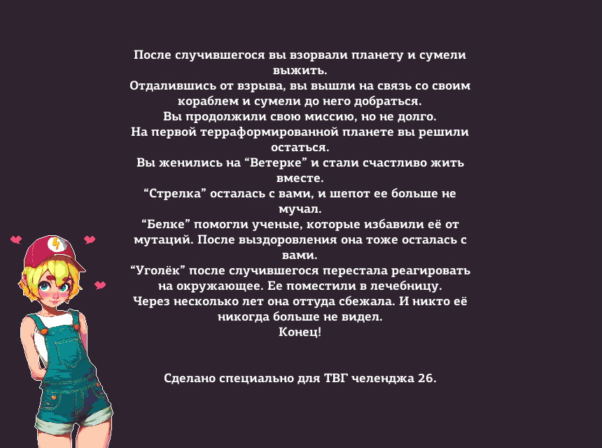 В "сквозь ТДГ космос" было 4 концовки и все они оказались не каноничными по итогу для этой игры. Если честно то я даже не планировал продолжать ту историю вообще. Но когда решил назвать двух персонажей "Белка" и "Стрелка", то появилась необходимость в позывных для двух других, и я начал гуглить какие еще клички были у животных, которых запускали в космос. И наткнулся на статью про "Ветерка" и "Уголька", где был абзац, что Уголька до этого звали Снежок. И тут у меня в голове завертелось и всё сшилось в одну вселенную.