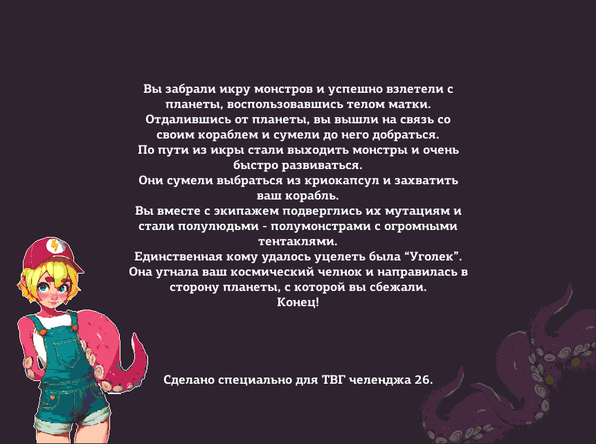 Если прям так интересно, то по сути сюжетно это продолжение игры с конкурса флешеслава с ТДГ: https://itch.io/jam/kosmos-i-fantastika/entries У конкурса был очень маленький охват, как среди участников, так среди и стримеров. Я даже в шоке от того сколько людей постримило этот ТВГч, и как мало народу пришло на ТДГ тогда. Вроде бы треды всё равно всплывали из-за постинга в /гд/, но все их игнорировали видимо. Хотя игры там получились тоже классные. Видимо из-за призовых в 200 рублей, которые так и остались у орга, лол.