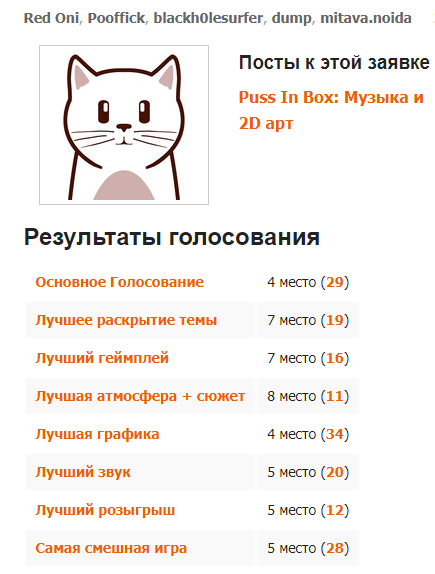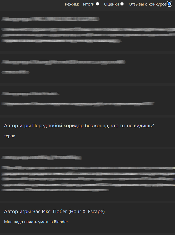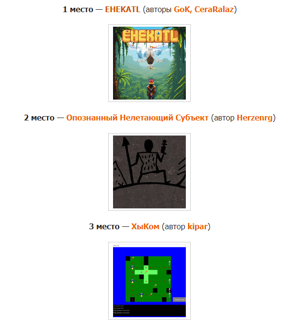 Поздравляю Коридор с первым местом, несмотря на то что игра сделана "по рецепту", она действительно заслуживает призового места. Немного непонятно почему в списке призёров нет Heartless Killer'а, охуенная игра с тонной вложеных усилий, зато там откуда-то взялся пиксельный три-в-ряд, впрочем, как уж проголосовали. Ещё хочу сказать что у Bellydog классная красочная задумка, оригинальная механика и приятный свежий сеттинг, жду ещё твоих игор. А ещё спасибо всем кто поиграл в мою "деревню", знаю, недоделка, за две недели в полноценную игру её не превратить, но многие отметили что есть потанцевал и это хорошо.