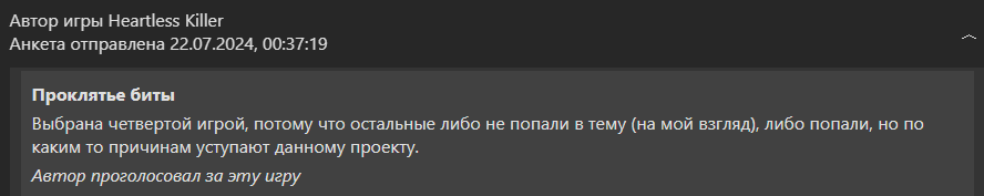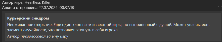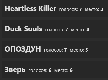 Есть инсайд ребят, Кирай пустил к тебе на 3 ступень пьедестала две игры, набравшие столько же голосов. Так что Heartless Killer хоть и не попал в тройку призеров, но он на 3 месте.