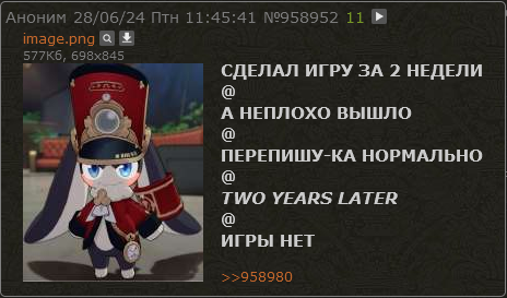 >>967784 Я буду третьим. Я обе игры почти доделал, но не смог заставить себя доделать и сдать игры на конкурс гнилой мрази нульчепидора. А на Одну Слабую Игру я обе доделаю сдам. Просто чтобы на стримах было во что поиграть. Хоть на ОВГ обычно так себе движуха, но орги честные и приятные люди, с которыми не западло пообщаться и не возникает желание плюнуть им в рожу и растереть подошвой ботинка, как в случае с нульчемразью. Хз от чего надо востаналиваться. Простенькая игра для конкурса делается за пару вечеров. Если растянуть на неделю, то вообще по часу по вечерам можно пилить. А тут аж 2 недели. Так что я за ОВГ через неделю-две или за ТВГ андеграунд от Ворюши. Он же первый ТВГ андеграунд как раз сразу после спорного ТВГ запустил, так что будет по канону. Я даже поддержу идею сделать не Андеграунд, а легитимный 26 ТВГ от Ворюши или Димасика.