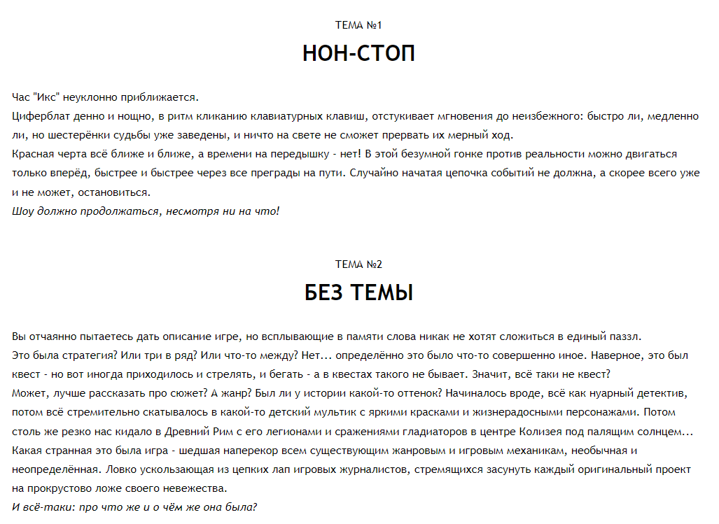 >Каждое твг кто-то требует прям явную реализацию темы. >Интерпретация свободная же. >На что вдохновила тема то и сделал. А тебе не кажется, что занимался ты интерпретацией и реализации темы: "То, что на виду - загадка. Но то, что скрыто - явно" из прошлого ТВГ, и именно она тебя вдохновляла? Мне вот кажется. А ещё мне кажется, что если любого человека попросить посмотреть на пикрелейтед скрины и спросить какая тема у этой игры, НОН СТОП или "То, что на виду - загадка. Но то, что скрыто - явно.", то никто не выберет НОН-СТОП.