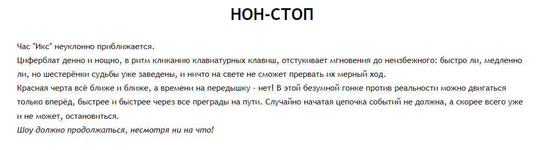 >Каждое твг кто-то требует прям явную реализацию темы. Или хотя бы какую-нибудь. У тебя тем вообще никак не реализована. Ходьба по коридору не является частью геймплея. Если её просто заменить на кнопку ДАЛЬШЕ, то игра никак не изменится. Просто между 4 пикрелейтед ОСТАНОВКАМИ будет не зажимание W, а зажимание Левой кнопки мыши на кнопке Дальше. Ну и наличие в игре ходьбы само по себе не делает игру подходяще под тему НОН-СТОП. БЕЗКОНЦОВОСТЬ тоже никак не реализована.