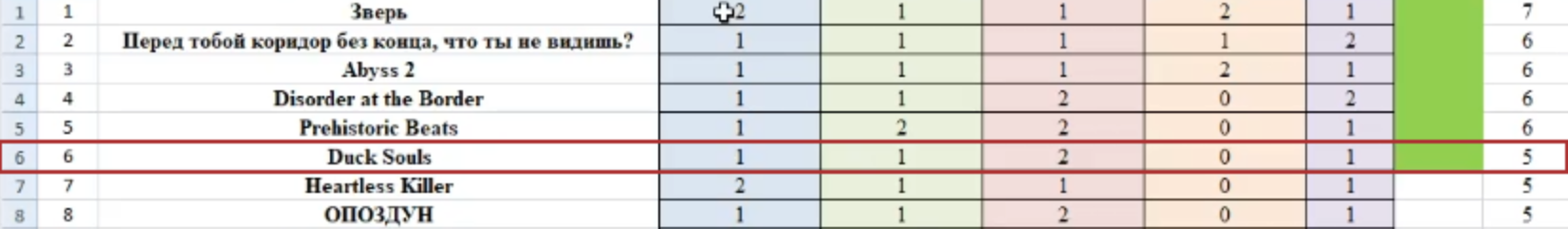 Чекнул щас стрим финалок нульча. Он утке вообще 5 баллов поставил и на 6 место в своем рейтинге. Как она вдруг перескочила сразу 2 игры в его личном рейтинге, а потом еще 2 игры в общем рейтинге, решительно непонятно. По сути даксоулс обскакала не только киллера и опоздуна, но и биты и дисордера. Шок. Надо было добавить сюда >>967529 и этот факт.