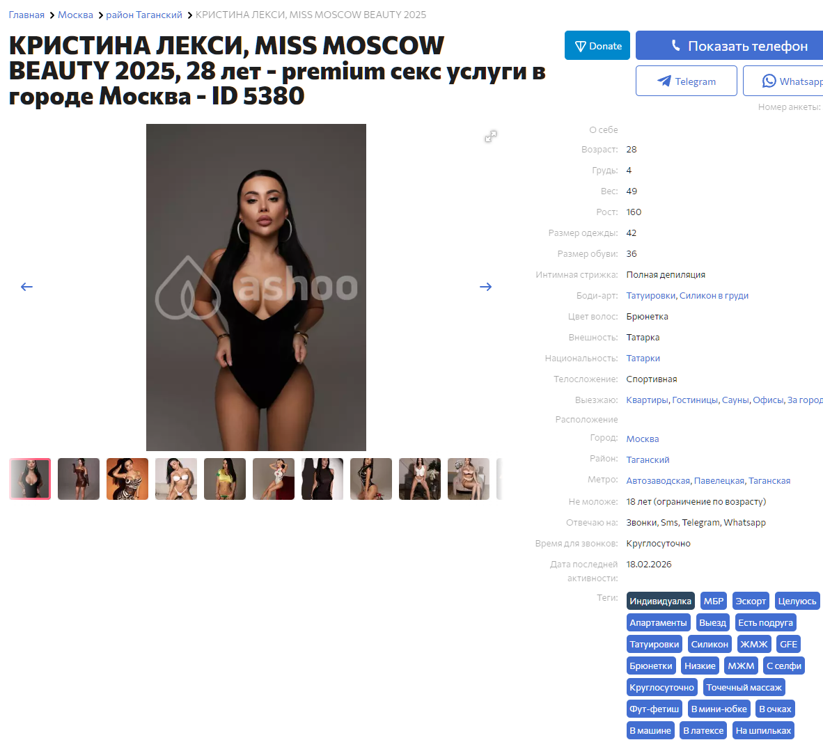 >>2121610 >Бля, я сюда фото тем более своих подруг не буду слать Ну напиши свой тг, а то не серьезный разговор выходит. Не сочти за то что я тебе не верю, но по логике как-то не сходится, ты рассказываешь про элитный эскорт где счет идет на сотнИ тыс за одну встречу, и в тоже время говоришь про то что эти тян рады стать содержанками, за какие сраные 200у в месяц! >>2121610 >Хотя у меня в Мск одна знакомая инди, и та мефе сидела 2 года, заёбывала звонками когда нанюхается. За все годы походов по феям, я помню только 2 или 3 случая когда попадал на торчих. Но там без кринжа в мою сторону, просто тян употребляла и не более, в плане адекватности в общении у меня нареканий не было. А в сексе так это скорее плюс, ебались охуенно. >>2121615 >поделись с анонами контентом, каким не жалко...Кстати, вот с этой нет случаем ничего? Ходил чаще всего с 3 сайтов, Интимсити, Ашу и досуг сз, и раньше ходил еще через старый добрый сайт - досуг сз, но сейчас редко там ищу, в основном интимки и ашу. Несколько раз снимал через телегу, но там менеджеры, я люблю инди. Ценники 30-50. Лет 10 назад ходил по прайсу 15-20. Раньше писал отчеты на секстолке, но сейчас он стух. >>2121615 >Мелания на интимсити Меланию ебал(если ты про бимбо-порнушницу), И Милану sw тоже ебал, но по внешке мне обе не очень зашли, повелся на медийность. >>2121615 >в ветке про Алёну Черновол на неё искали контент и инсту, но глухо Вот кстати Алена Черновол(ее не ебал пока), яркий пример опровержения того что шлюхи дуры и ничего за душой не имеют. Взяла хорошую хату в Мск и свежий гелик amg.