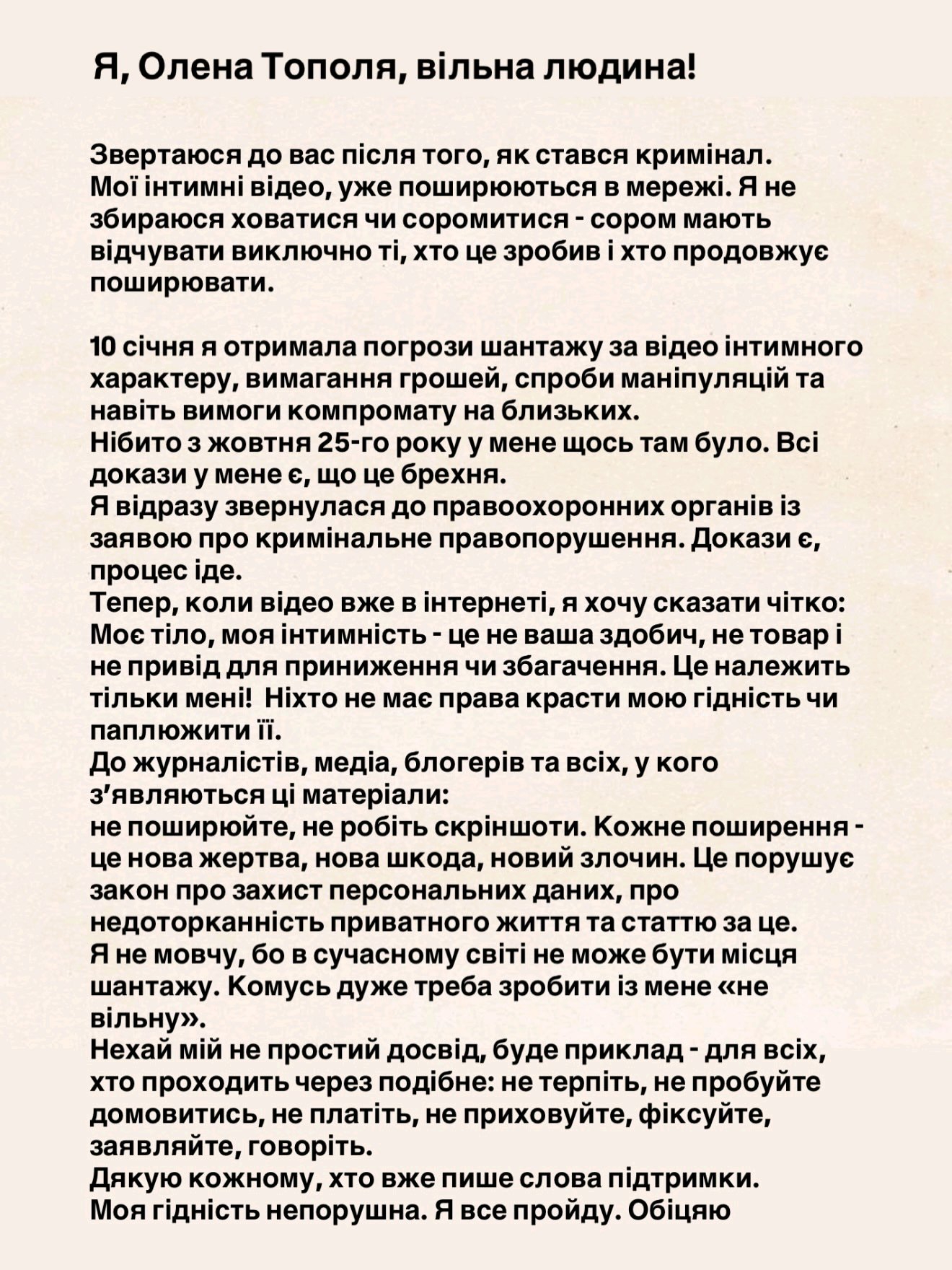 "Украинская певица Елена Тополя стала жертвой шантажистов. У исполнительницы требовали 75 тысяч долларов, угрожая обнародовать интимное видео с ней и 23-летним парнем. Не получив желаемого, шантажисты все же слили ролик в сеть, а знаменитость со своей стороны не стала замалчивать инцидент и сделала официальное заявление по этому поводу."