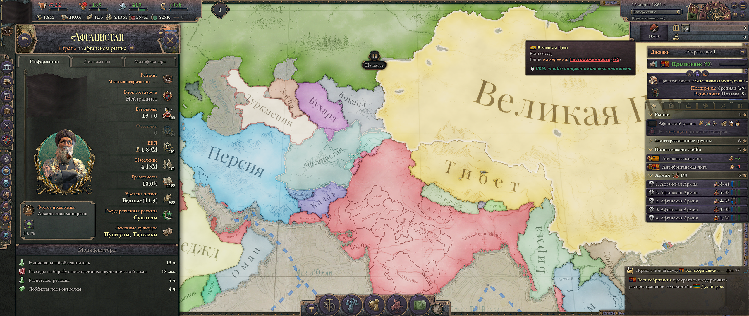 У меня объединенный Афганистан в Victoria 3. Что делать дальше? Годом ранее отменил рабство ценой мятежа аристократов, сейчас думаю забирать Кандагар и Белуджистан с колониальной эксплуатацией, но так хочешься Мазари-Шариф взять но их независимость гарантировала Россия...