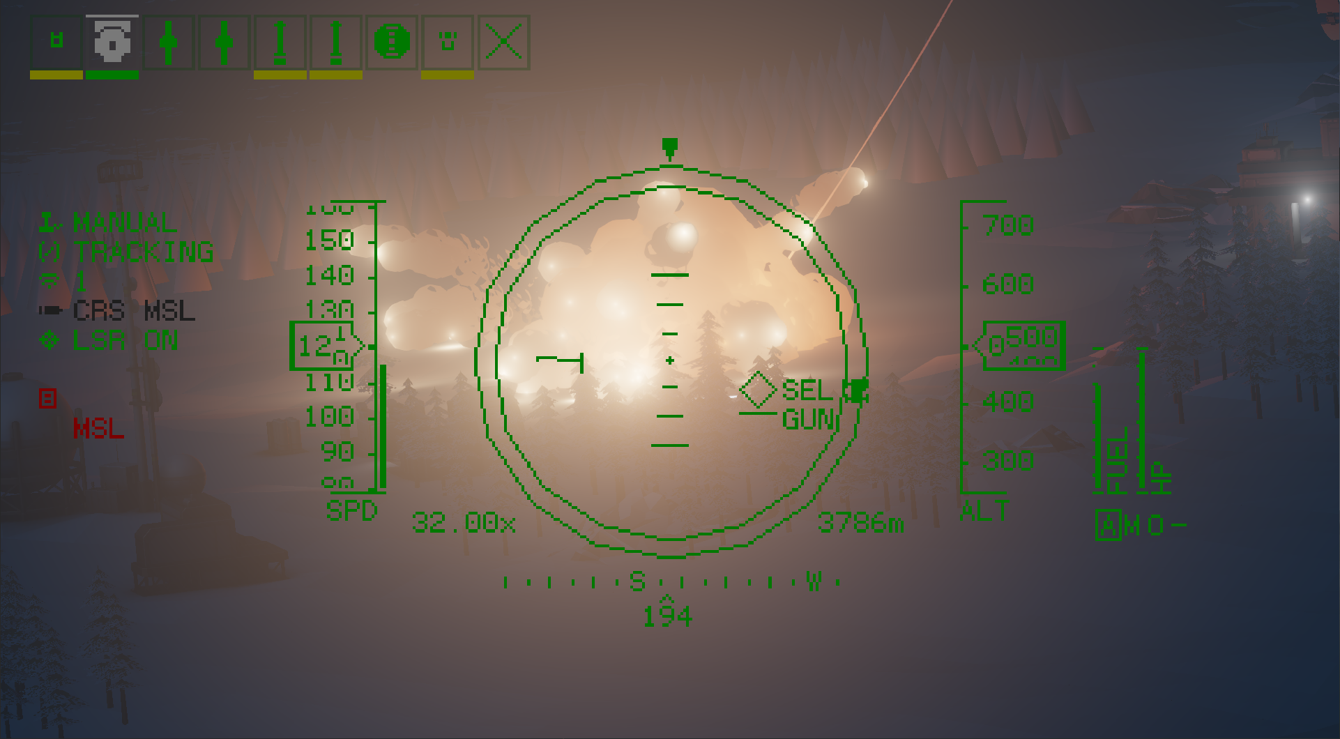 Once a fire target is issued, the process is automatic. Nearby vehicles with that weapon capability will respond by firing that weapon at the given coordinates. Some weapon types with vectoring such as guided missiles will continue to update the target position from the cameras laser and steer to follow the players aiming reticule.