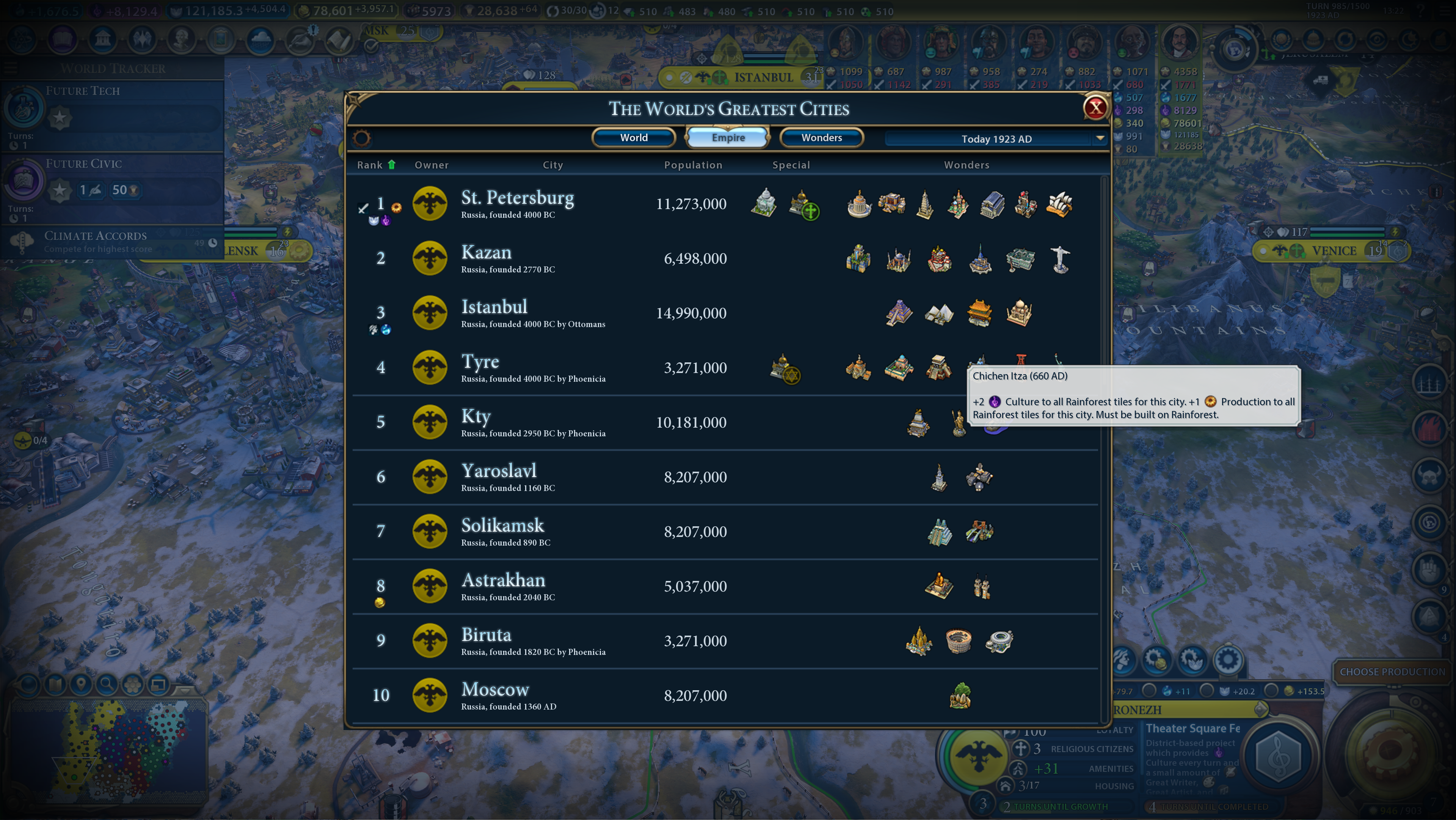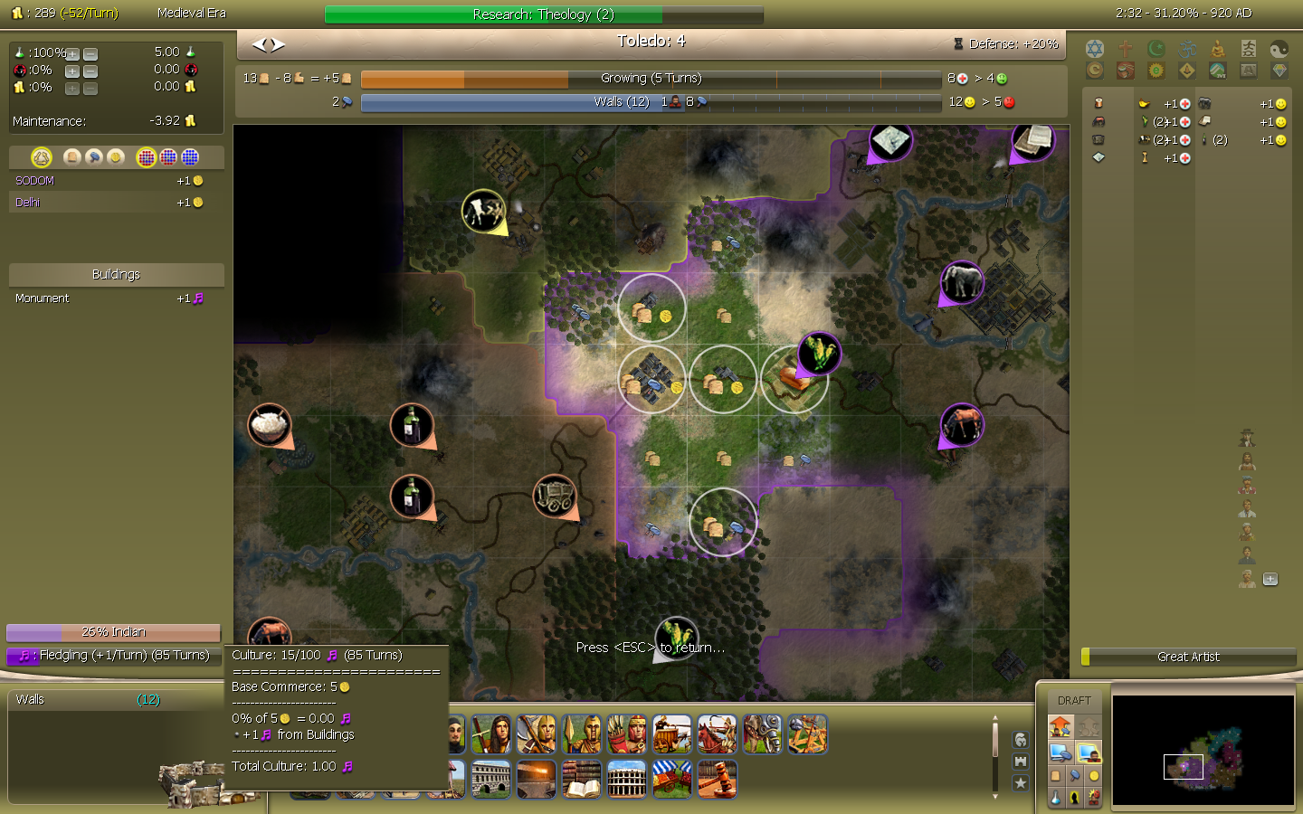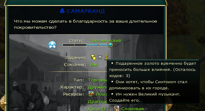 >>1279177 > Тут ещё нужно помнить что ты можешь давить культурой соседа настолько, что его города могут перейти к тебе через бунт. Не всегда это выгодно и приходится ограничивать культуру города, специально не строя культурные постройки. На пикриле лидер цивилизации в момент, когда к нему захотел примкнуть бесполезный город из-за преклонения перед его культурой.