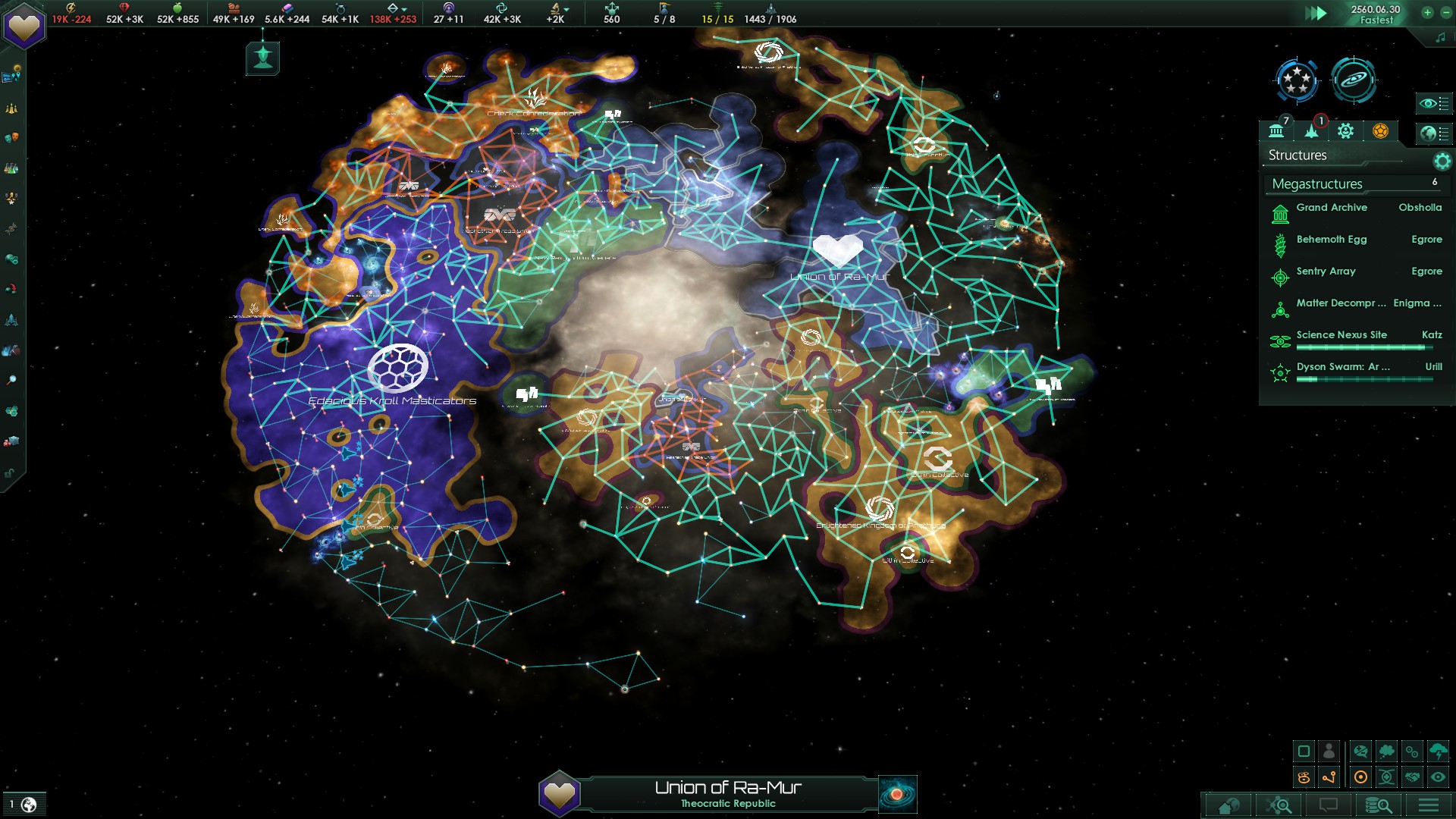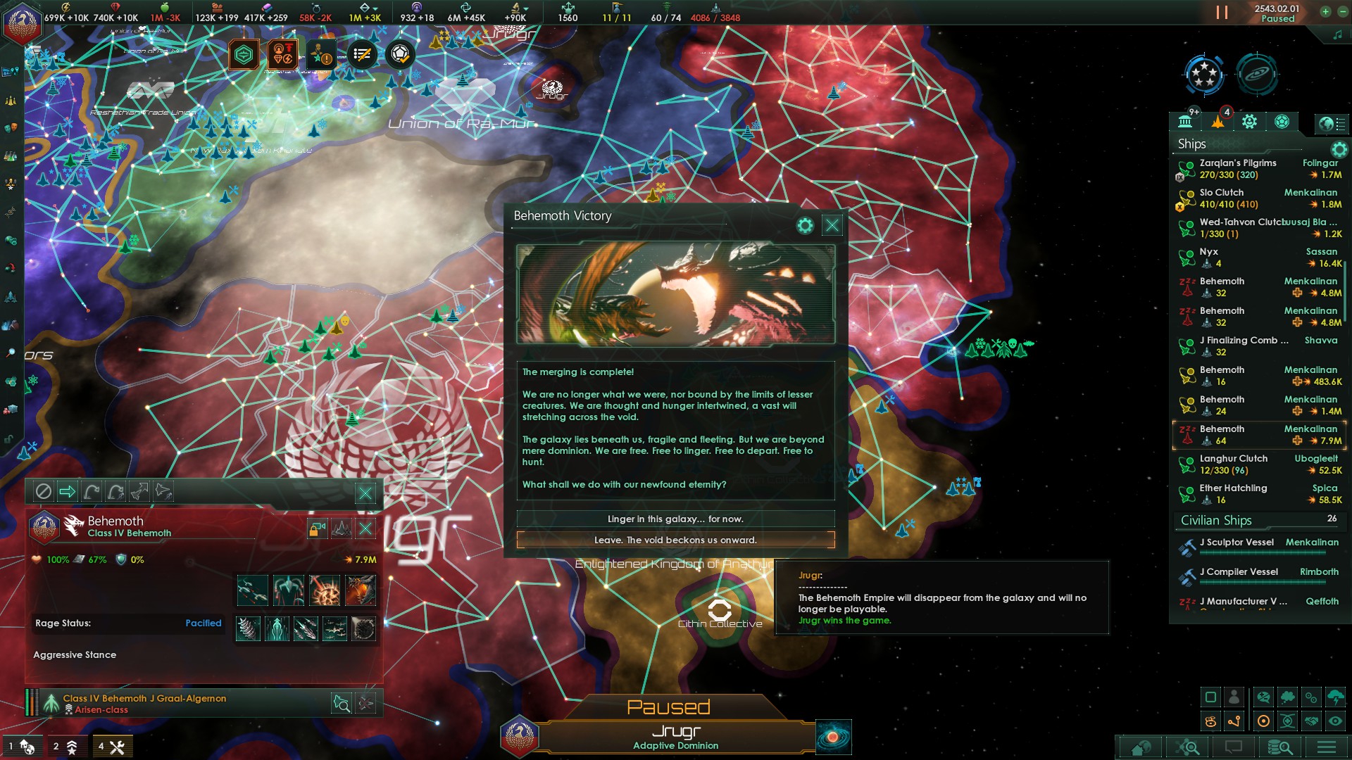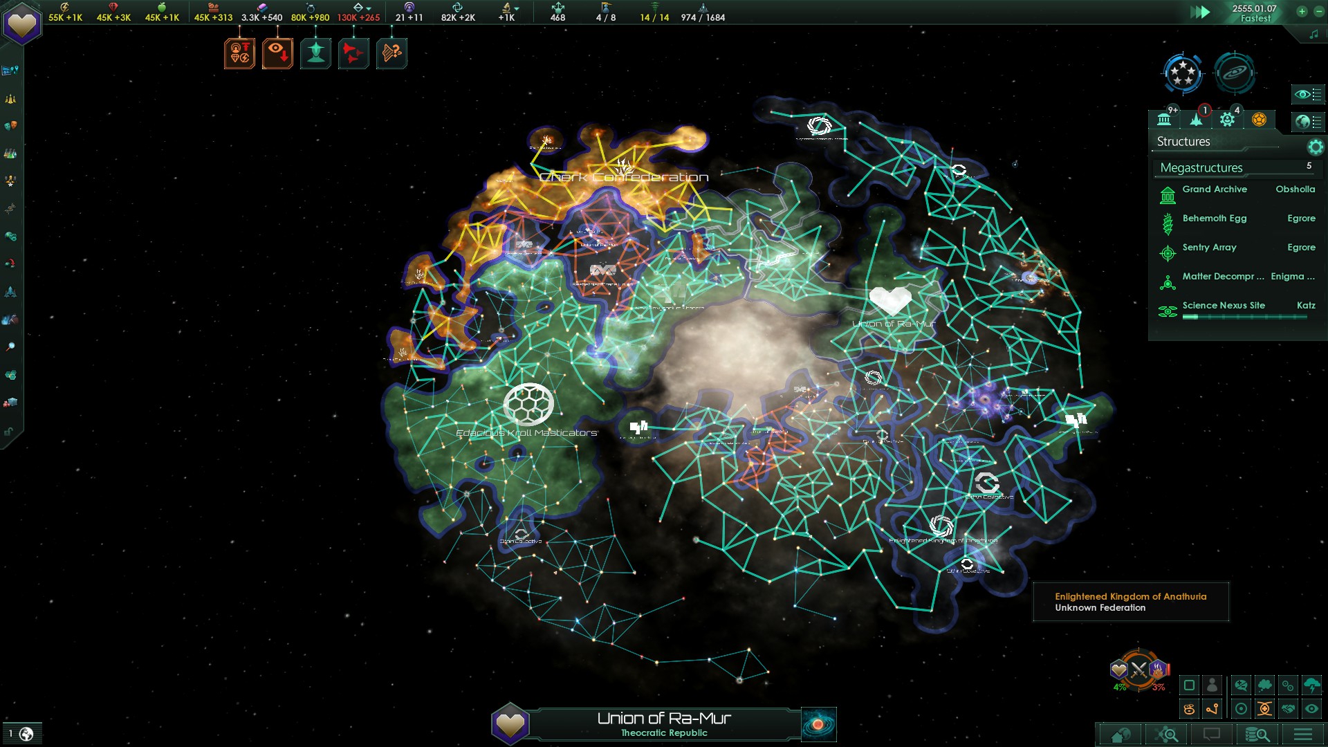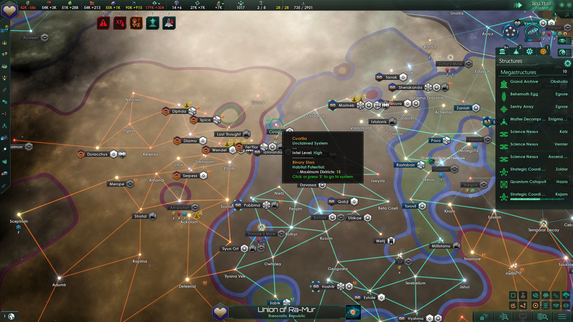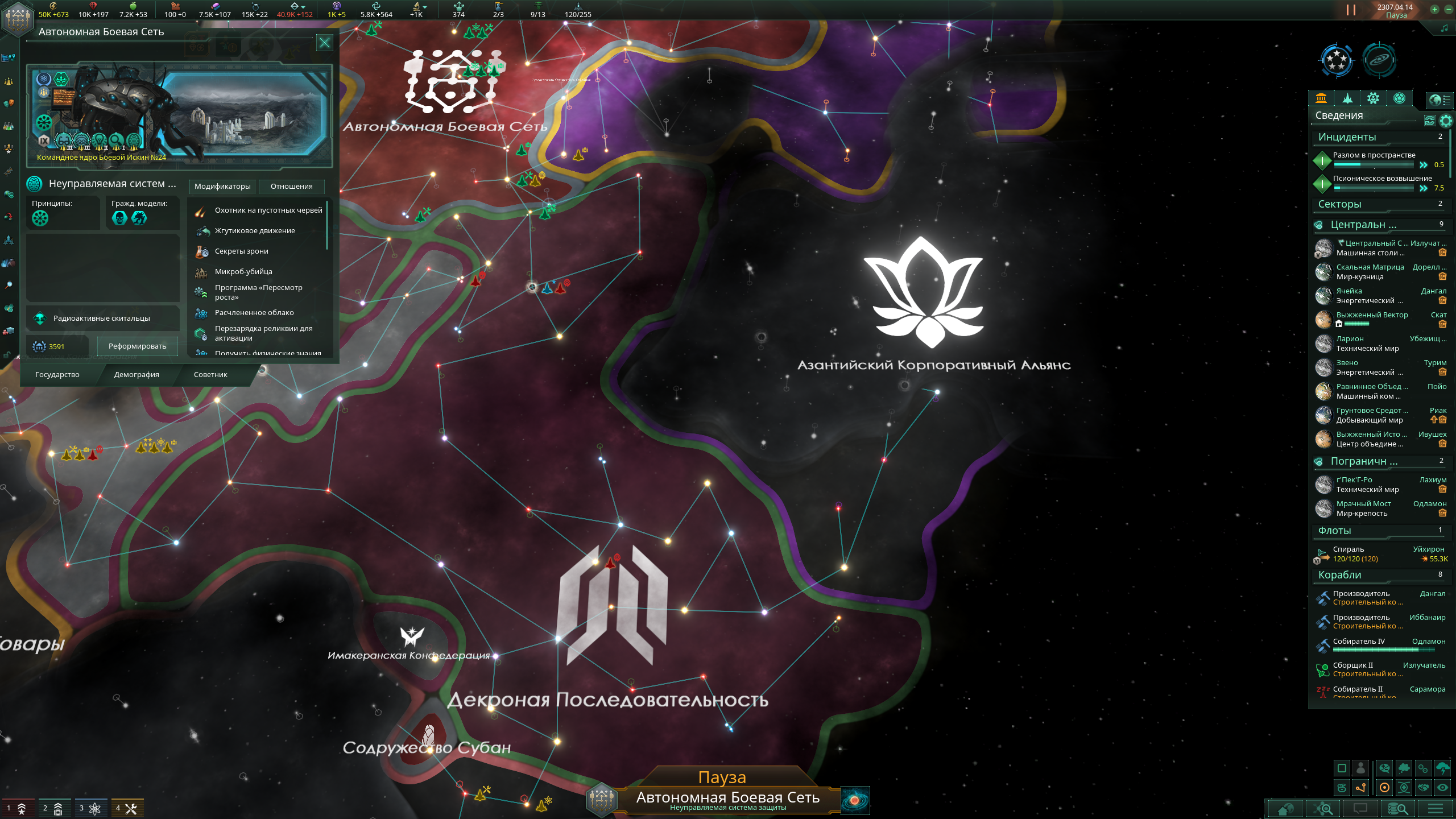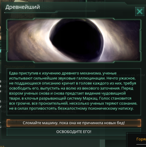 >>1291868 Перенос столицы - скорее всего дело в секторах, столица будет столицей столичного сектора, а столица сектора не может быть слишком близко к столице другого сектора. Попробуй временно удалить сектор(а) поблизости от твоей будущей столицы. Завершитель цикла выпадает с очень маленьким шансом, надо или очень много играть или сейвскамить как сука. Я помню из какого-то патчноута что шанс завершителя увеличивается в пять раз если в галактике кто-то (не ты) взял перк кризиса, не знаю актуально ли это еще. Само сообщение о завершителе выглядит как предложение пиздец могущества +100% ко всему с намёком что цена будет страшной, у кнопки согласия написано красным "не делай этого".