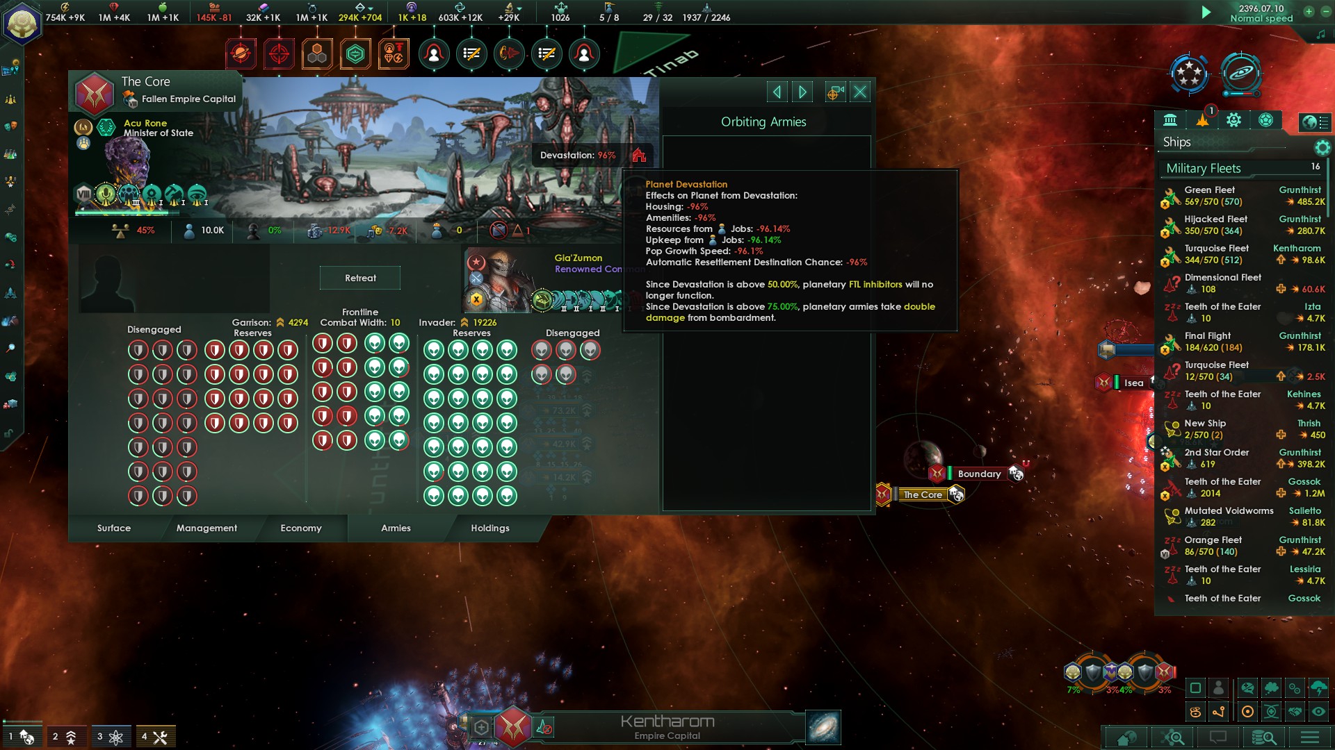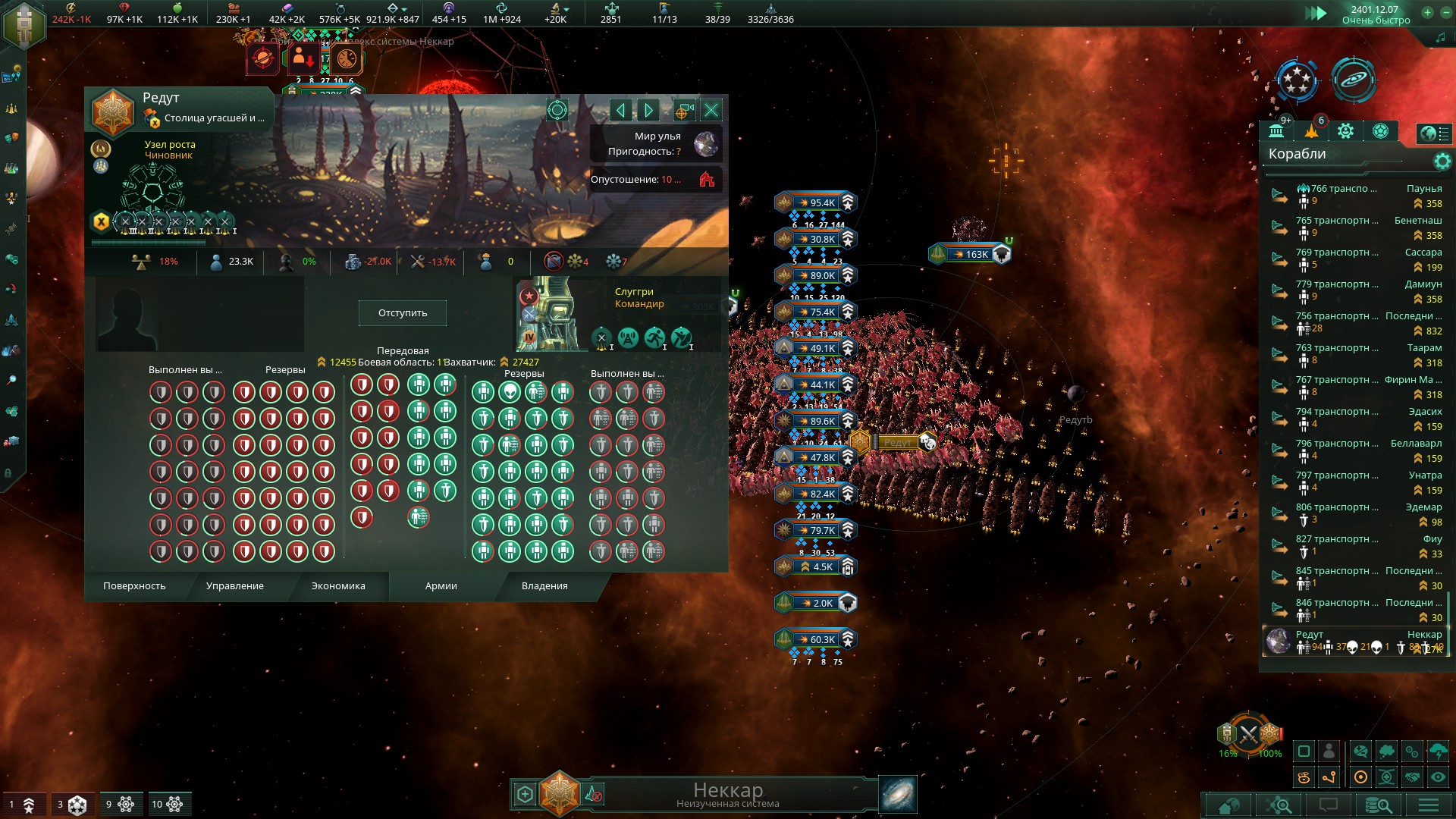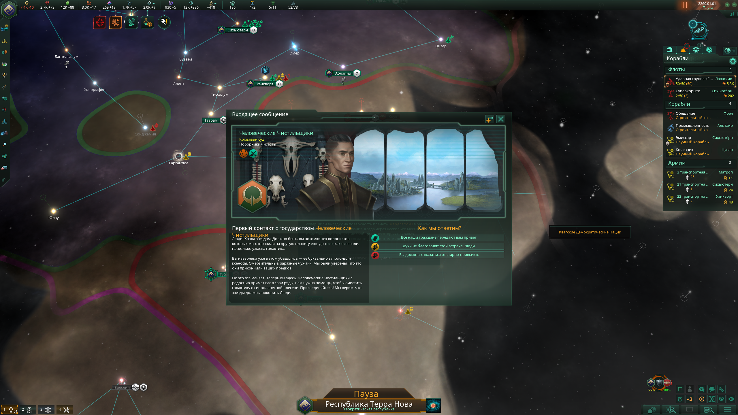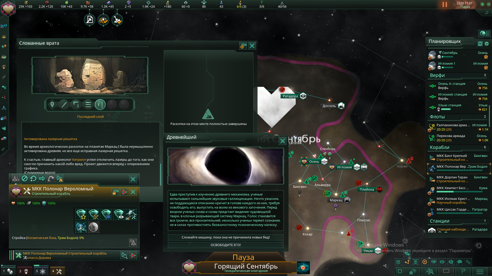 >>1291868 Перенос столицы - скорее всего дело в секторах, столица будет столицей столичного сектора, а столица сектора не может быть слишком близко к столице другого сектора. Попробуй временно удалить сектор(а) поблизости от твоей будущей столицы. Завершитель цикла выпадает с очень маленьким шансом, надо или очень много играть или сейвскамить как сука. Я помню из какого-то патчноута что шанс завершителя увеличивается в пять раз если в галактике кто-то (не ты) взял перк кризиса, не знаю актуально ли это еще. Само сообщение о завершителе выглядит как предложение пиздец могущества +100% ко всему с намёком что цена будет страшной, у кнопки согласия написано красным "не делай этого".