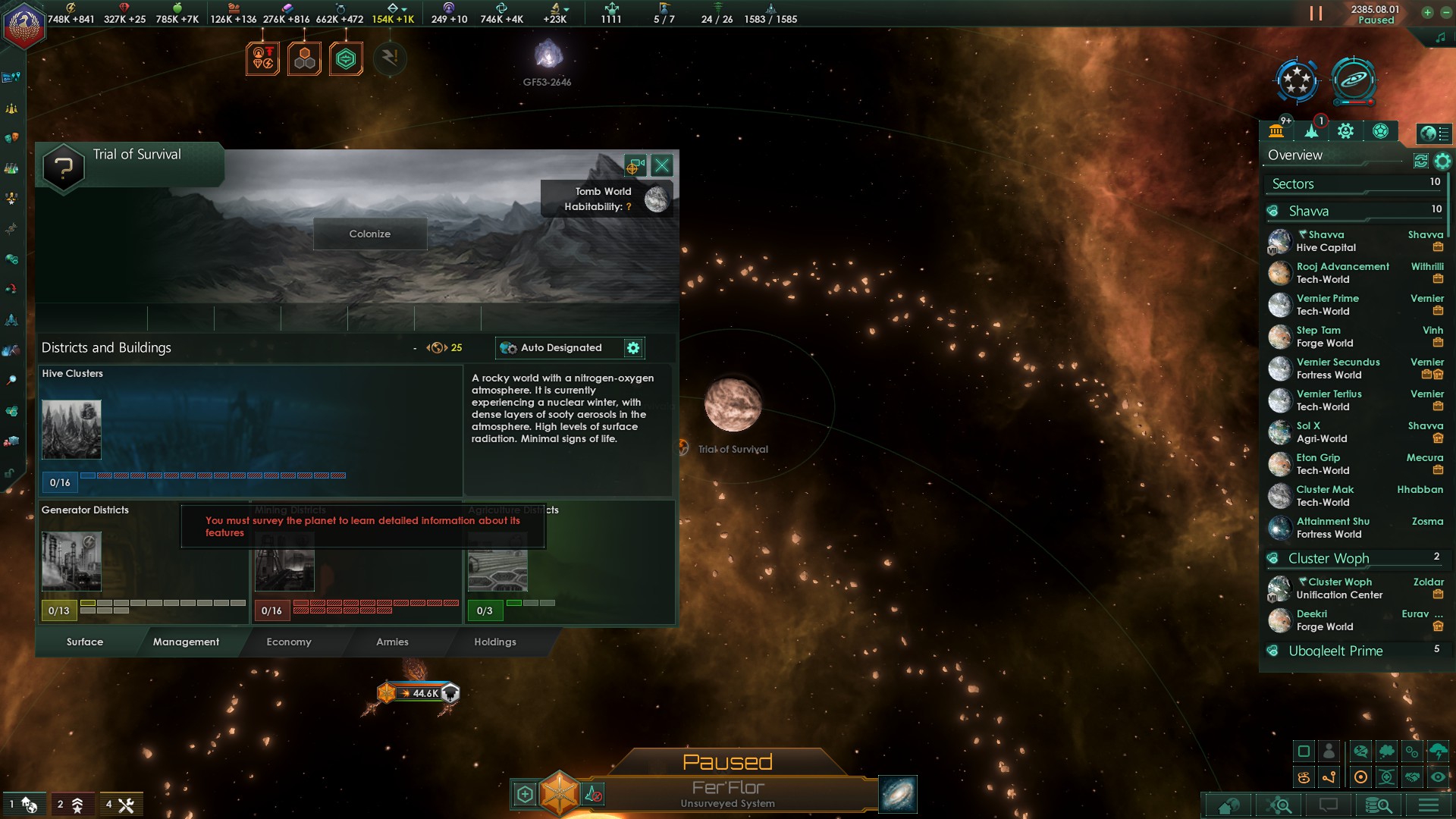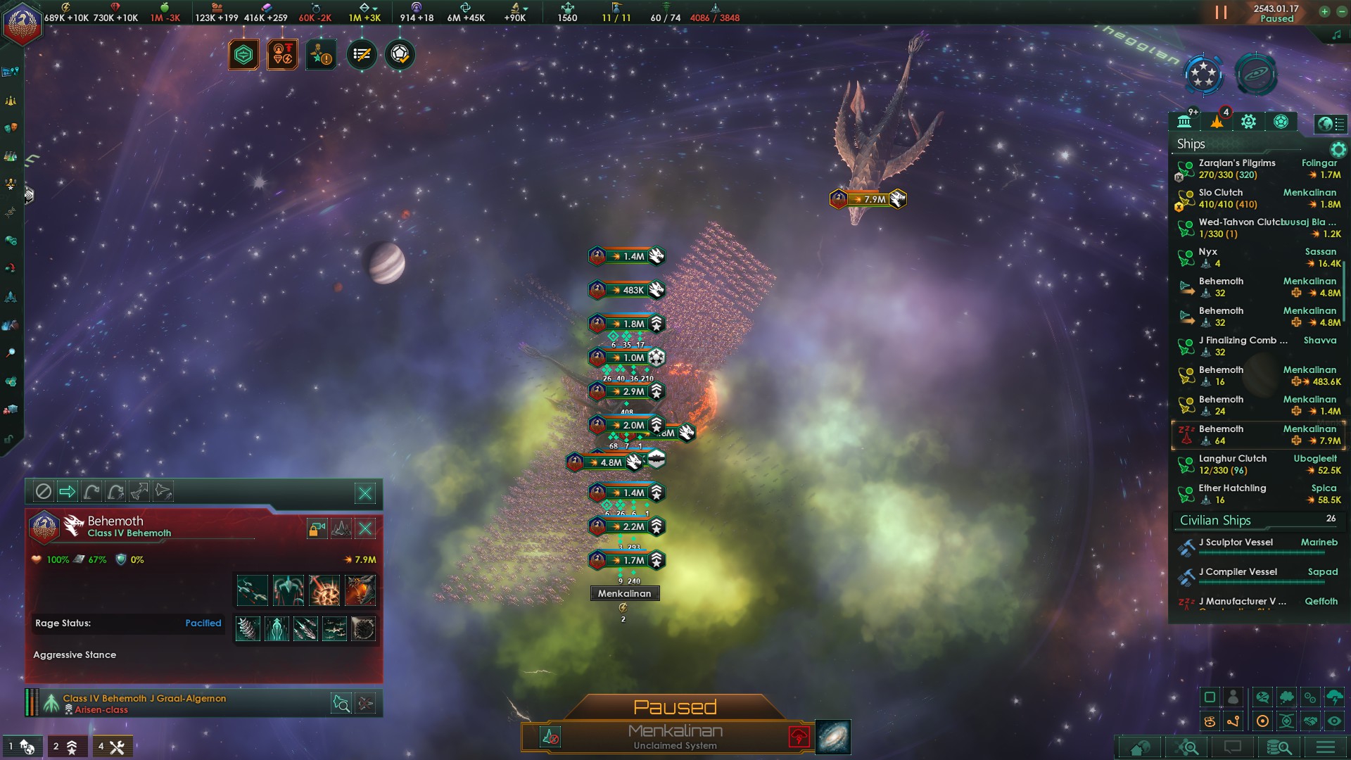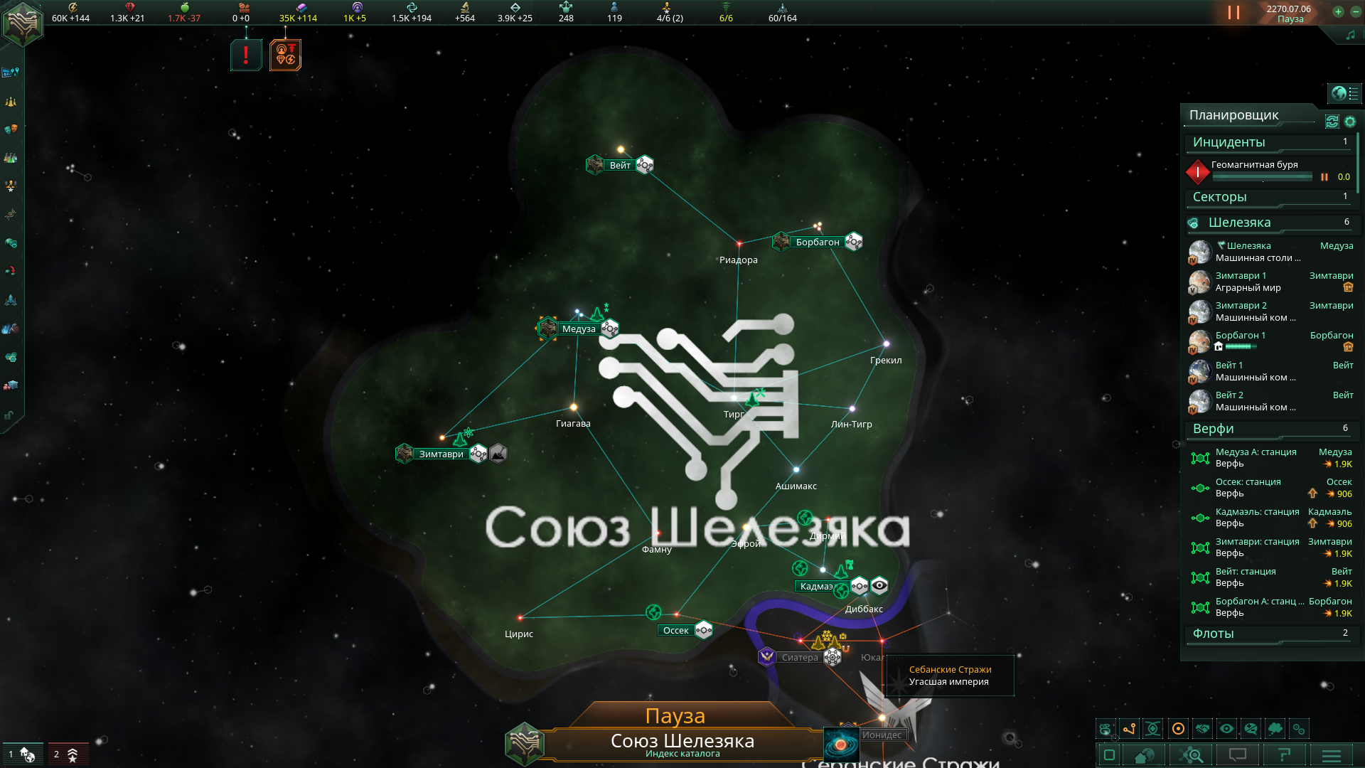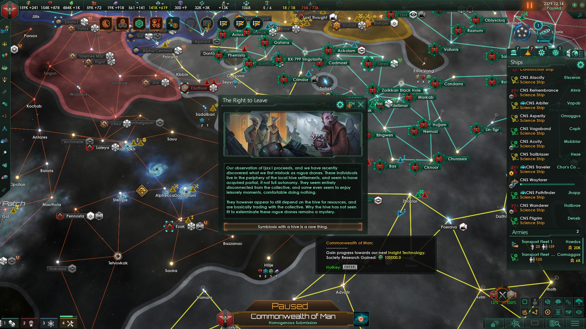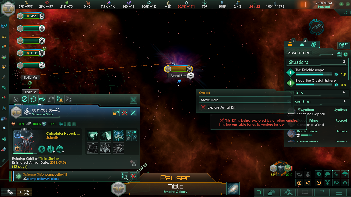 >>1291868 Перенос столицы - скорее всего дело в секторах, столица будет столицей столичного сектора, а столица сектора не может быть слишком близко к столице другого сектора. Попробуй временно удалить сектор(а) поблизости от твоей будущей столицы. Завершитель цикла выпадает с очень маленьким шансом, надо или очень много играть или сейвскамить как сука. Я помню из какого-то патчноута что шанс завершителя увеличивается в пять раз если в галактике кто-то (не ты) взял перк кризиса, не знаю актуально ли это еще. Само сообщение о завершителе выглядит как предложение пиздец могущества +100% ко всему с намёком что цена будет страшной, у кнопки согласия написано красным "не делай этого".