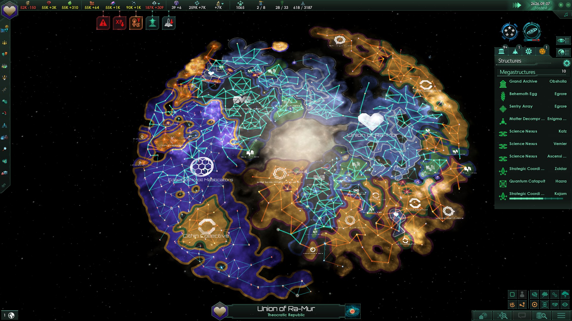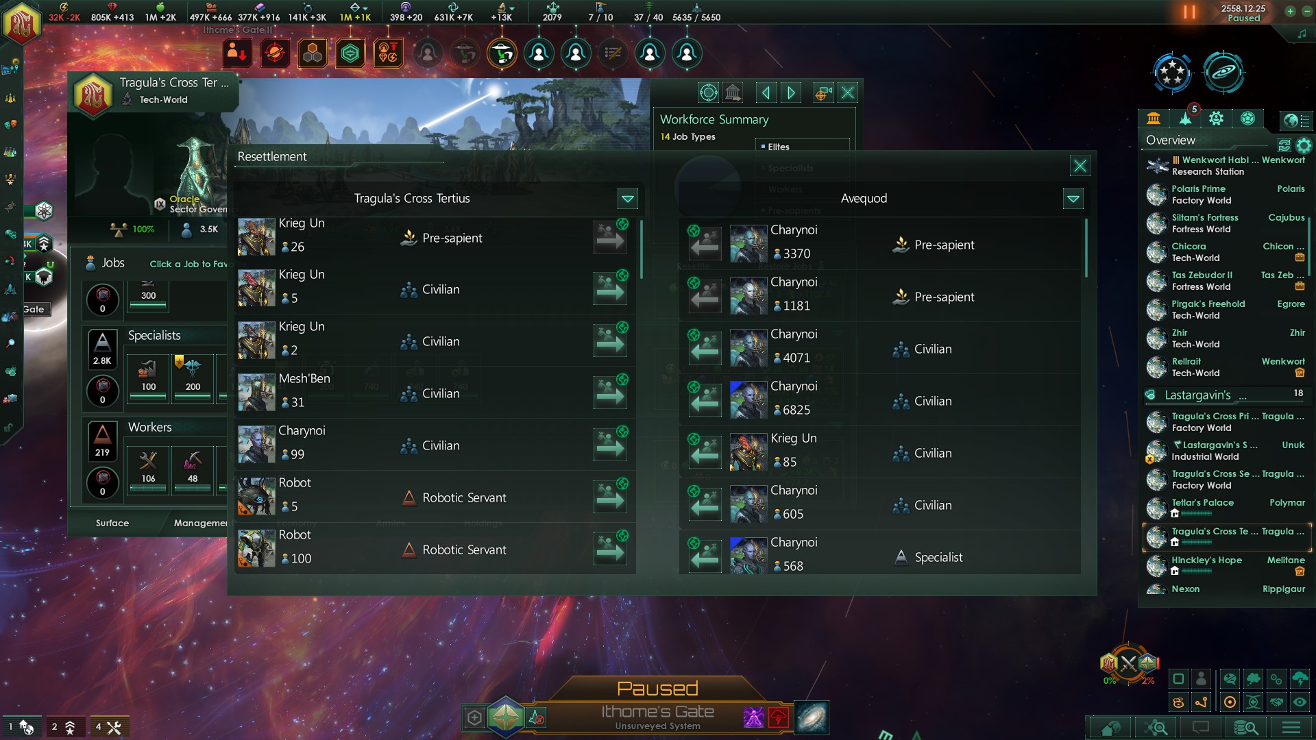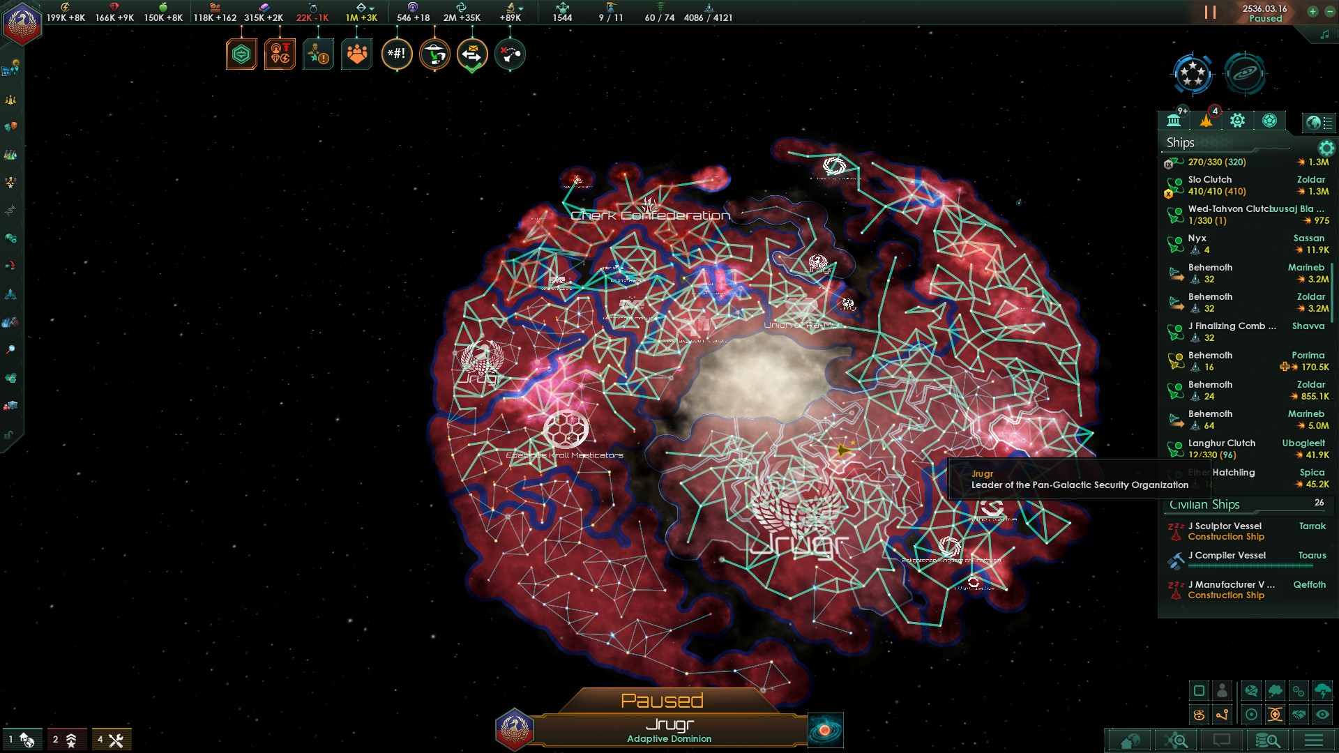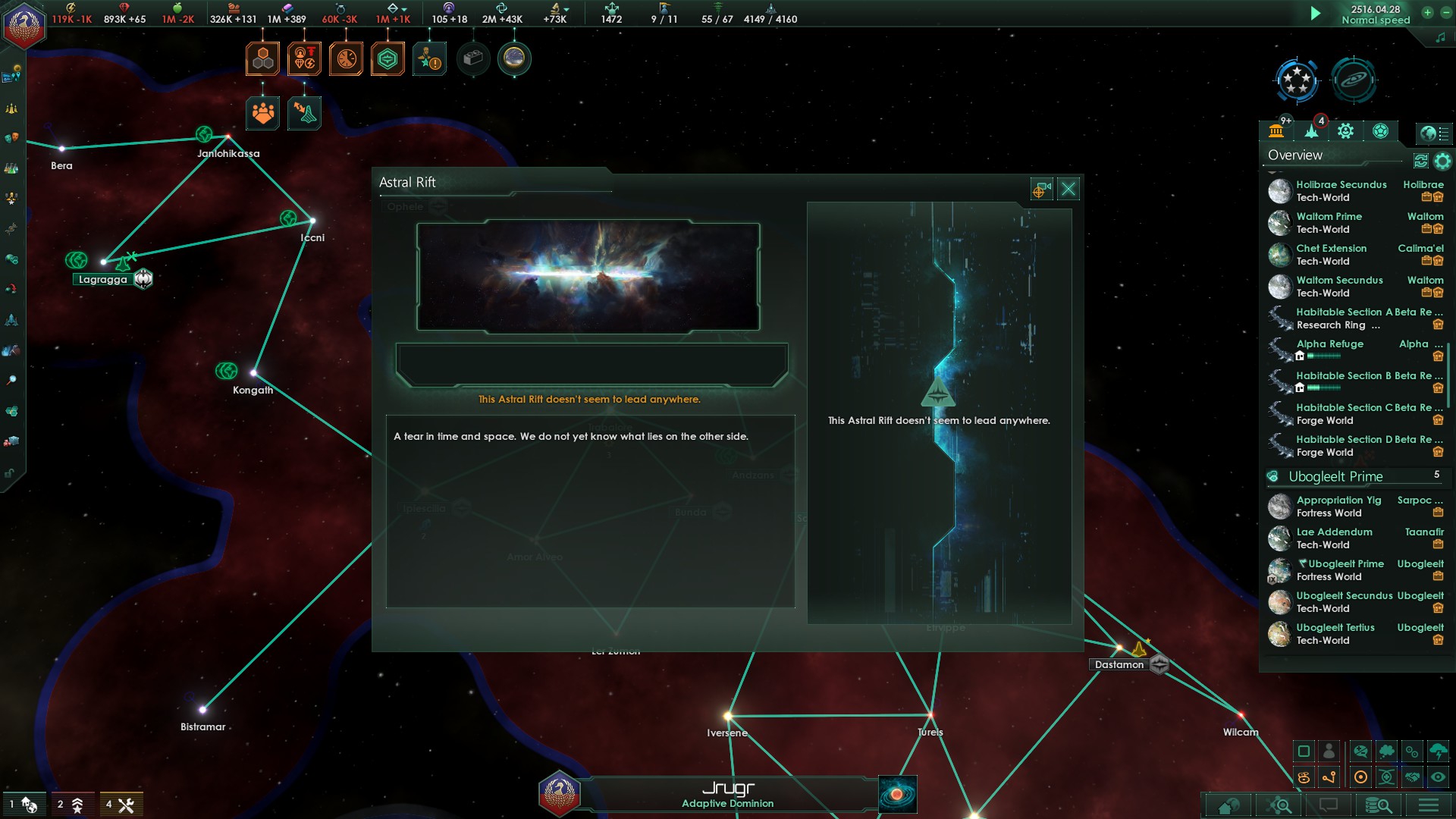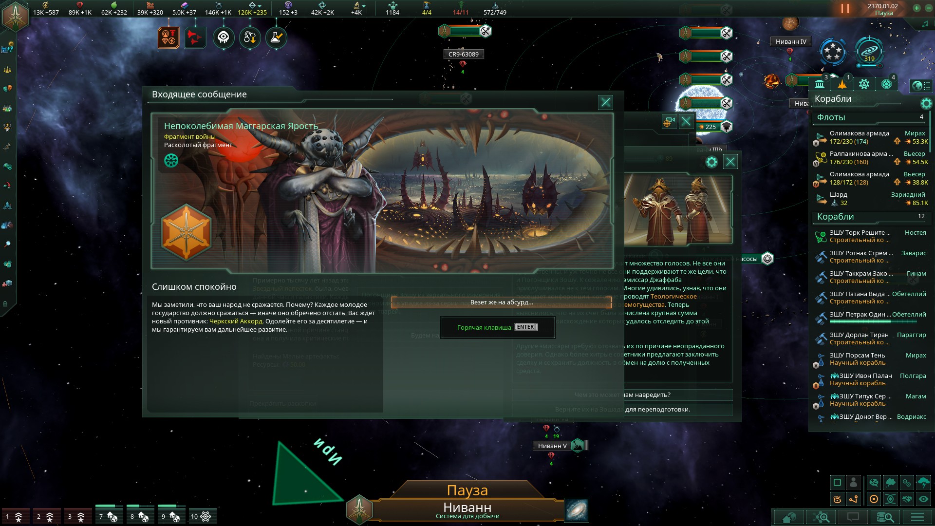 >>1291868 Перенос столицы - скорее всего дело в секторах, столица будет столицей столичного сектора, а столица сектора не может быть слишком близко к столице другого сектора. Попробуй временно удалить сектор(а) поблизости от твоей будущей столицы. Завершитель цикла выпадает с очень маленьким шансом, надо или очень много играть или сейвскамить как сука. Я помню из какого-то патчноута что шанс завершителя увеличивается в пять раз если в галактике кто-то (не ты) взял перк кризиса, не знаю актуально ли это еще. Само сообщение о завершителе выглядит как предложение пиздец могущества +100% ко всему с намёком что цена будет страшной, у кнопки согласия написано красным "не делай этого".