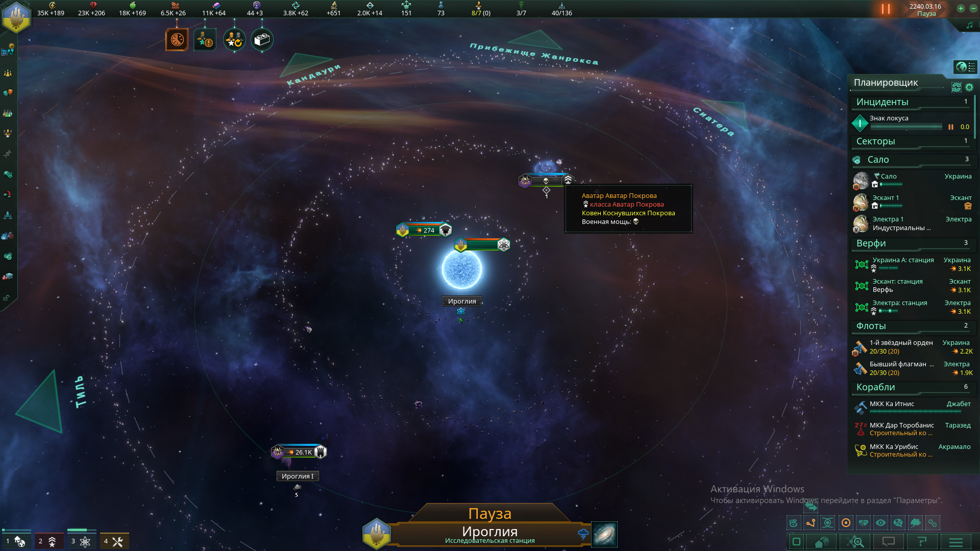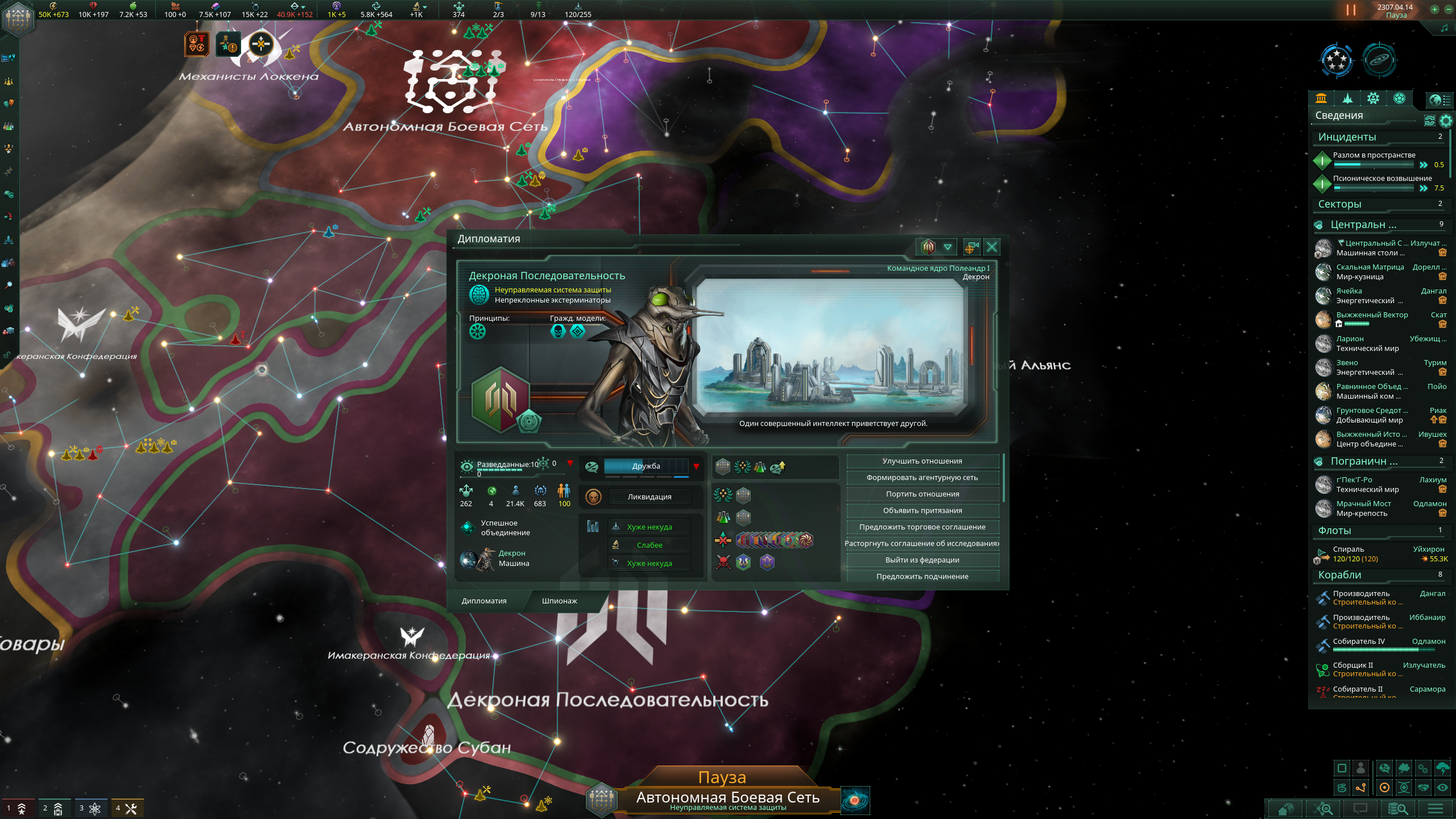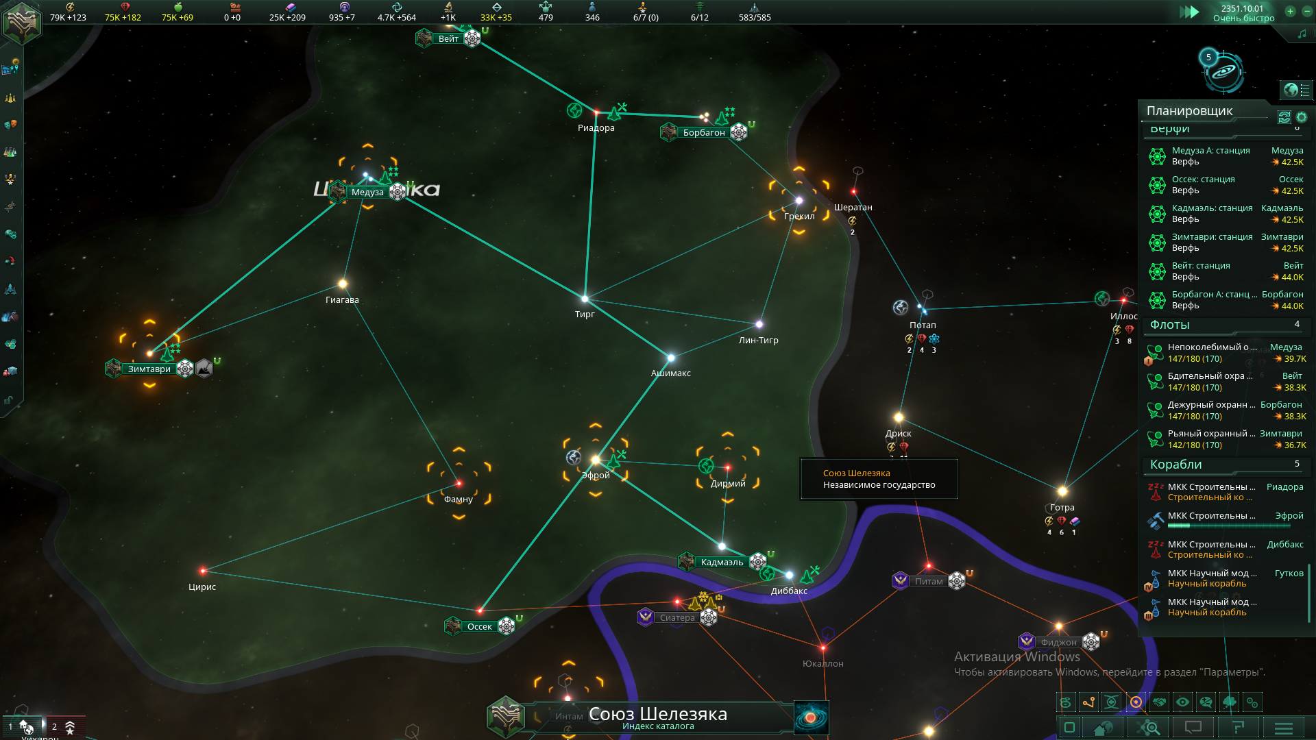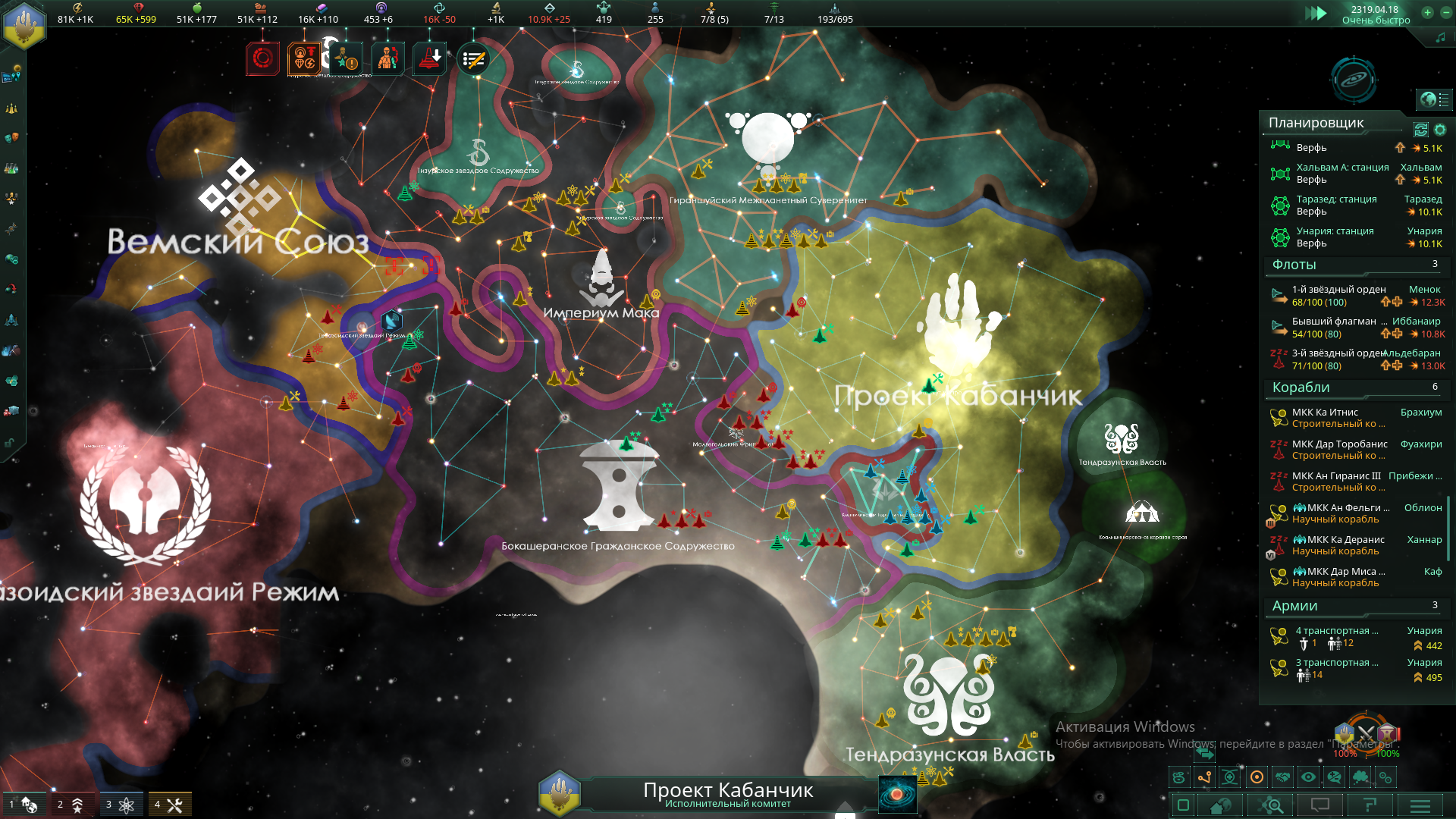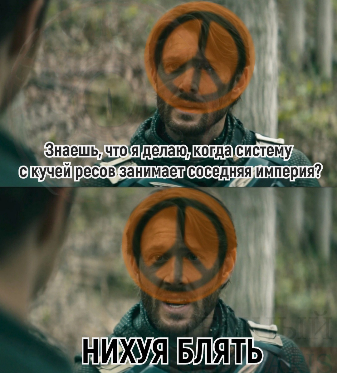 >>1295969 >Какой был казус белли войны, завоевание систем? Да >У кого первого случился мир с жертвой - у тебя или у другого пилителя жертвы? Хуй знает, мне раза два мир предлагали, а потом онко всплыло без опций, сказав, что у меня теперь не война, а мир >И ты прям полностью контролировал системы, имел на них претензии, а тебе их не дали? Я сперва заявил претензии на полоску из систем + одну систему которую было видно, но которая было недоступно далека без прокладки исследованием или войной. В ходе войны, на подлёте к далёкой одинокой звезде, на которую я претендовал, мне и встретился второй вторженец. Я сначала подумал, что это флот вассала моего визави, ибо он свим флотом на 500 подлетел, встретил меня и улетел обратно за пределы видимости. Потом через какое-ьл время опять подлетел, в систему со мной влетел, и опять улетел. Но он был жёлтым, меня не атаковал, тогда я подумал, что это мимопроходимец. Но мотом его корабли всплывать чаще стали, летать по моим свежезахваченным местам, произошёл звонок с ним и знакомство, и тогда я зрел что это сосед моего захватываемого соседа и он, походу,тоже захватывает соседа. Подлетев к жтой одиночно выделенно мной под захвата через предъявы претензий выделением на общей карте за счёт расхода влияния, я вдруг узрел, что на этой систему уже метка второго-соседа со-захватичка. Поняв, что северная часть владений соеда-долбоёба уже фактически под соседом-со-захватчиком, я снял с этой системы претензию (влияние, сука, не вернули) и сосредоточился на дозахвате южной половины империи соседушки. Накопил влияние, отметил претензию на уже контролируемой мной системе, сижу довольно урчу, зная, что застолбил системку, коплю дальше влияние для претензий >Скрины есть? Неа. Я ща в командировке, могу ьолько накидать в паинте в общем >А ты когда претензии делал, только на системы нажимал? Кнопку "выставить претензии заплатив влиянием" не забыл нажать? Я только так делаю, потому что нихуя не понял, почему если я отмечаю претензию внутри системы, то в режиме карты галактики система остаётся непритязаемой, а платить 2х влияние за одну систему слишком жирно