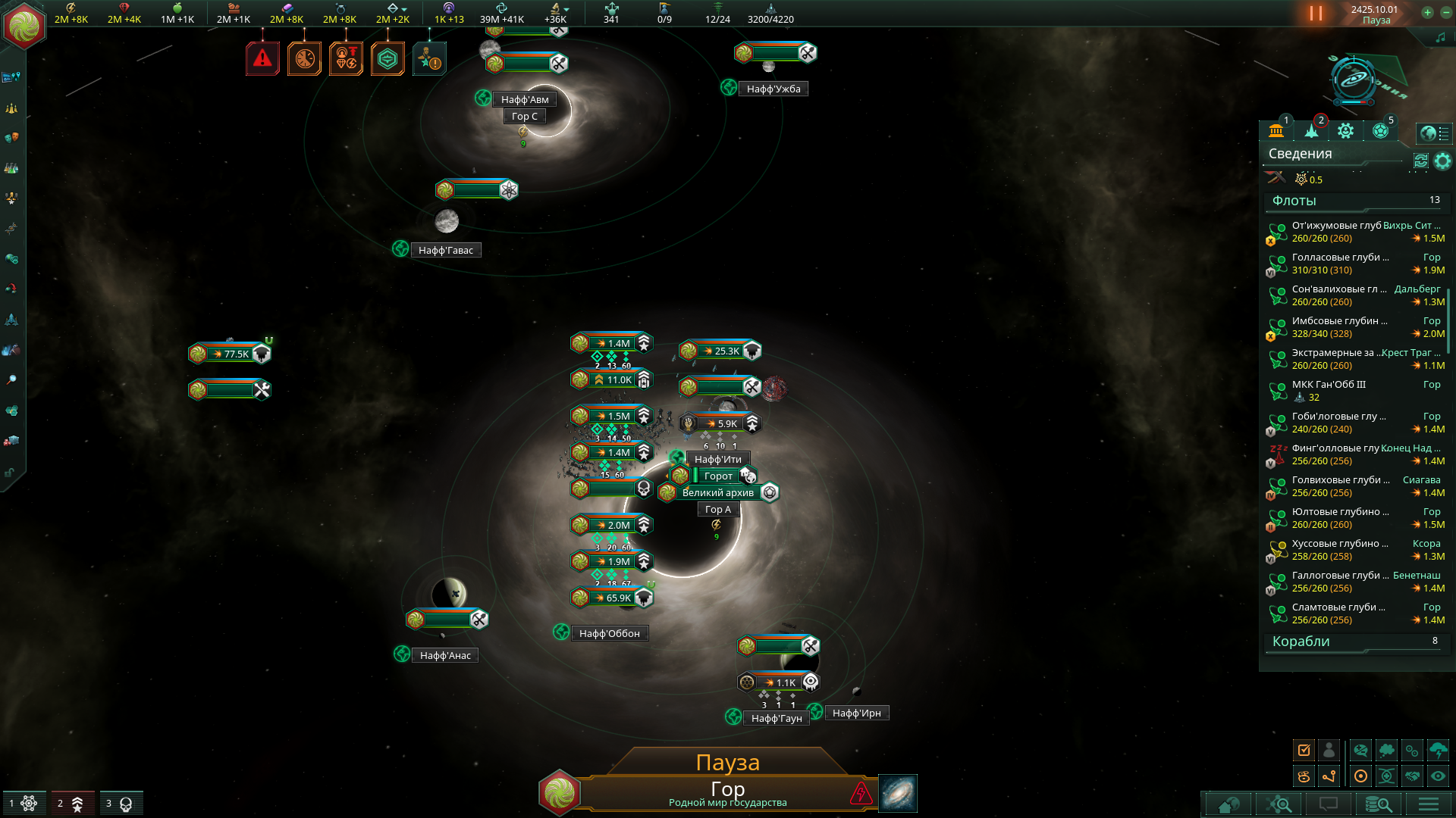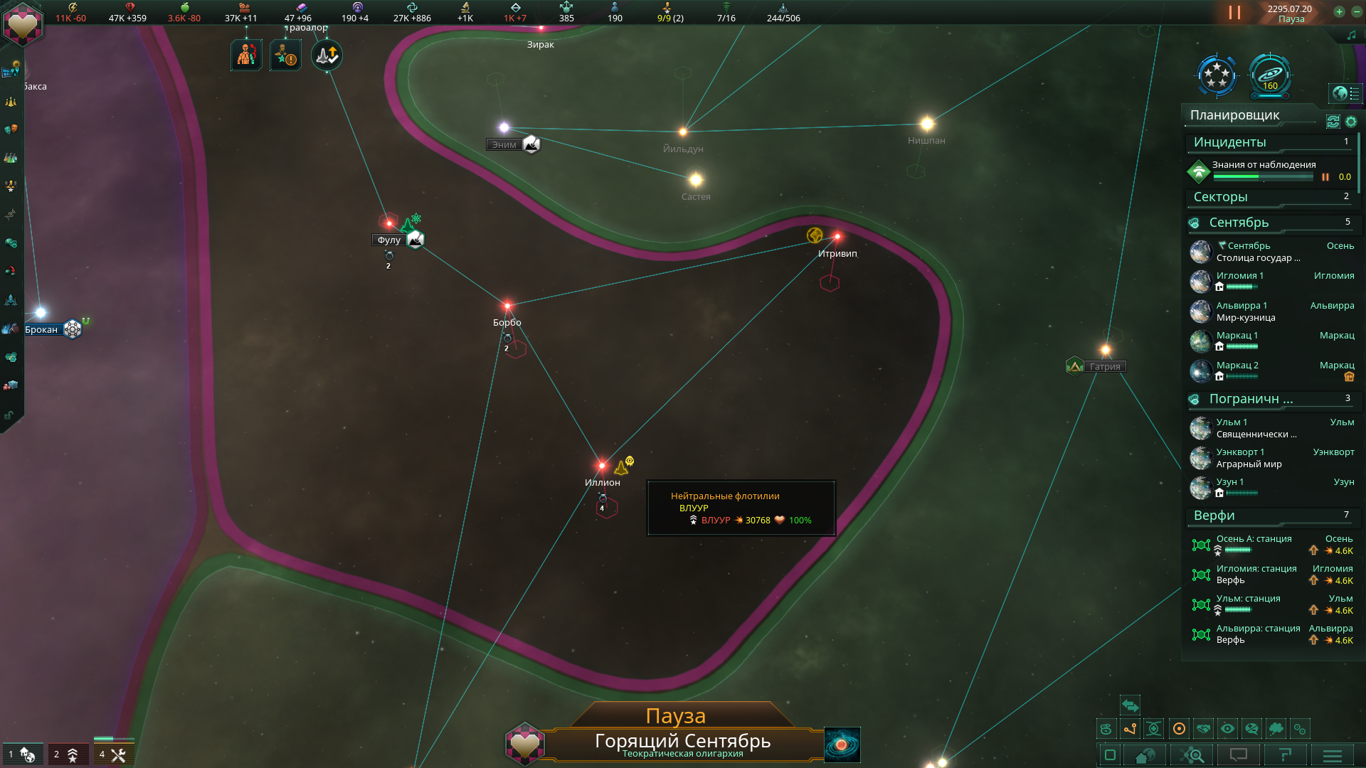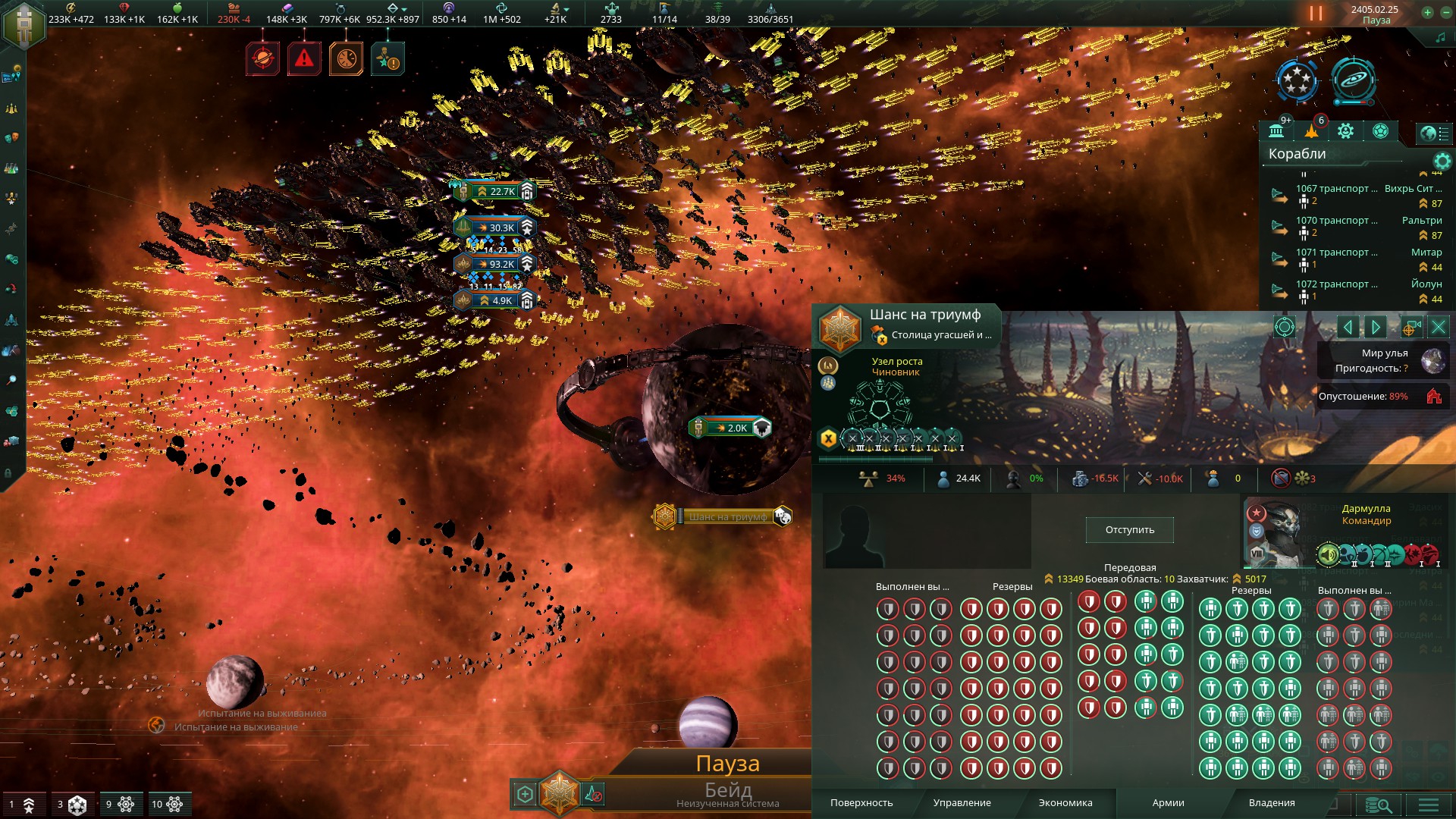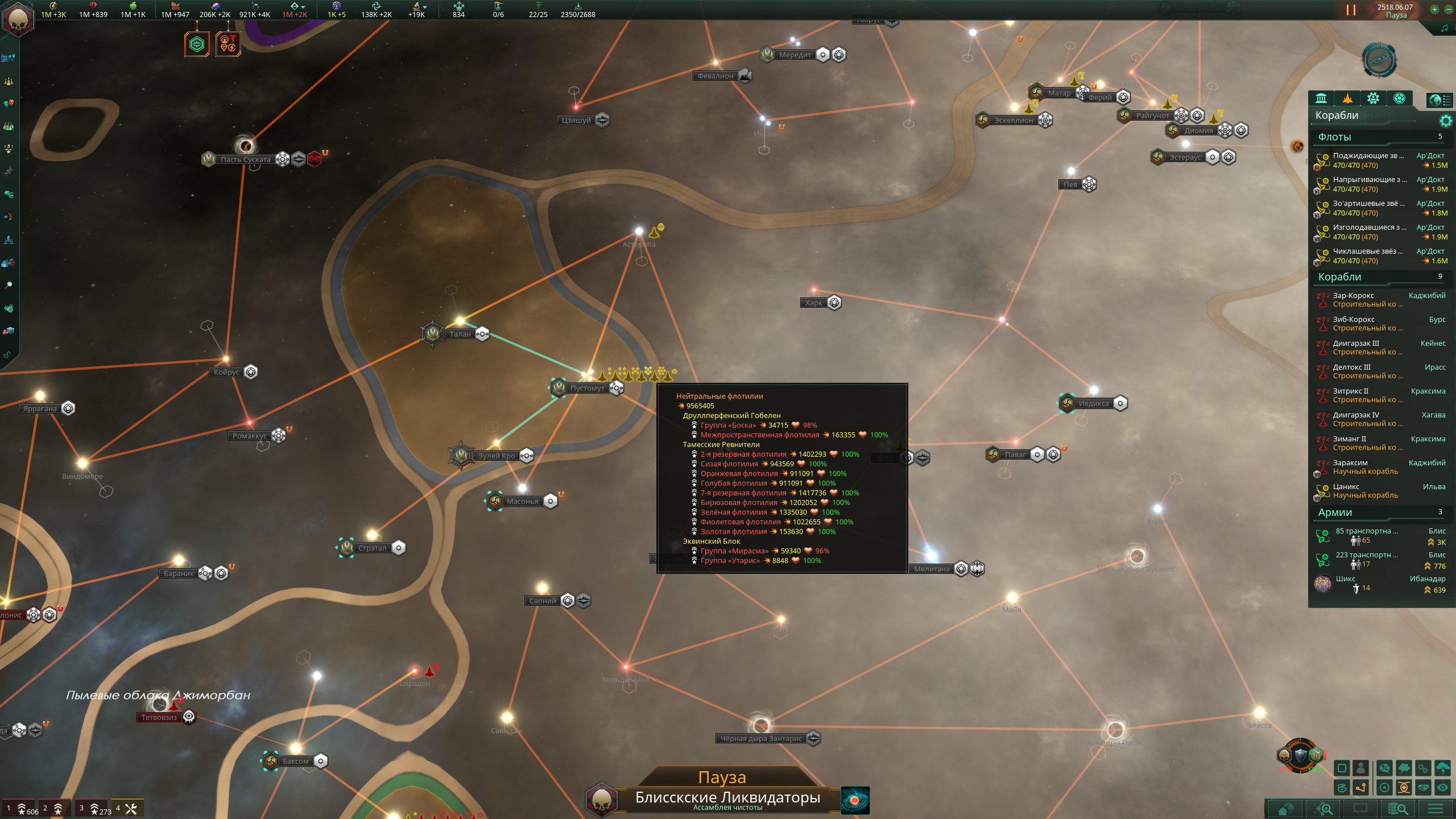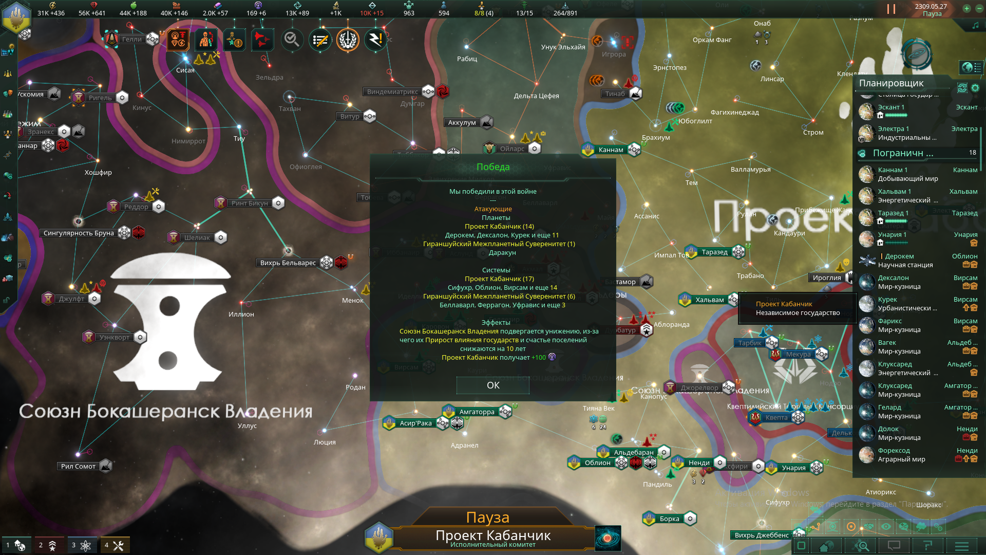 >>1295969 >Какой был казус белли войны, завоевание систем? Да >У кого первого случился мир с жертвой - у тебя или у другого пилителя жертвы? Хуй знает, мне раза два мир предлагали, а потом онко всплыло без опций, сказав, что у меня теперь не война, а мир >И ты прям полностью контролировал системы, имел на них претензии, а тебе их не дали? Я сперва заявил претензии на полоску из систем + одну систему которую было видно, но которая было недоступно далека без прокладки исследованием или войной. В ходе войны, на подлёте к далёкой одинокой звезде, на которую я претендовал, мне и встретился второй вторженец. Я сначала подумал, что это флот вассала моего визави, ибо он свим флотом на 500 подлетел, встретил меня и улетел обратно за пределы видимости. Потом через какое-ьл время опять подлетел, в систему со мной влетел, и опять улетел. Но он был жёлтым, меня не атаковал, тогда я подумал, что это мимопроходимец. Но мотом его корабли всплывать чаще стали, летать по моим свежезахваченным местам, произошёл звонок с ним и знакомство, и тогда я зрел что это сосед моего захватываемого соседа и он, походу,тоже захватывает соседа. Подлетев к жтой одиночно выделенно мной под захвата через предъявы претензий выделением на общей карте за счёт расхода влияния, я вдруг узрел, что на этой систему уже метка второго-соседа со-захватичка. Поняв, что северная часть владений соеда-долбоёба уже фактически под соседом-со-захватчиком, я снял с этой системы претензию (влияние, сука, не вернули) и сосредоточился на дозахвате южной половины империи соседушки. Накопил влияние, отметил претензию на уже контролируемой мной системе, сижу довольно урчу, зная, что застолбил системку, коплю дальше влияние для претензий >Скрины есть? Неа. Я ща в командировке, могу ьолько накидать в паинте в общем >А ты когда претензии делал, только на системы нажимал? Кнопку "выставить претензии заплатив влиянием" не забыл нажать? Я только так делаю, потому что нихуя не понял, почему если я отмечаю претензию внутри системы, то в режиме карты галактики система остаётся непритязаемой, а платить 2х влияние за одну систему слишком жирно