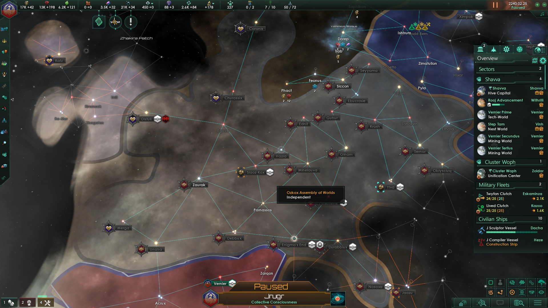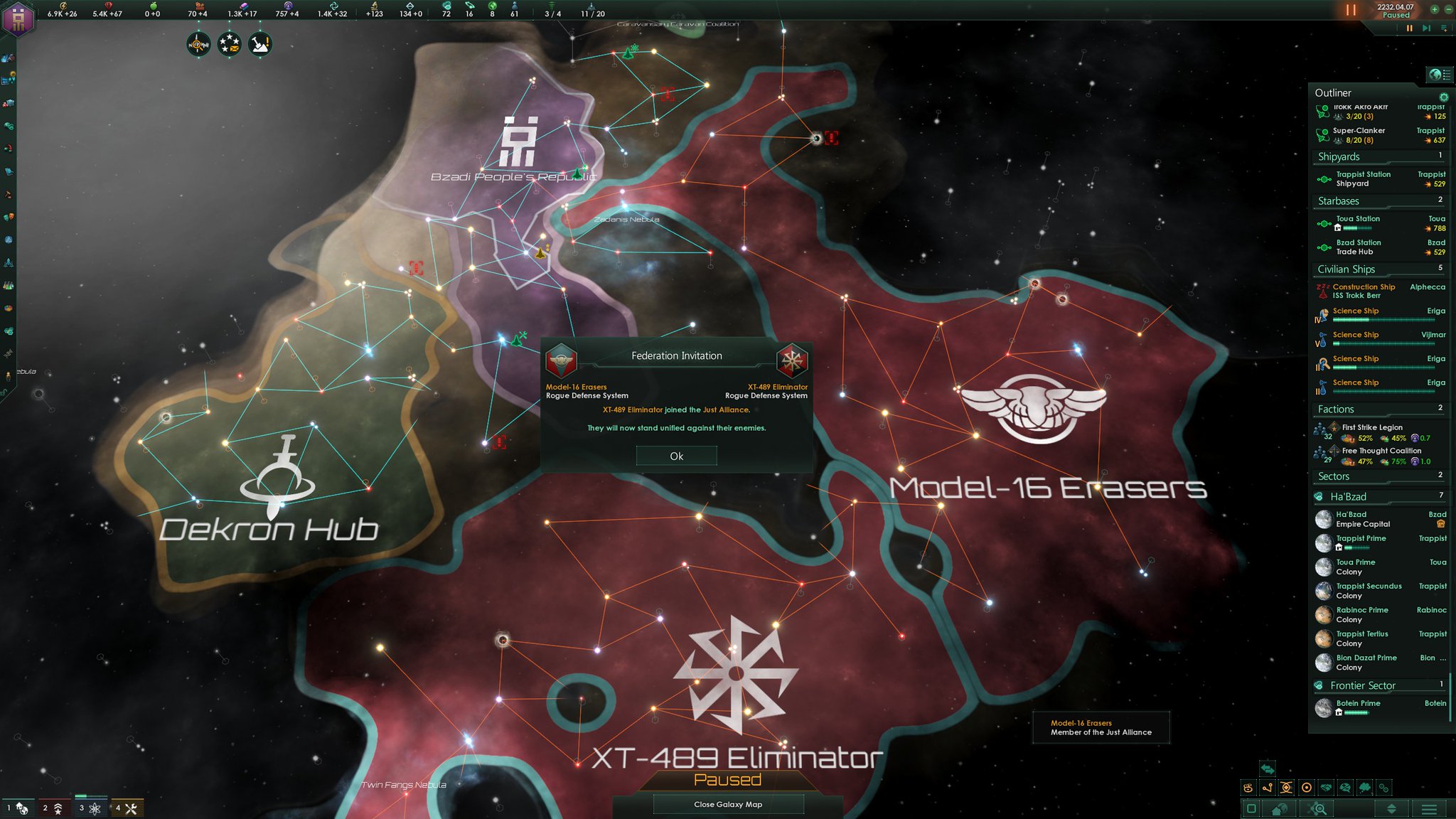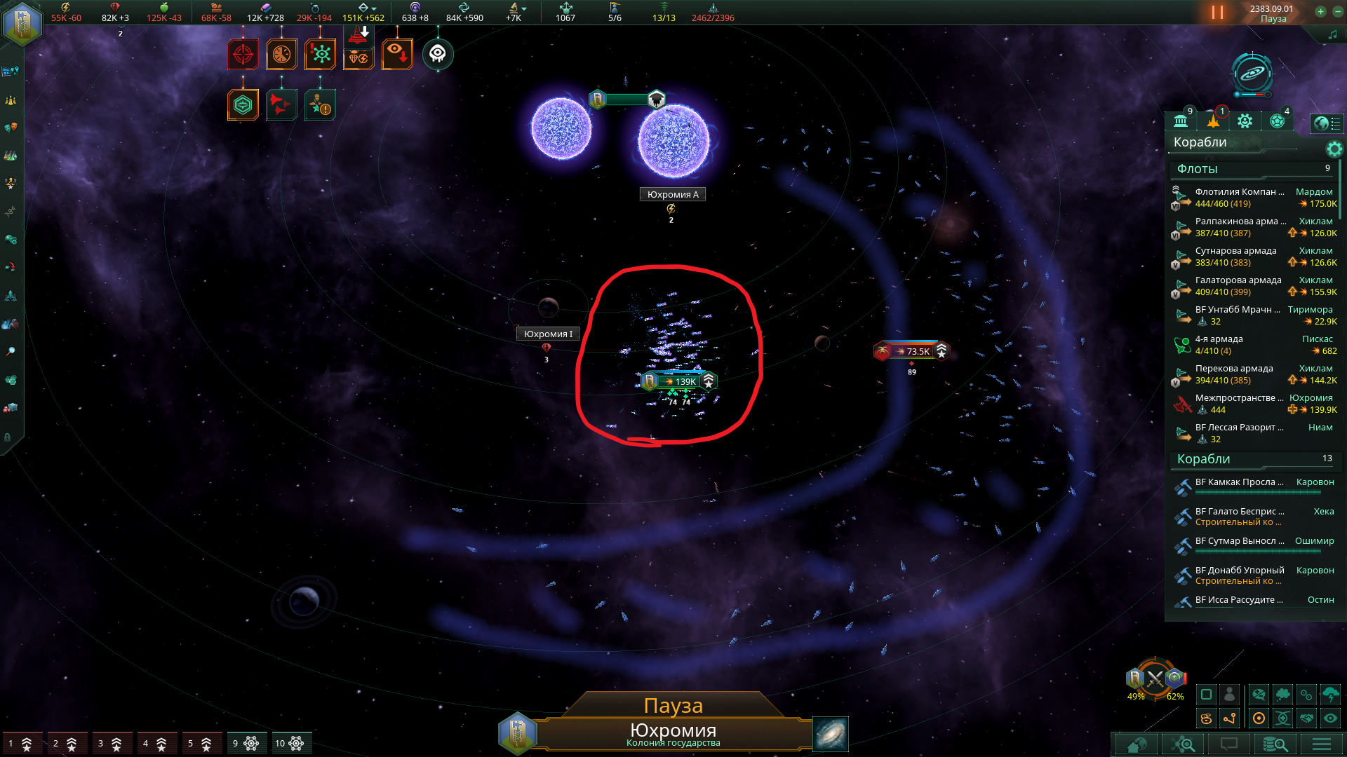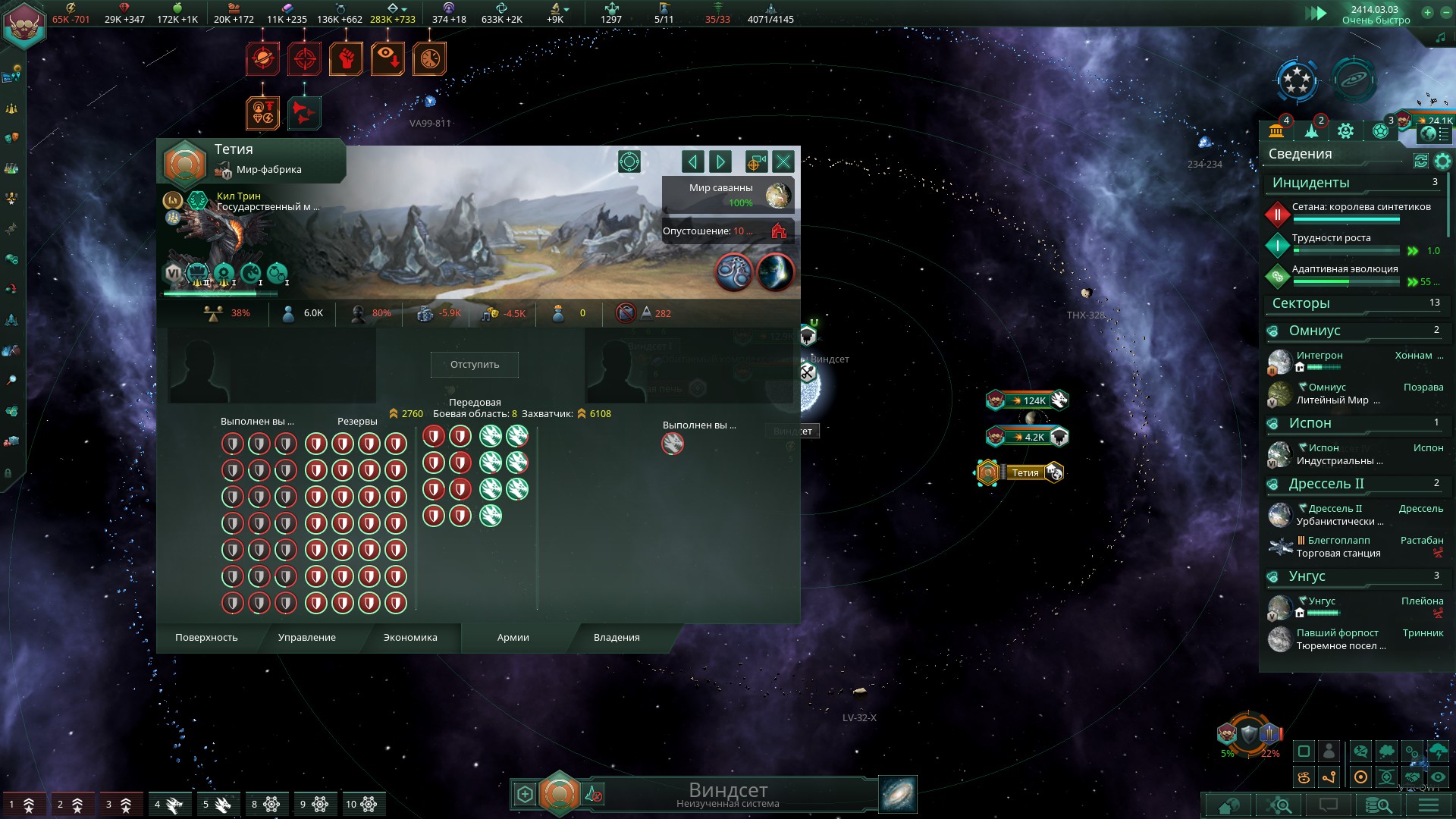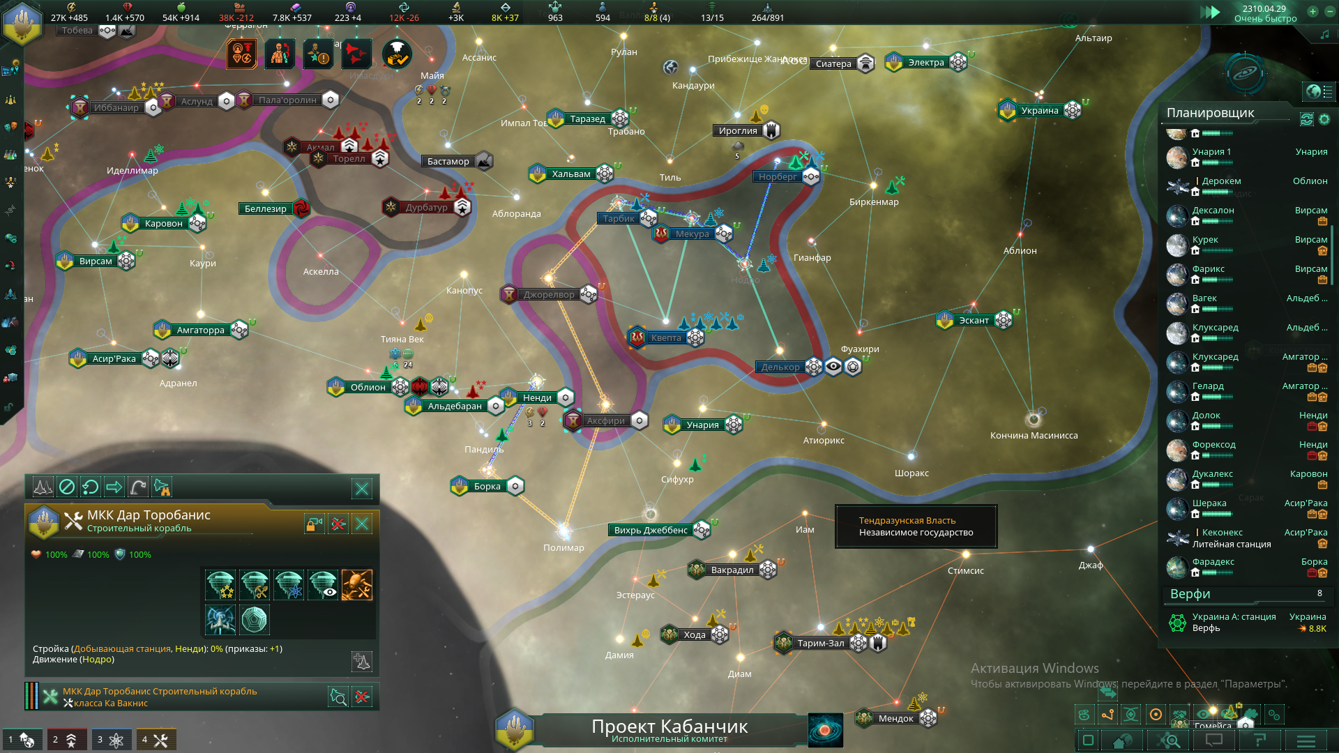 >>1295969 >Какой был казус белли войны, завоевание систем? Да >У кого первого случился мир с жертвой - у тебя или у другого пилителя жертвы? Хуй знает, мне раза два мир предлагали, а потом онко всплыло без опций, сказав, что у меня теперь не война, а мир >И ты прям полностью контролировал системы, имел на них претензии, а тебе их не дали? Я сперва заявил претензии на полоску из систем + одну систему которую было видно, но которая было недоступно далека без прокладки исследованием или войной. В ходе войны, на подлёте к далёкой одинокой звезде, на которую я претендовал, мне и встретился второй вторженец. Я сначала подумал, что это флот вассала моего визави, ибо он свим флотом на 500 подлетел, встретил меня и улетел обратно за пределы видимости. Потом через какое-ьл время опять подлетел, в систему со мной влетел, и опять улетел. Но он был жёлтым, меня не атаковал, тогда я подумал, что это мимопроходимец. Но мотом его корабли всплывать чаще стали, летать по моим свежезахваченным местам, произошёл звонок с ним и знакомство, и тогда я зрел что это сосед моего захватываемого соседа и он, походу,тоже захватывает соседа. Подлетев к жтой одиночно выделенно мной под захвата через предъявы претензий выделением на общей карте за счёт расхода влияния, я вдруг узрел, что на этой систему уже метка второго-соседа со-захватичка. Поняв, что северная часть владений соеда-долбоёба уже фактически под соседом-со-захватчиком, я снял с этой системы претензию (влияние, сука, не вернули) и сосредоточился на дозахвате южной половины империи соседушки. Накопил влияние, отметил претензию на уже контролируемой мной системе, сижу довольно урчу, зная, что застолбил системку, коплю дальше влияние для претензий >Скрины есть? Неа. Я ща в командировке, могу ьолько накидать в паинте в общем >А ты когда претензии делал, только на системы нажимал? Кнопку "выставить претензии заплатив влиянием" не забыл нажать? Я только так делаю, потому что нихуя не понял, почему если я отмечаю претензию внутри системы, то в режиме карты галактики система остаётся непритязаемой, а платить 2х влияние за одну систему слишком жирно