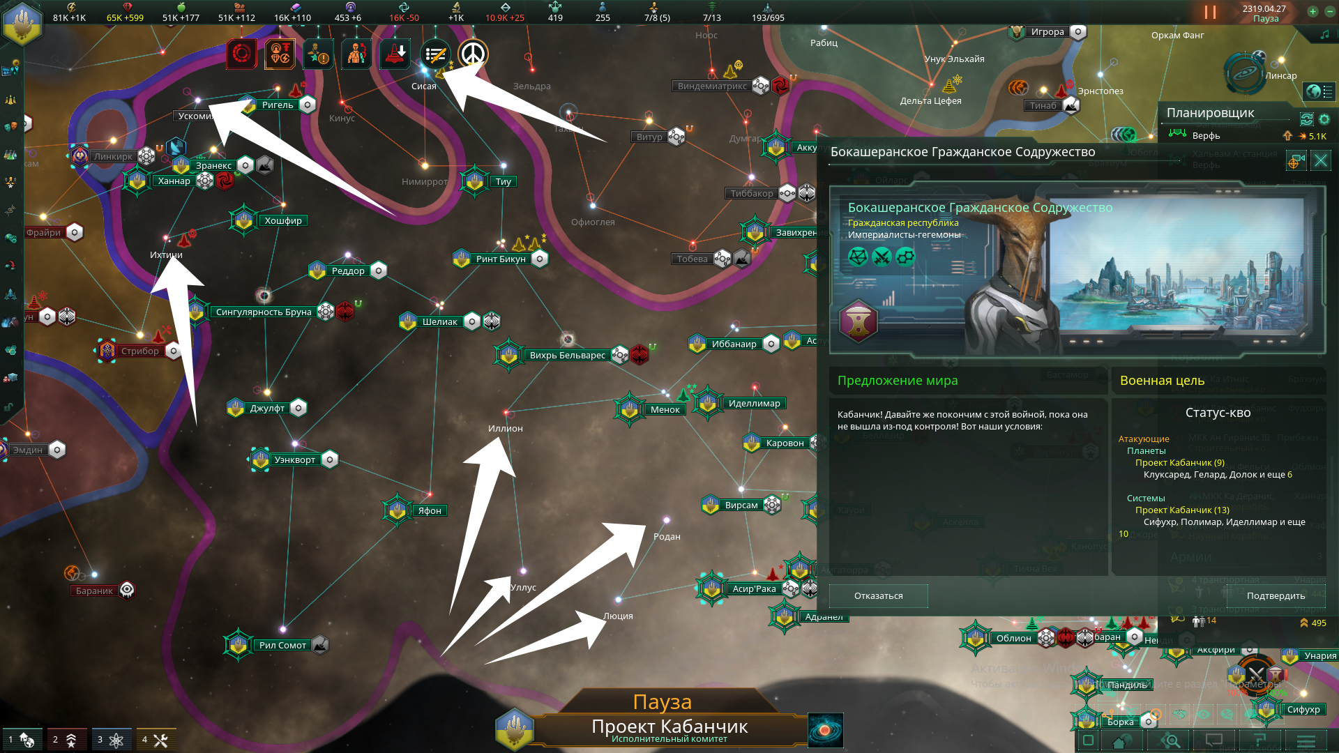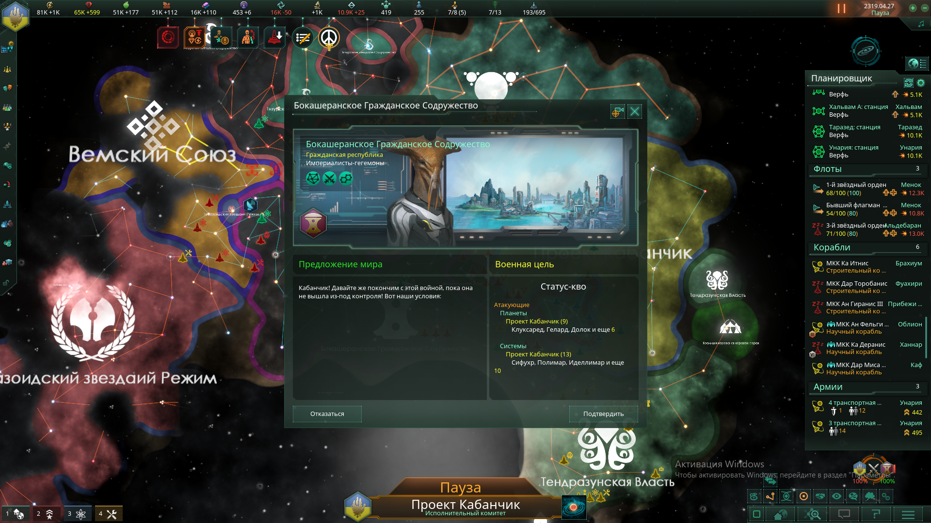 >>1295966 Какой был казус белли войны, завоевание систем? У кого первого случился мир с жертвой - у тебя или у другого пилителя жертвы? И ты прям полностью контролировал системы, имел на них претензии, а тебе их не дали? Скрины есть? А ты когда претензии делал, только на системы нажимал? Кнопку "выставить претензии заплатив влиянием" не забыл нажать?