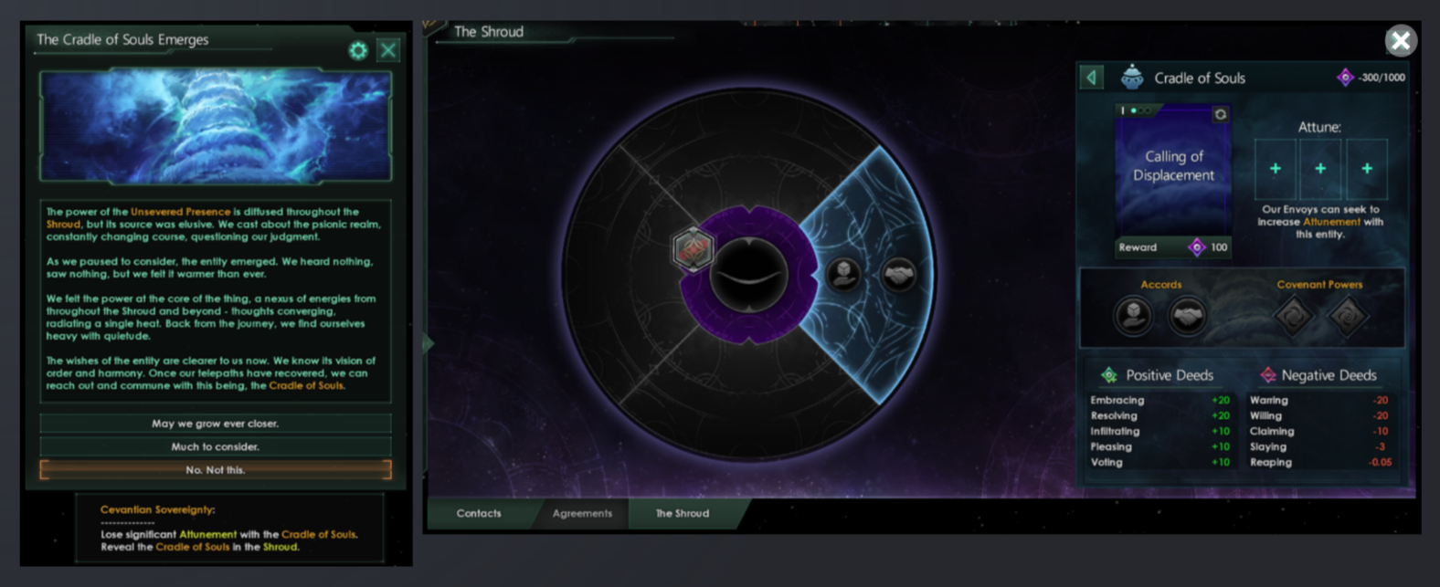 И как за псиоников вызвать ебаку, которая сожрет почти всю галактику? Я уже заебался всякие бонусы выхватывать. Потом взял договор с пожирателем миров, но это же не то