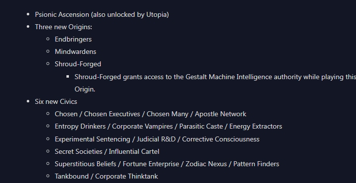 Ебать, эндбрингерам дали тотальную войну на тех же условиях что и у стандартных империй с ковенантом, теперь необязательно стакать снижение стоймости претензий ну и куда мне теперь эти 17 месячного влияния девать блятьзато вместо цивика на снижение стоймости претензий могу взять цивик на +эффективность рабов, кек >>1296035 Она может очень эффективно расползаться по голактеке особенно жрущая