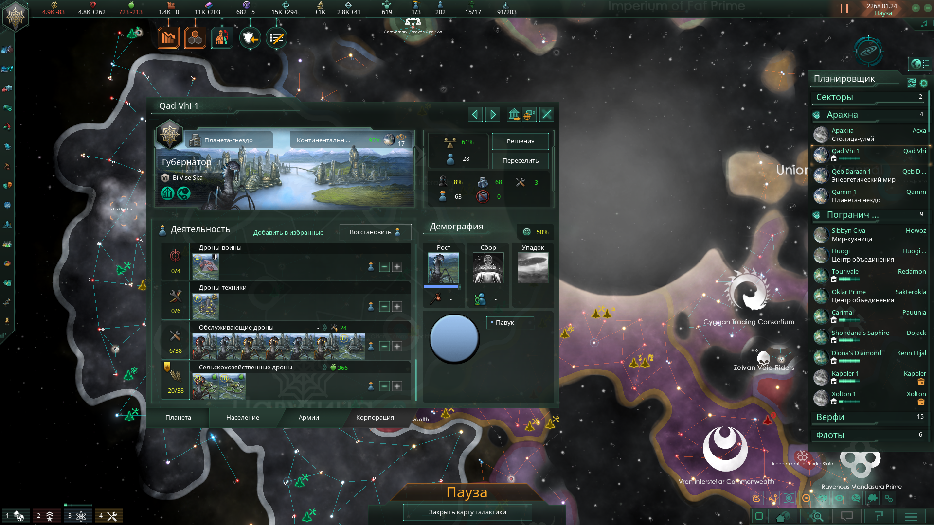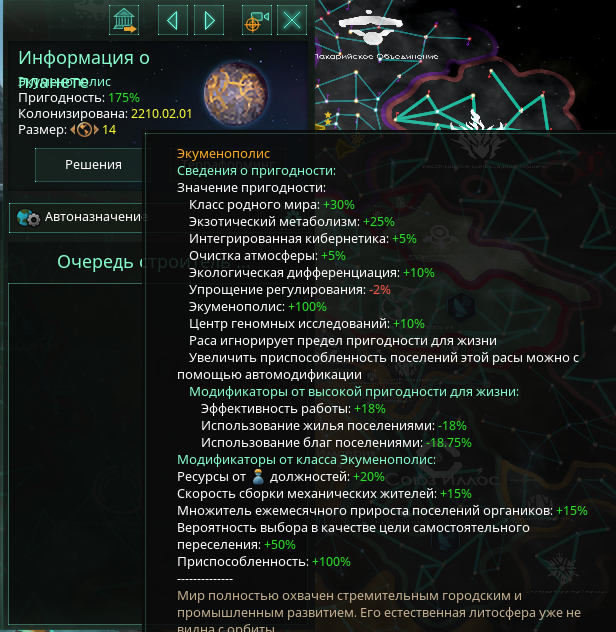Если играете с роботами, обязательно убирайте снижение роста попов от общего кол-ва в империи. Но даже без него любой бонус, даже на -0.00000000005%, срежет прирост ровно на 1.