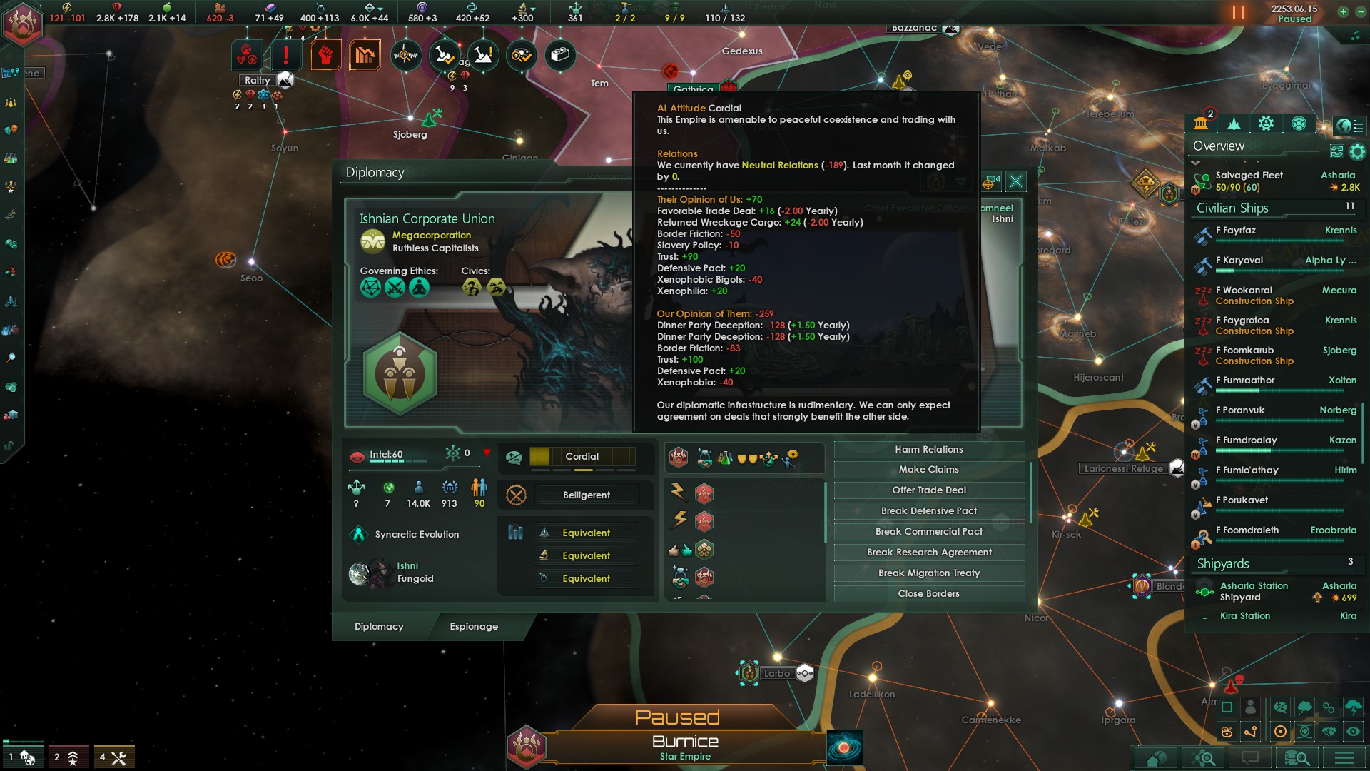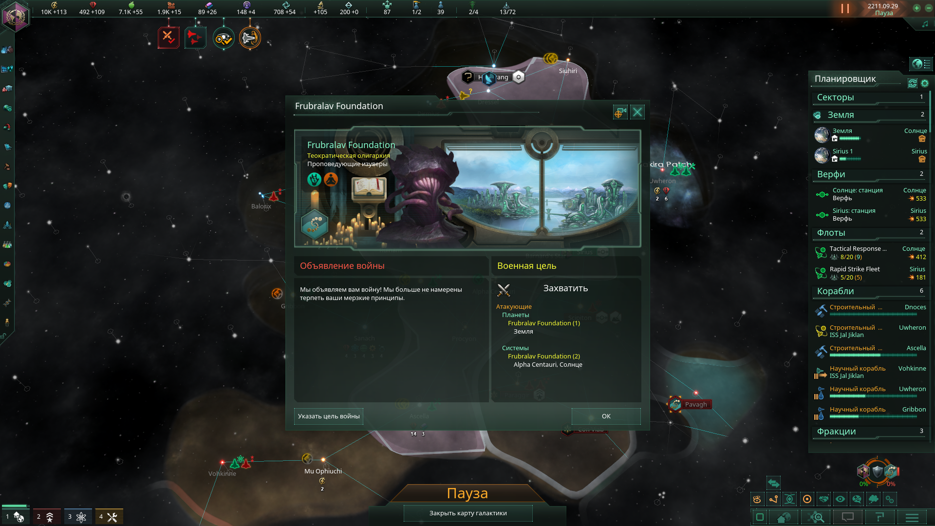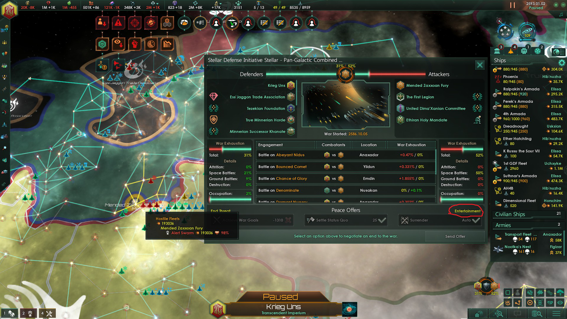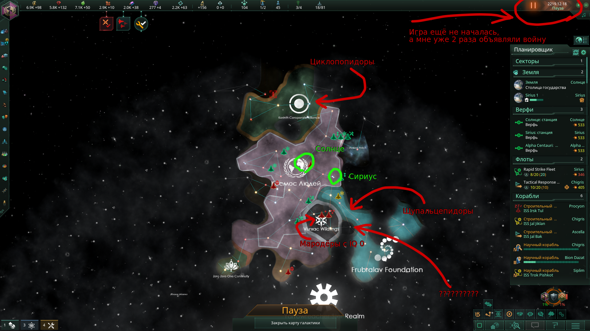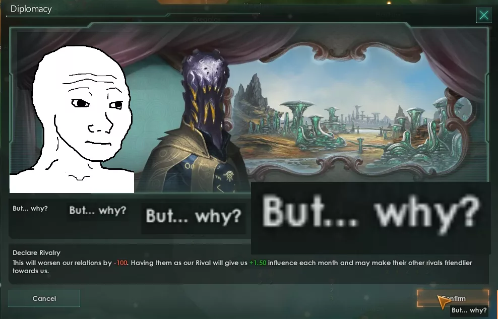 Да как ты заебал, черт ебучий. Мало того что стравливает меня с потенциальным союзником, с которым вообще нет причин воевать, так ещё и флот у него 1в1 как у меня и систем раза в 3 больше. Я даже при всём желании в 10 лет не уложусь. Даже начинать не буду. Самый ебнутый фоллен, который ещё и в пожирающий рой может превратиться