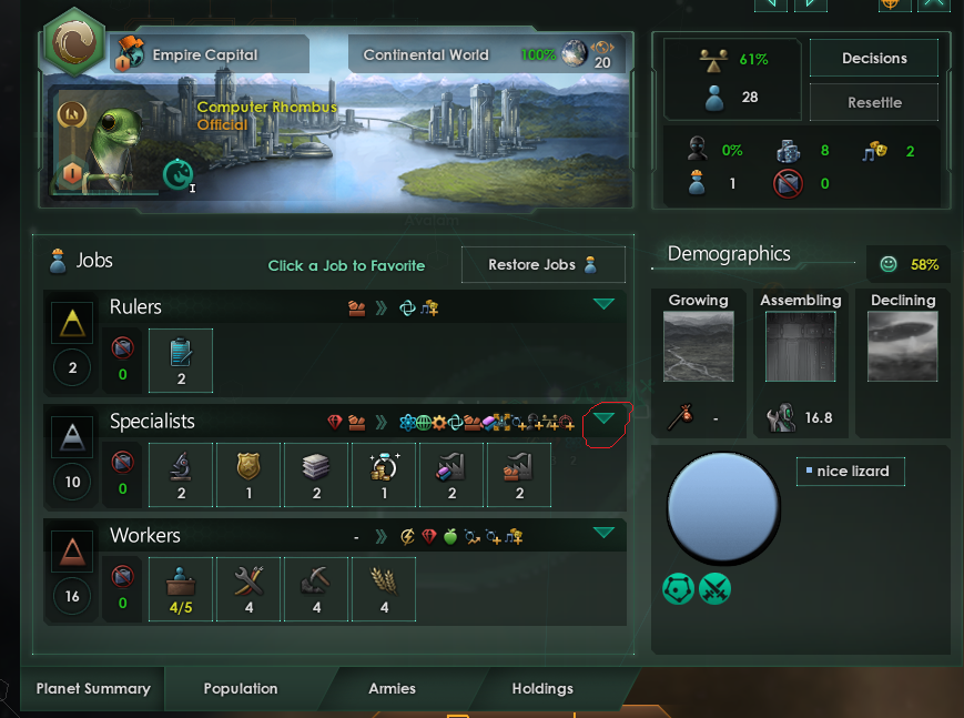 >>1291855 В управлении профессиями интерфейс по стратам поделен, золотые треугольники - наносеки, серебряные - спецы, коричневые - работяги. В большинстве случаев работяги это добытчики базовых ресурсов + солдаты, но могут быть фишечки в зависимости от цивиков и форм правления.