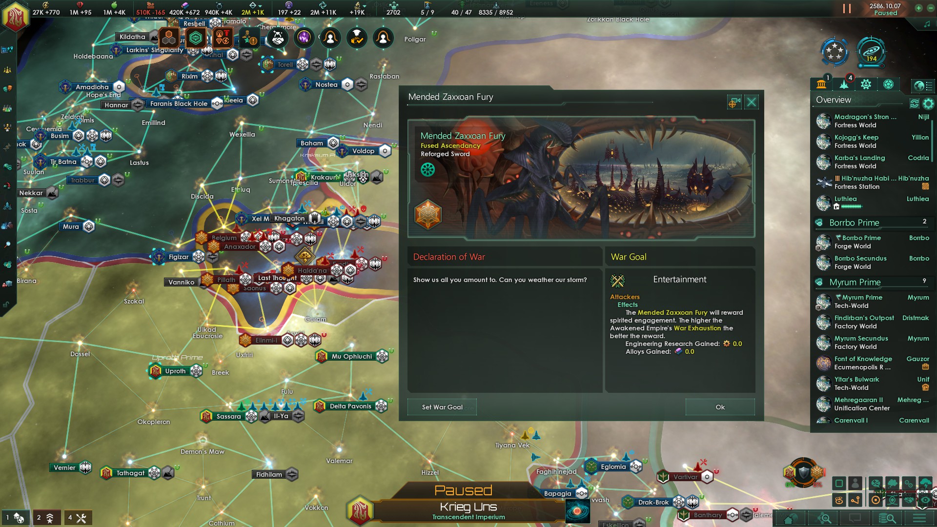 Look how they massacred my boy! О, пробуждённый фоллен еще и в верзохакинез может? Кстати, у нас против него тотальная война, возможно потому что он охуел, но скорее всего потому что у кого-то из наших (у президента?) есть колосс. А у него против нас - развлечение с оккупациями, ахахаха! ОКР игрушка дьявола жи есть, сидел пока не додавил всю его педерацию (в половине систем хабитаты-крепости и по две боевые станции по краям) и пока не распределил нахапанное, 600й год блядь что я делаю?