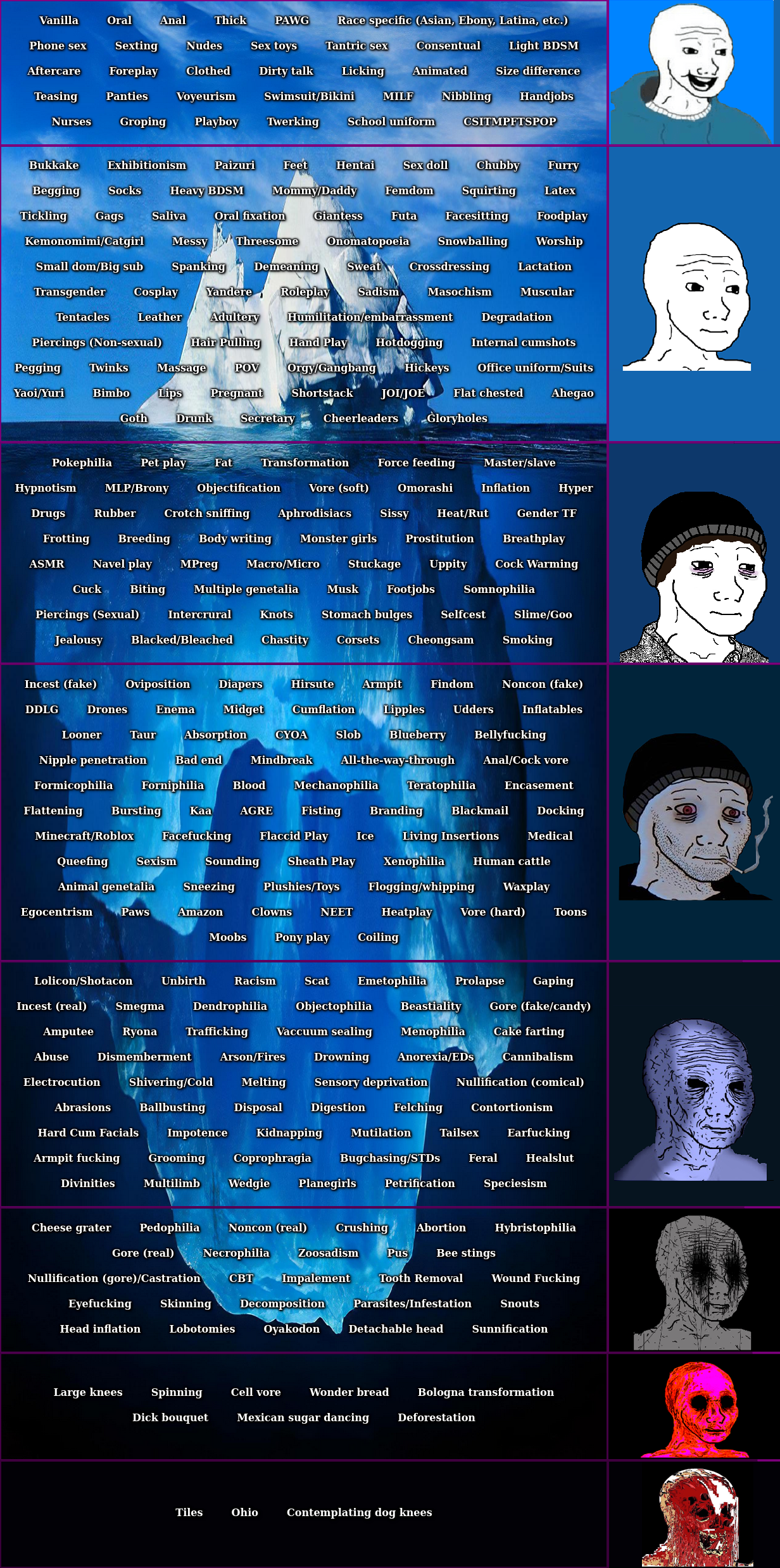 - "На этой доске можно обсуждать любые девиации?" — Да, если не указано обратное. В данном случае, запрещено всё что связано с цопе, детской эротикой и зоофилией. Первое и второе уголовно наказуемы, насчет третьего Педивикия говорит: "В России зоосексуальность законна, но зоосексуальная порнография незаконна." Не стесняйтесь отправить репорт на запрещённый контент.