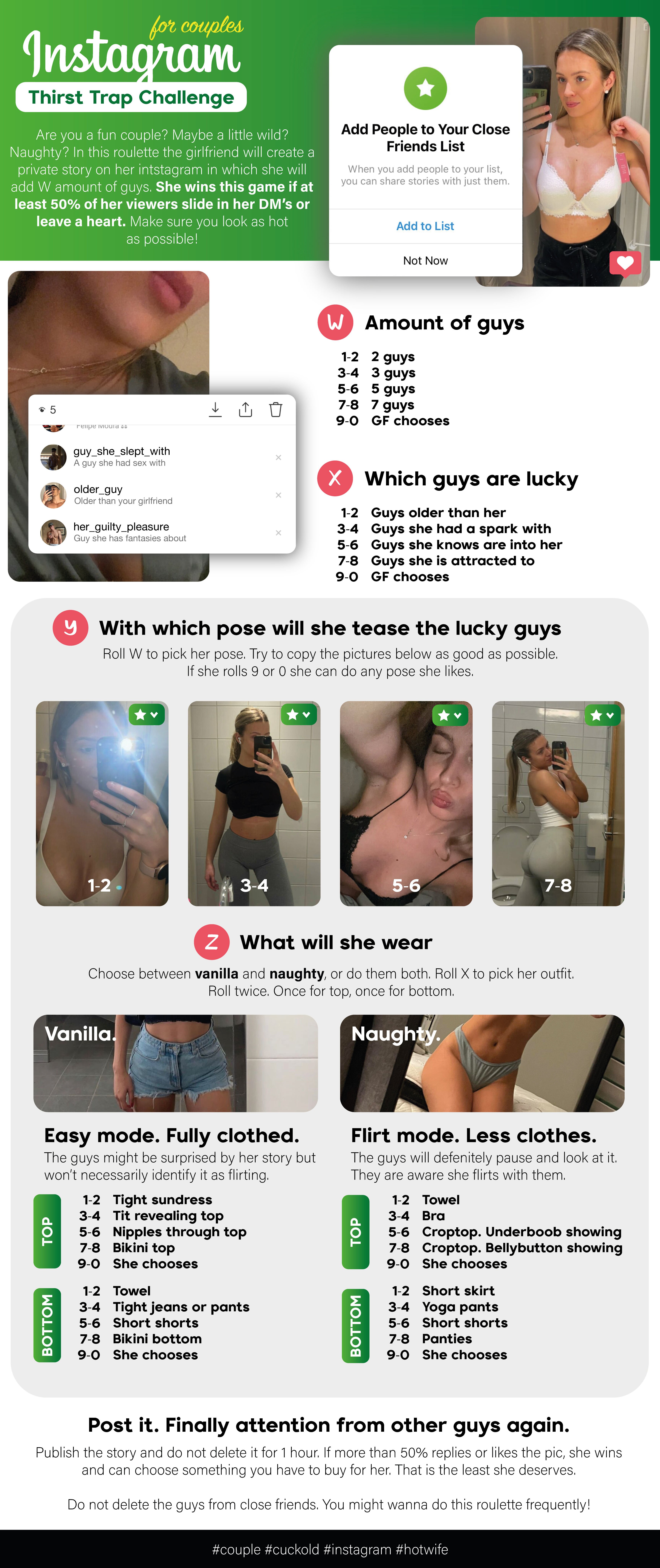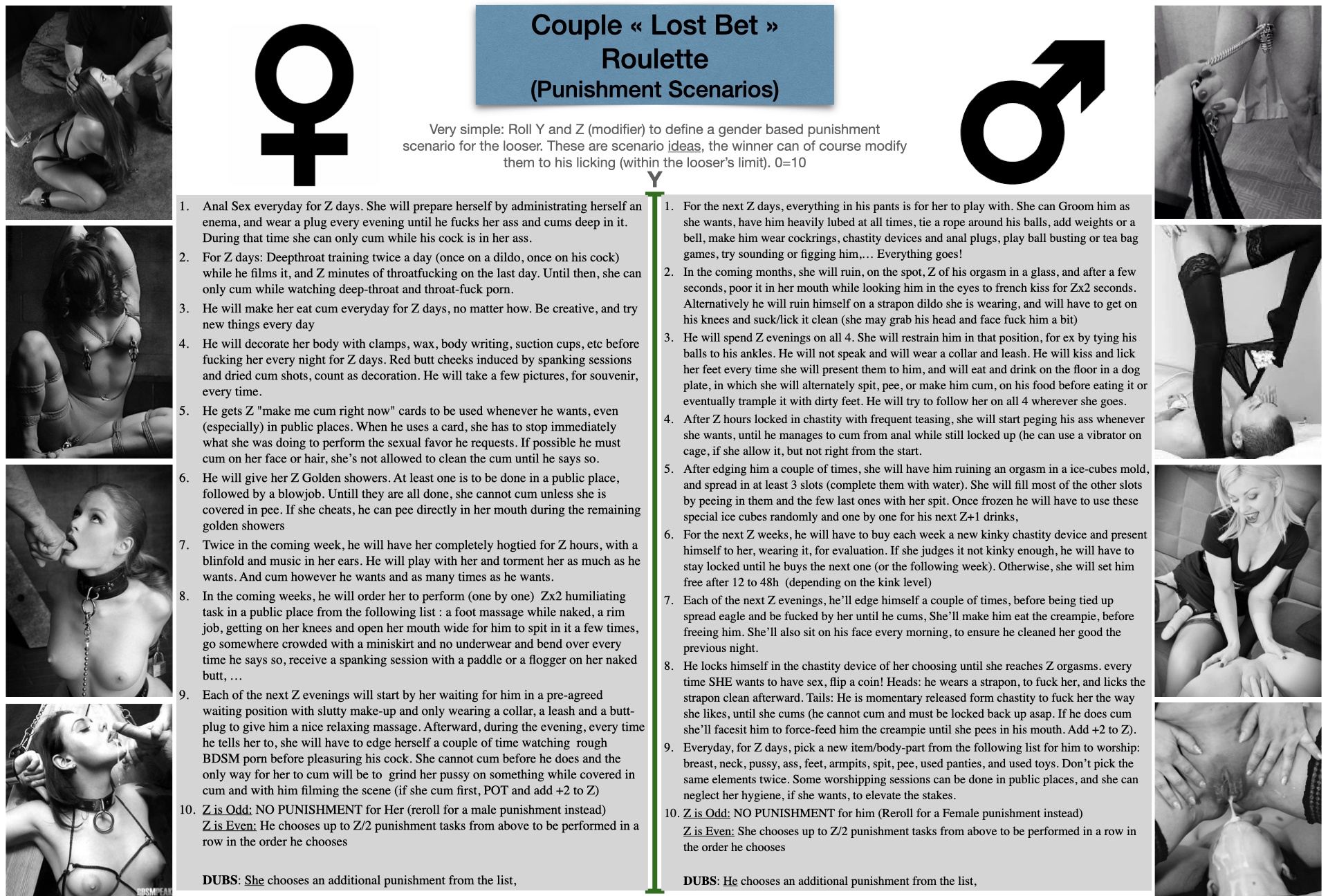 >>732638 Есть пункты "w" "x" и тд. Заходишь на рандом чисел, рандомишь одно число. То есть в каждом разделе рандомишь число и делаешь что просят. Край это означает что ты должен довести себя до края оргазма, но не кончать.