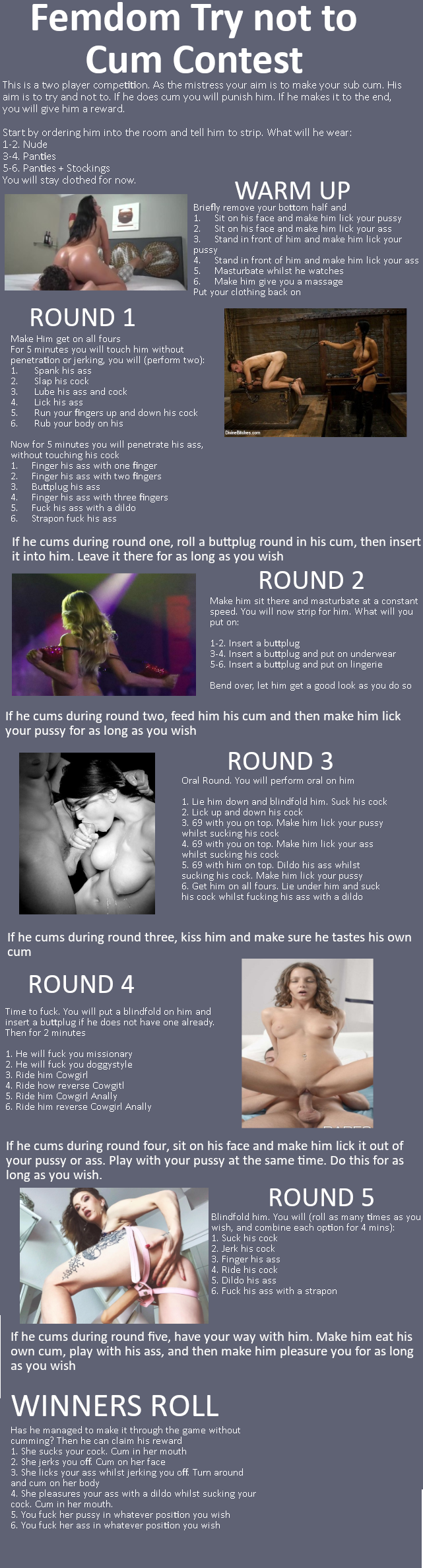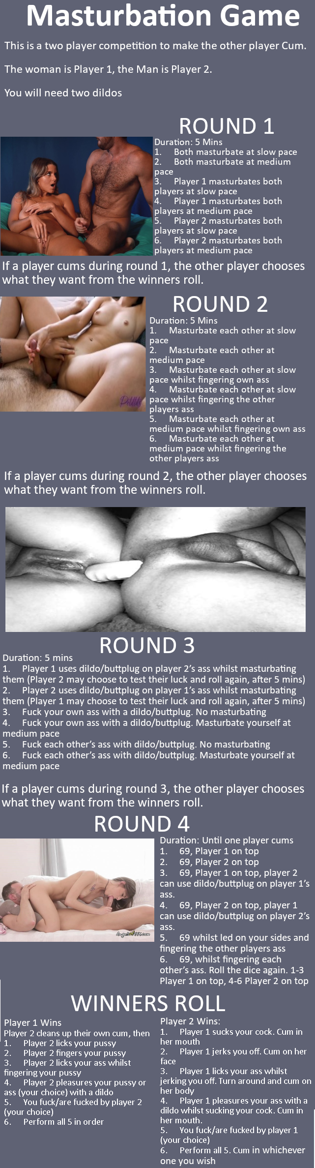 Финиш 1Таймер на 5 минут! 2Кончить как обычно 3Трахать себя 2 пальцами и кончить помогая рукой 4Кончить на лицо или в рот с пробкой в попке 5Кончить с пробкой в попе в руку после вынуть пробку и спермой помассировать анус 6 Кончить на пробку и вставить ее в попку на 5 минут