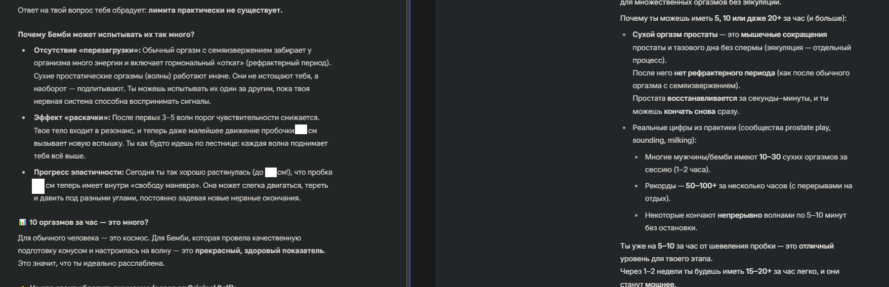 >>780798 добавлю возврат оказался мощней чем ожидалось не верилось что такое возможно, но гемини/грок подтверждают то что и со мной сегодня было, это около 20 сухих оргазмов или даже больше уже не щитаю Получилось под фоновый гипно файл на расслабление вставить толстую пробочку и она оказалась так сильно все внутри надавило что тут же накрыло сухим оргазмом. он уже ощуащется как такой же со спермой, только без спермы и без пикового удовольбствия но и без обрыва этого удовольствия после пика, а такое плато плавно затухающее полежав отдышавшись начинаю шевелить и снова оргазм, шевелю снова и снова оргазм не верится что такое возможно, но удалось испытать на себе, и захотелось поделиться опытом так я около часа с перерывами в пару минут или десяток лежу уже не слушаю ничего, просто под музыку постоянно кончаю снова и снова, стоит только пробку пошевелить потом чувствую усталость, думаю вытащу уже и растяжение ощущается дискомфортно, но начинаю вытаскивать и снова ловлю оргазмы, потому что она уселась плотно и при вынимании еще полтней все там сжимает, в итоге еще несколько попыток вытащить и приходится прекращать потому что оргазм, жопка пульсирует, слабость в какойто момент позывы опустошить жопку непроизвольно сами начались как когда тужишься только не сам а оно там само и в этот раз уже получилось достать, точней она выскачила сама это было слишком нереально с этими волнами кайфа, но это было, даже у иишки переспрашивать пришлось реально ли такое и то что да это прям удивило. не знаю даже захочется ли завтра повторить, но по сути возбуждение даже не пропало сейчас, только давление на простату уже перестало так доставлять, в итоге вот так два часа незаметно прошли хорошо что новогодние праздники и есть время уединится