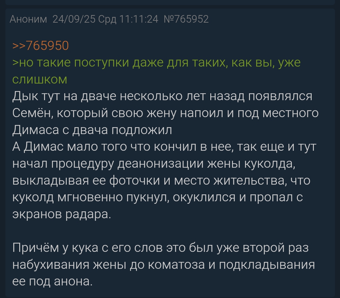 Сап, двач. Лет 5 назад познакомился с одной парой из соседнего города. Муж начинающий скуф лет 35, а жена норм, на тот момент ей было лет 25, сейчас думаю лет 30, я бы дал 8/10. Сейчас не думаю, что страшная стала. Такая типичная семья, жена до свадьбы девственница была (ну, по крайней мере мне они так сказали), а потом захотелось попробовать с кем то ещё. Примерно полгода мы общались, потом договорились о встрече, ее муж снял хату и в итоге в этот же день мы ее вдвоем трахнули (все дырки полностью рабочие), секс на 9/10. У них это был первый опыт групповухи. После этого она прям завелась идеей потрахаться ещё: звала меня в гости, предлагала её тряхнуть в машине, а муж будет рядом сидеть, но состыковать время у меня не получилось. Ещё один раз тоже договорились о встрече с ней вдвоём, без мужа (он был в командировке), я снял гостиницу уже, а накануне встречи, когда брил яйца случайно срезал папиллому. Кровь, кишки, отмена встречи. Потом я начал встречаться с девушкой в своём городе (на которой в итоге и женился), мне все ещё предлагали встречи, я соглашался, но потом постоянно что-то не получалось и в общем меня начали считать очень ненадежным (я так думаю). Я с ними долго общался, после меня они так и не смогли найти третьего и перестали в итоге искать. В браке моя жена оказалась бревном, все попытки ее расшевелить провалились, даже сосет раз в год, анала нет принципиально. Идеальный секс - ночью под одеялом, а ещё лучше вообще без него. В общем у меня возникли мысли снова выебать ту тяночку, я написал ей в ТГ, мы даже виртили немного, но я (долбоеб) проболтался, что женился и она отказалась встречаться. Это примерно год назад было. В течение года мы с ней иногда общались, по общению понял, что она вроде как не сильно горит искать кого-то. Вчера я вспомнил, что когда мы с ней общались она говорила, что фантазирует на тему того, чтобы ее трахнули двое, а муж смотрел бы со стороны, и у меня возник хитрый план: найти годного куна из ее города (Воронеж), слить ему её контакт, чтобы он попытался с ней замутить под предлогом того, что он мой хороший знакомый и я ему очень много рассказывал, какая она бестия в постели. Если у него получится, то потом снова появляюсь я с идеей мжм при её куколде. Вопросы к анону: 1) Насколько всрат мой план? Что бы анон в нем поправил, чтобы был в итоге вин и я ей снова засадил? 2) Где искать адекватного парня для воплощения плана в жизнь? Чтобы не слился и не спалил. 3) Какие подводные?