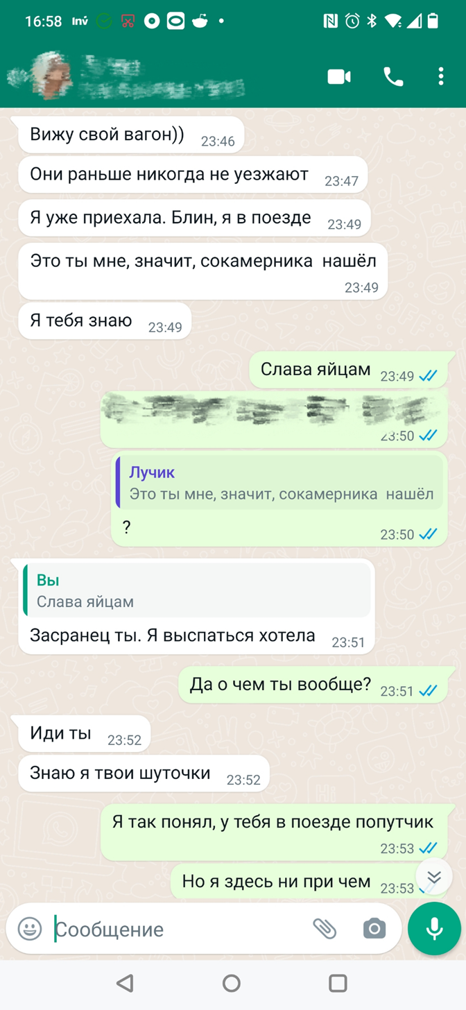 Утром получил от от супруги парочку видео, а от попутчика отзыв и голосовуху в телегу с записью первой ебли (а их за ночь состоялось две). Аудиозапись особенно доставила, так как жена не знала о том, что он пишет звук и была раскованнее, чем обычно. Конечно, она на 99% уверена в том, что это подстроил я(хотя я и отрицаю). Но ей все равно очень понравилось, о чем она мне сообщила в телеге.