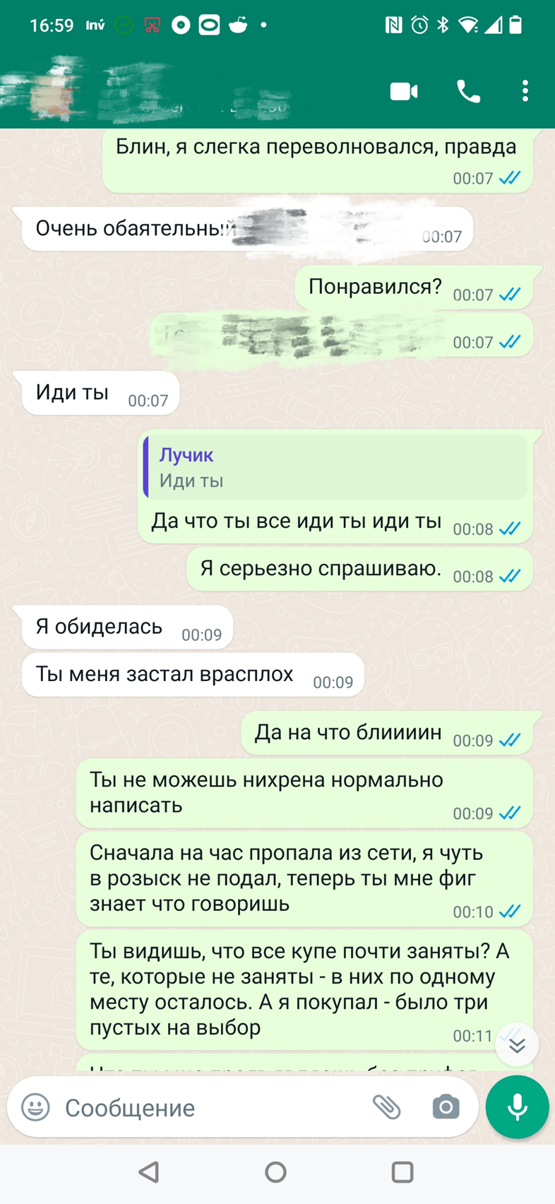 Стори №4 Пишет муж oollina (писал ранее стори №3). В понедельник моя идёт в сауну с новым мужиком. Попариться ей захотелось, лол. Из перспективного. В октябре-ноябре будет ездить на учебу в ДС каждую неделю. У нее есть фантазия о сексе в поезде с незнакомцем. Предложил ей иногда ездить в купе-СВ с покупкой билета с возможностью микса мальчик/девочка. Думаю, "подсадить" к ней разок в купе мужика, который заранее будет знать, что можно подкатить яйца к этой даме. Потому что, конечно, возможность спонтанного секса с каким-то мимохуем оцениваю как близкую к нулевой. Ну и в ДС планируем ей найти парочку любовников, чтобы ей там было не скучно после учебы поезда ждать. Или ночевать до утреннего сапсана. Через несколько месяцев: Вчера утром жена в очередной раз собиралась в дорогу и мне на сайте написал известный там человек из Москвы. Спросил, когда жена будет в Москве и что насчёт старого предложения составить ей компанию в поезде. Я ответил, что сегодня она как раз едет, и предложение в силе. Человек долго не думал, сразу предложил купить билеты, что мы и сделали. Взяли СВ в Красной стреле. Для меня это было очень спонтанно, хорошо хоть жена утром за завтраком сказала, что хочет для разнообразия прокатиться на красной стреле. Соответственно, я и объяснил покупку билета желанием ей угодить. Началось томительное ожидание. Я, конечно, нервничал. Вдруг сорвётся, вдруг она не захочет и тд и тп. К тому же вечером она встречалась в кафе с парнем, с которым познакомилась ещё летом на сайте и этот фактор вносил неопределенности. В итоге, чуть не опоздала на поезд, пришла за 5 минут до отправления. Попутчик уже сидел на измене, спрашивал, где она там...Я тоже психовал лол В общем, влетела в купе и охренела. Сидит мужик, спортивный, в ее вкусе и улыбается ей. Она сразу мне писать - типа ты мне подсадил ебаря, а я выспаться хотела!! Я, конечно, сделал ебало кирпичом, ниче не знаю, о чем вообще речь, поезд почти заполнен, вопросы ко мне надуманы, расскажи про парня, с которым знакомилась, ложись спать и отдыхай. Ну и ушел из сети. Она тоже особо не писала. Потом задал какой-то бытовой вопрос, не ответила, я ещё раз написал и через какое-то время пришёл ответ,что я ей мешаю общаться с попутчикнейм и так далее (переписку приложу). Ну я пошел, бахнул коньячку для разрядки и направился спать.