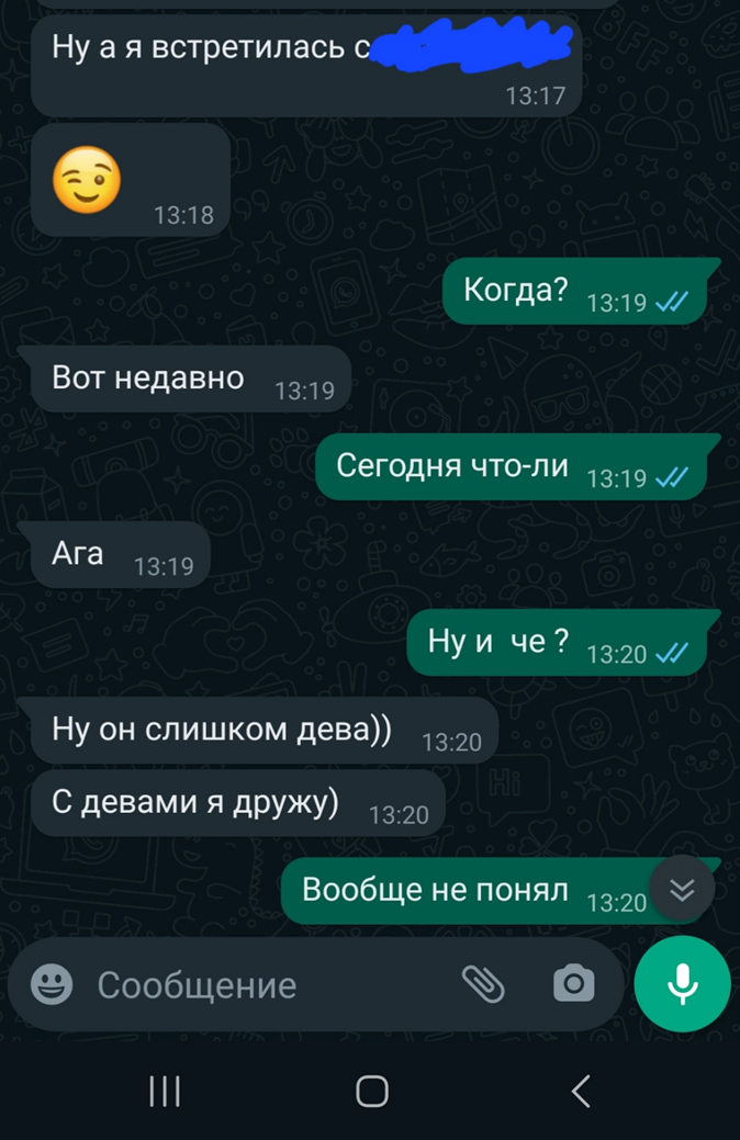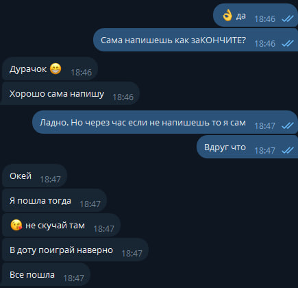 Но потом дала заднюю, сказав, что пошутила и просто знает, что такое меня возбуждает и иногда подыгрывает, и что скучает по моему члену и бла бла бла. Не знаю похоже было что искренне. А может гиперкомпенсация, хуй этих девушек поймет. Но я думаю что на резинку я её все таки продавлю)