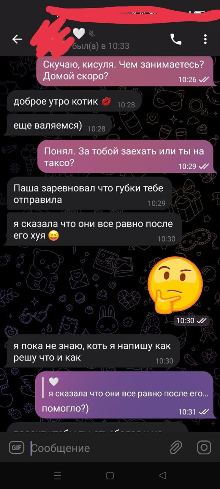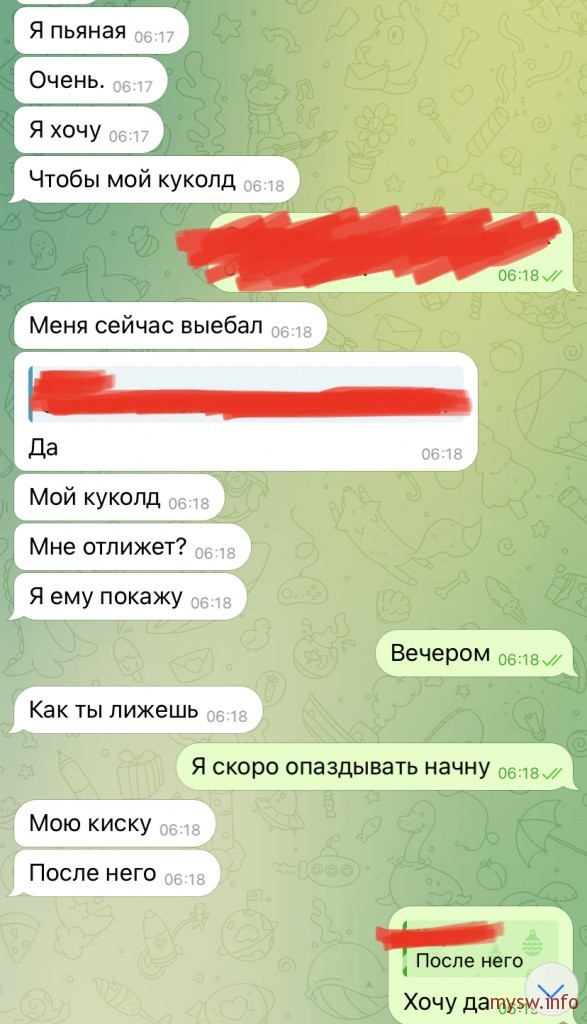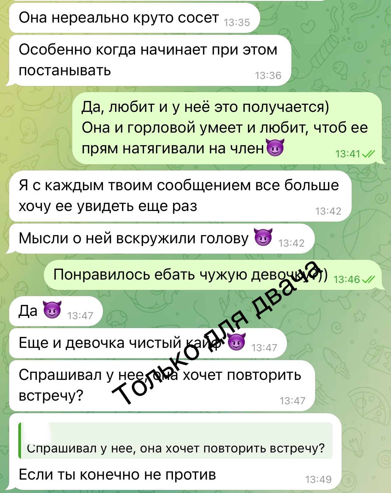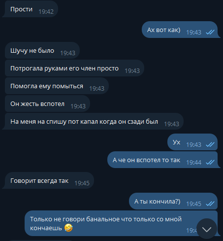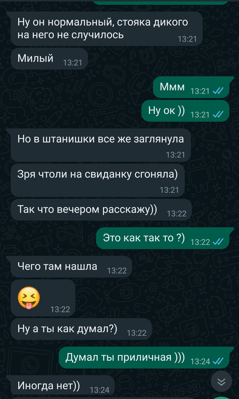 Стори №13 Пара м/ж, обоим по 30, началось все 2 года назад, когда спалил свою, что она переписывается с подкатывающими к ней челами (ей писали в инсте, кидали хуи и т.п, а она отвечала всем этим челам, с кем-то даже флиртила). Тогда закатил ей скандал, я уже был готов на развод, но пошли вместе к мозгоправу, который каким-то образом выправил всю ситуацию и мне стало на тот случай мягко говоря похуй, а если не мягко говоря - меня это стало даже заводить. По совету псехолуха все моменты связанные с секусуальной активностью начали обсуждать без осуждения, моя созналась, что ей нравится мужское внимание, когда к ней яйца подкатывают, особенно в реале, с моей же стороны я честно признался, что хоть меня в моменте когда я спалил ее переписки и у плачущей вырвал телефон и начал читать ее переписки, я пиздец как сгорел, но пока читал - у меня нихерово так привстал. По итогу решили, что я ей не буду мешать принимать внимание мужчин, а она в обмен на это будет со мной обсуждать каждый такой случай.