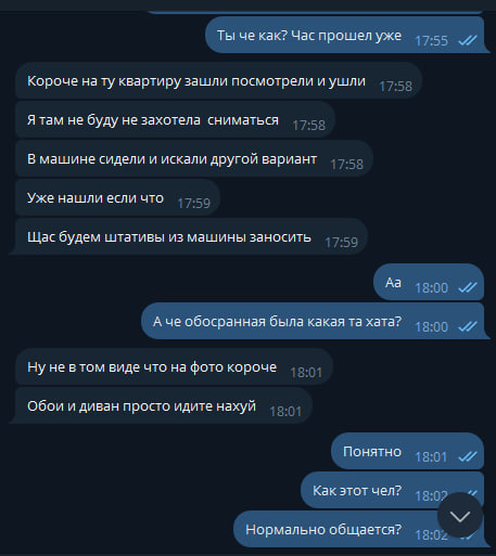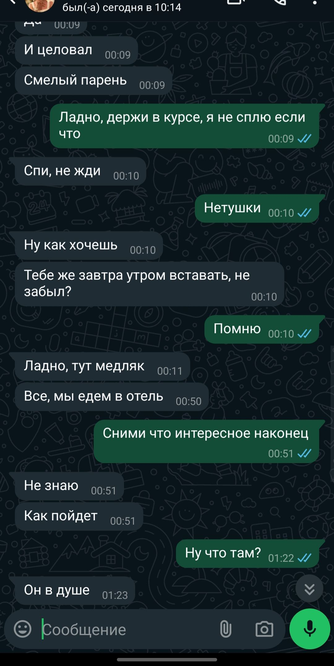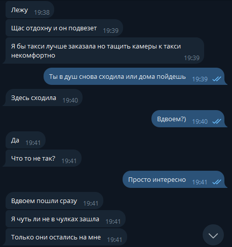 Пока ехали назад ее расспросил все ли норм, сказала что норм, ничего страшного не случилось, но ну их кавказоидов нахер. Выпытывал что мог из нее все эти дни по чуть чуть. делиться откровениями не особо желала и наверняка чтото не договорила.