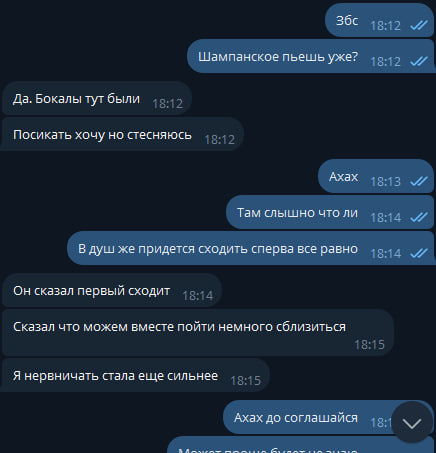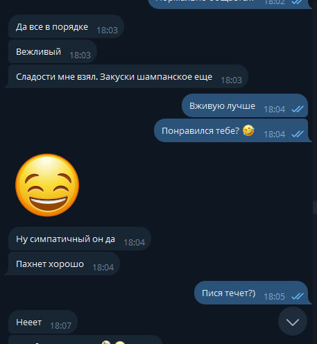 Переломным моментом стал корпорат. Моя работает в относительно небольшой логистической компании, грузы-хуюзы, коллектив в основном бабский, но как водится в таких коллективах - заведует всем кабанчик-капиталист. В общем после одного из корпоратов, моя, как мы и договаривались, рассказала, что этот самый кабанчик весь корпорат подкатывал к ней яйца, пытался как-то подсесть поближе, приобнять, позвал даже на медляк (и мне, и ей этот мув отдал каким-то школярством, но ей это польстило), в конце вызвал ей такси. Как итог - он начал ей написывать в инсту и пытаться флиртовать. Мы начали использовать и эту переписку для секса. Сказать что я кончал радугой в процессе, ничего не сказать... Где-то через месяц флирта кабанчик позвал мою на свидание (хоть и знал, что она замужем), и ей и мне идея понравилась, но договорились, что будет без интима.