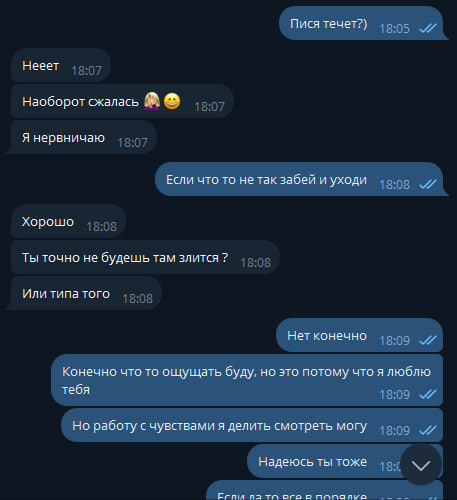 Не смотря ни на что, у нас охуенные отношения, мне очень всё нравится, хотя местами конечно бывает неуютно но я понимаю, что без этого никак. Няша тоже кайфует от этого, говорила, что очень боялась всего этого сначала хоть и было интересно, но рада, что я развеял все её страхи. (Например она очень стеснялась того, что влюбилась в своего постоянного ебаря, и боясь мне это сказать думая, что я пойму не правильно. Но я наоборот её поддержал, успокоил, что во влюбленности нет ничего такого и что если она ко мне тоже имеет чувства и хочет быть и со мной и сним я буду только за. )