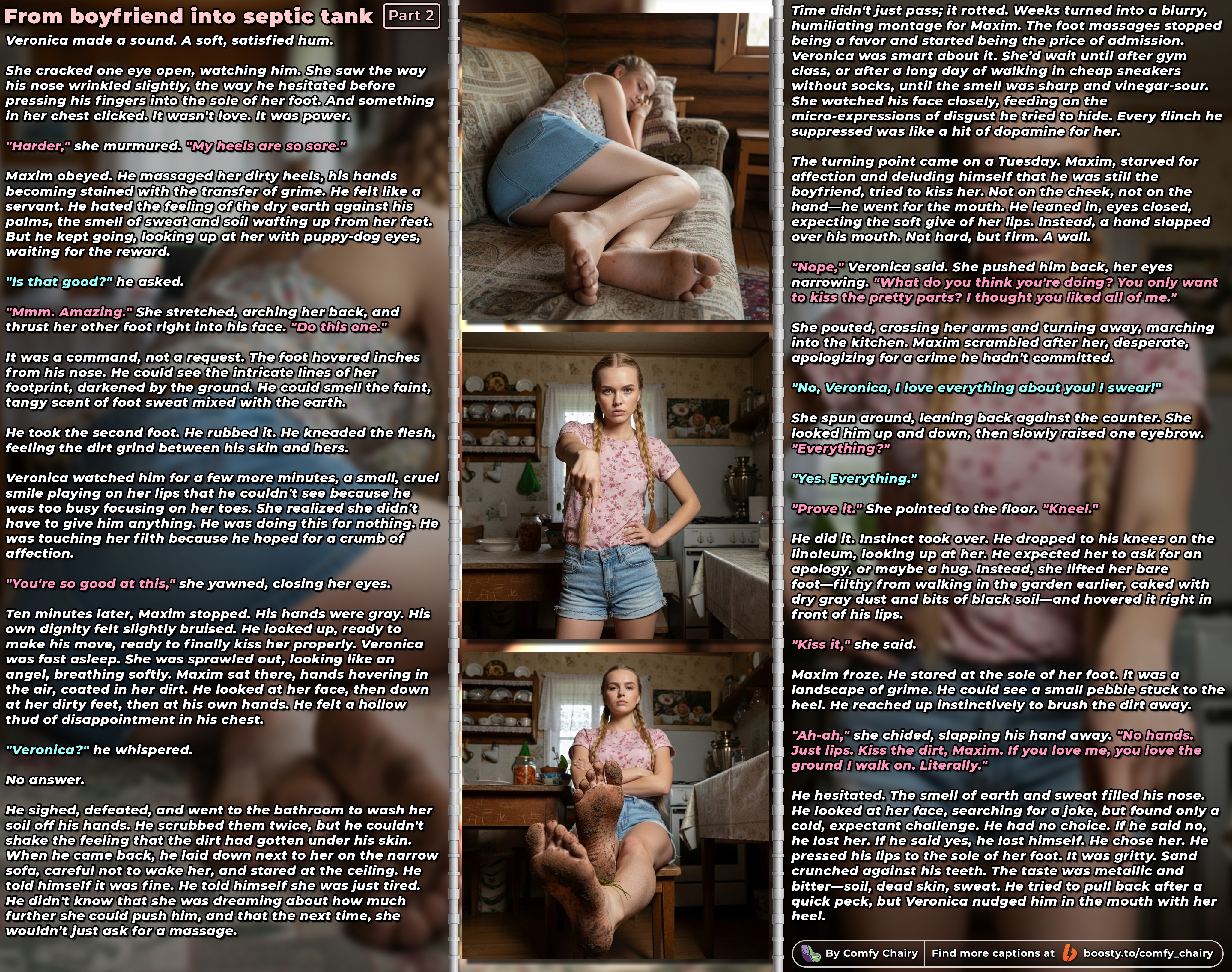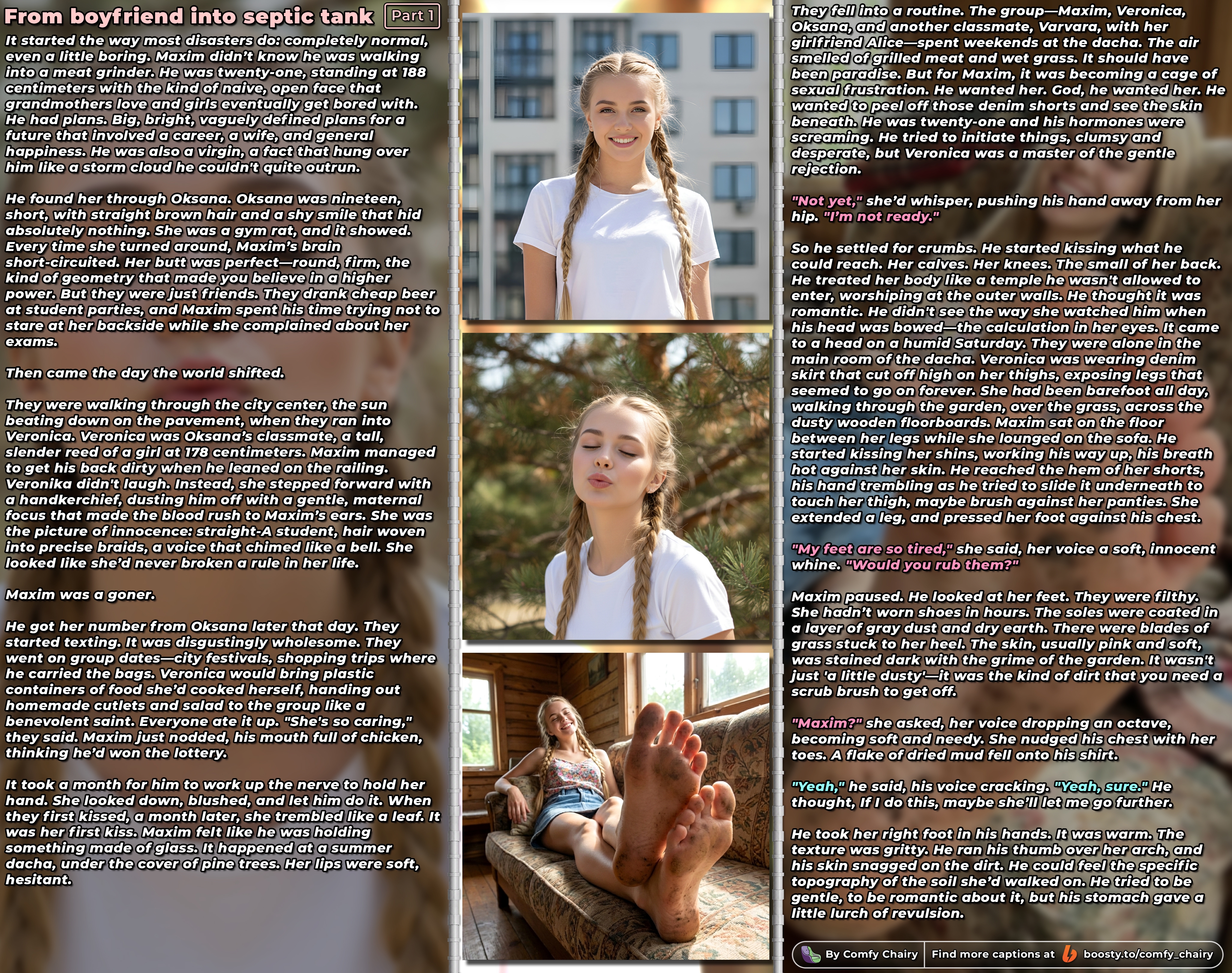 >>792541 (OP) Прошлым летом случайно в дайвинчике познакомился с милфой около-доминой. Просто скроллил ленту в поисках пухлотян на поебаться и нашел золото. И да, дама будет на любителя, так что кто не любит тянок с жирком, можете дальше не читать. У нее в анкете было заявлено 42, а по факту там все 52 были, но весьма сочная, большая грудь и жопа. Про фемдом, бдсм и прочие практики было ни слова. Прилетел ответный лайк, начали общаться и через пару часов общения дошли до обсуждения сексов ну и она спалилась что немного угарает по фемдому. У нее было пара молодых мальчиков которых она страпонила и не только без регистрации и смс (тобишь бесплатно), но искала чего-то большего а не просто сессии. Tl;dr. Общались пару недель ненапряжно без виртов и нюдсов один раз жопу и ножки скинула, собирались встретится на нейтральной территории типа бара, кафешки, парка. Но неожиданно встретились у нее дома, ей надо было поставить новый кран на кухне и передвинуть мебель в комнате. Сексы не обсуждали, максимум договорились на чай и массаж без продолжения. В тот день была терпимая жара, а у нее кондей был только в спальне, а работы проводились на кухне и в зале. Встретила меня в каком то домашнем платье в обтяжку, что стринги на жопе прям выпирали под ним. Ирл выглядела лучше чем на фотках и это без мейка. Оперативно поставил кран, с мебелью возились часа 2, оба взмокли, ловил стояк с ее жопы каждые 5 минут. Довольно неплохо общались на разные темы и про сексы тоже. Tl;dr. В качестве вознаграждения налила мне водички и потребовала массаж спины, шеи, ножек. Ноги мне были не очень интересны, не футфетишист, а вот когда пошла спина и жопа, то шишка в космос улетела. Потребовала вылизать ножки, я сказал, что они грязные и не хочу, а она, что моего мнения не спрашивали и давай вылизывай чтобы чистыми были. Начал полировать их, а она стонать, ну такое, не очень люблю это дело но иногда могу, ножки красивые были +педикюр. После ног опросил у нее чего нит на десерт намекая на жопа, она как раз лежала на животе, разрешила но только язык и лизать пока не скажет стоп. Спустил с нее трсы, а они были мокрыми то ли от пота то ли от смазки, то ли от того и другого. Жопа вся в мыле была, лизал как пес, она там еще приговаривала всякие "колхозные" фразы и рукой себе вареник теребила. Минут 5 вылизывал ее потную жопу, язык просто проваливался туда, потребовала остановится, перевернулась на спину, раздвинула ноги и скомандовала лизать. А там были светлые заросли как я люблю, хотя анус гладким под ноль.Уже не 5 минут нализывал и более активно, плюс она вдавливала мое лицо в своей вареник, сжимала ногами и продолжала dirty talk. И так пока не кончила, не сквирт но лицо было мокрым. Отправила меня умываться и попить. Потом сама сходила в уборную. Вышла, швырнула в меня своими трусиками и сказала что она пописала не снимая их и разрешает мне забрать с собой, и что я должен ее вылизать после туалета. А мне как-то не очень хотелось и не был готов (хотя зд нравится), но она скомандовала лечь и принять ее на лицо. Ну в общем было вкусно, но охуел с ее прыти, лицо все красное потом было. Просил ее мне отсосать или хотябы подрочить, но она отказывала, а хуй там через шорты рвался наружу. После того как кончила, дала мне поласкать ее грудь, которую я еще и не видел. И вот только тогда она "подрочила" мне через шорты, просто наглаживала стояк пока 