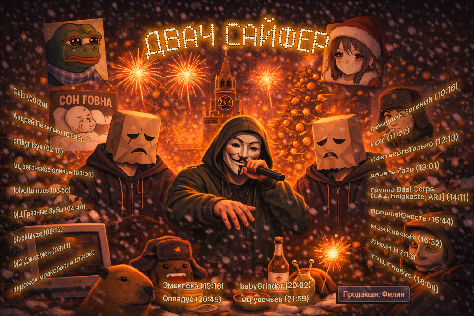 Правила: 1. Каждый месяц 1 числа, путём роллинга в /b выбираются 2 темы; 1.1 (Первый дабл и первый трипл); 1.2 ((Темы нарушающие закон и правила Двача - не принимаются)); 2. С 20 по 25 число идёт голосавние в треде; 2.1 (Не проголосовал, твой трек не участвует); 3. Для идентификации ставим трипкод; Трипкод ставится так: В поле "Имя" пишешь: Имя#Пароль Пример: Пекулин#qwerty123 ТРИПКОД НУЖЕН ТОЛЬКО ДЛЯ ИДЕНТИФИКАЦИИ ТРЕКОВ И ГОЛОСОВ. Не бухтеть. Можете в остальных случаях постить как аноним. 4. Сдача трека происходит в формате видеофайла .mp4 или .webm; 5. Голосование происходит в треде в виде поста, посредством знака "+"; По типу: ... АНДРЕЙ ПЕ + Козочка МС малый Магнитогорск lil pikyli + Андрюха ... 6. Срок сдачи с 1 по 19 число; 7. Леваки, виртуалы, огроничение по времени, ИИ, фиты и т.д регулируются путём голосования за трек. Де-юре границ по данным пунктам нет. Де-факто решает совокупность анонов. 0. Участникам запрещено нарушать законы РФ, либо другого государства-места проживания участника и правила Двача.