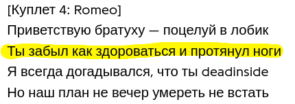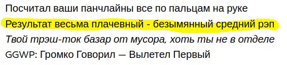 >>1019600 Я НЕ СТАЛ РАСПИСЫВАТЬ ЗА БАЛАКОВО, НО ЕСЛИ УЖ НА ТО ПОШЛО, ТО НУЖНО ПОНИМАТЬ, ЧТО ЗА РИФМАМИ ДОЛЖЕН СКРЫВАТЬСЯ И ПОСЫЛ И СТИЛЬ И ТРЕК ДОЛЖЕН РЕЗОНИРОВАТЬ, У БАЛАКОВО ПОКАМЕСТ ПОЛУЧАЕТСЯ В МОЕЙ ТОНКОЙ ДУШЕВНОЙ ОРГАНИЗАЦИИ ВЫЗВАТЬ НОТКИ ПЕРВОБЫТНОГО КАЙФА, ЧЕГО НЕ ОЖИДАЕШЬ ОТ ТРЕТЬЕСОРТНОГО БАТТЛА