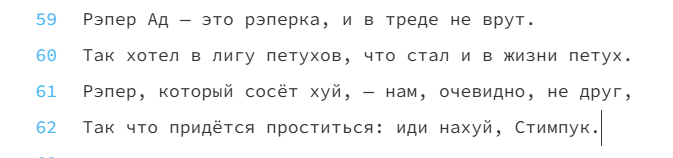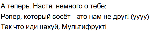 Как будто выдавливая глитер, он сжимает бабкин клитор, Та читает про крытый и внутренний туризм, Уровень уже не тот, конечно, но, если упомянуть «физкультурника», Даже дохлый петух вдруг запахнет курником. Так что продолжаем акт половой экзекуции, Хоть бабка и выдает реп все более куцый Пассаж про велосипед — это вообще что такое? У тебя синдром главного героя, ты че Мориц Хлоя? И так далее по списку, как бы он не возводил каргу в культ, пихая в неё письку, Как бы не ждал хоть один нормальный прогон, Реп источник иссяк, ведь его самый лучший компаньон Умер, И хоть карго культ вокруг половой ебли бабули построил этот кумер, он не учел одного: его дед был реальный мужик, а не сына-корзина, И за репом с бабкой надо ехать в Геленджик, где армяне потеют протеином Но вышло, что вышло, карго культ проиграл с бабкой схватку, потерял хватку Так и не понял, что такие, как он всратки, способны только на беззубый абстракт, а Пизда течет вкуснее, когда лижешь нежнее, Это все, что я в принципе могу сказать по теме, но Бро, просто представь какое ты невыразительное фуфло, Если мне пришлось все это выдумывать, твой реп иссохший, как мумия. Покуда папуасы строят из кожурок ананаса, В полную величину, ну то есть один к одному, Модель ракеты НАСА, карго ебашит массу из каракуль букв репосодержащую Ни одной яркой строчки, тупа бубнеж в бочку, При этом гонору, как у Горгоны в саду камней, читаешь «тратить время на бездарность не хватало» Окей, но почему тогда ты вообще пишешь реп, ведь Единственное, что в тебе хоть как-то цепляет взгляд, Это то, что ты трусливей стаи цыплят, Раз решил отфлипать тойоту, Господи блять, не сомневаюсь ни на йоту, что у тебя пожизненный соевый паёк, и коль твой крысиный проёб это самое смелое, что есть в твоем тексте, то когда ты пишешь «обнял», то считаешь, что секстишь Короче, ауешник комнатный, желаю fart твоему рту, то бишь в него пержу, можешь сделать оммаж на каждую мою букву, только сразу говно размажь по своим губам пухлым. Пидорасня ебананая.