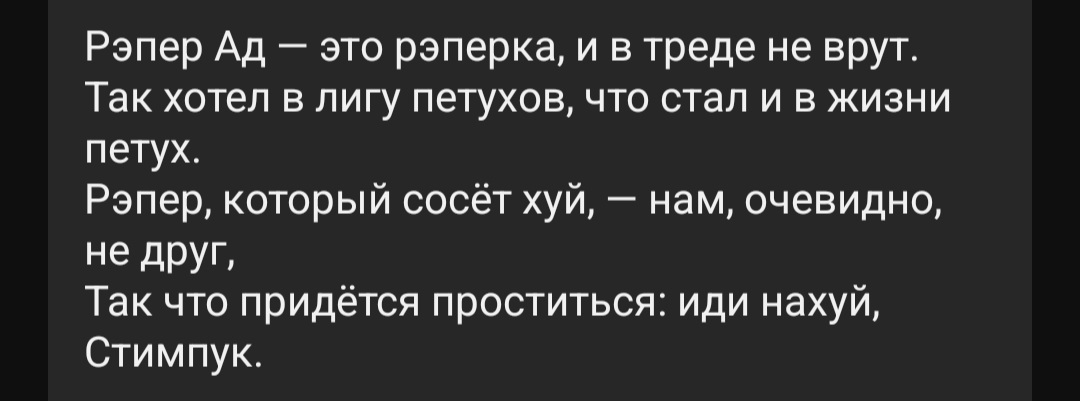 Если завтра батя стимпука даст дуба, То тот через пару минут трек в тред зальёт с автотюном Режущим ухо под грустный биток размышляя о суммах Что потратил на труп он И приступе, суке, что вроде бы друг, но обернулся недугом, И дальше особо не думая, на стримчик донаты подрубит доить залетух