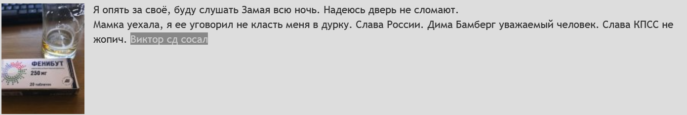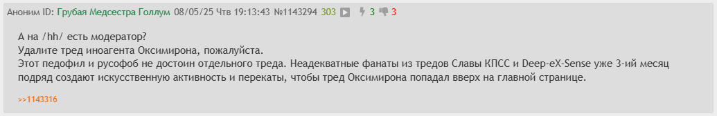 >>1023263 >>1023294 Хуйню не несите, детективы недоделанные. Здесь остались только его хейтеры и вы - залётные бомжи с ДРИ. Фаны отсиживаются в тгк пикмих и группи с низкой социальной ответственностью, всё ждут не дождутся высера своего божка. Уже любого мимохода-анона говном поливайте. Мамке своей будешь доказывать, что двач не для неё. Оксич терпит и вы потерпите.
